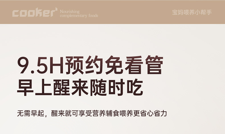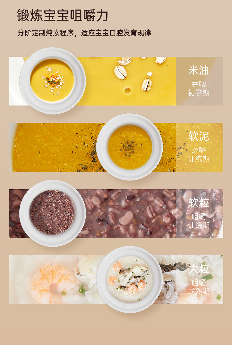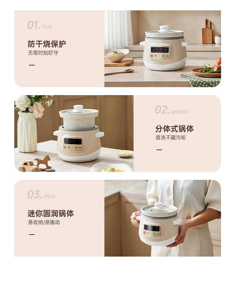 额定功率:120W 额定电压:220V 产品颜色:少女粉粉/天空蓝蓝/魅力杏 主机容量:1L 产品款式:微电脑智能 包装清单:主机、透明盖、蒸格、电源线、说明书 特色功能 1、智能免看管;可视化锅盖,白瓷内胆; 2、6大功能,可预约定时;铝锅发热盘,导热快; 3、PP防烫把手,防止防烫双手; 4、自动断电,防干烧功能;一机多用;