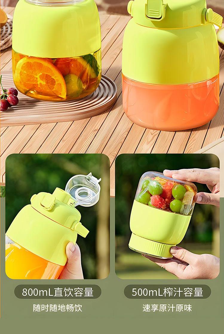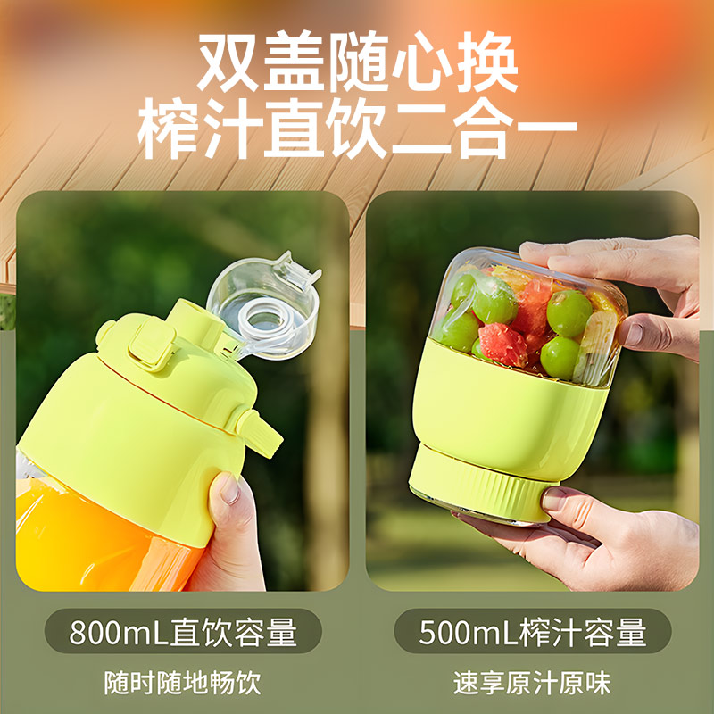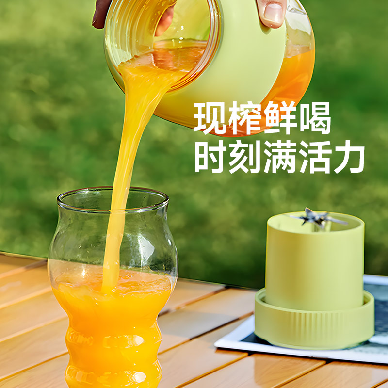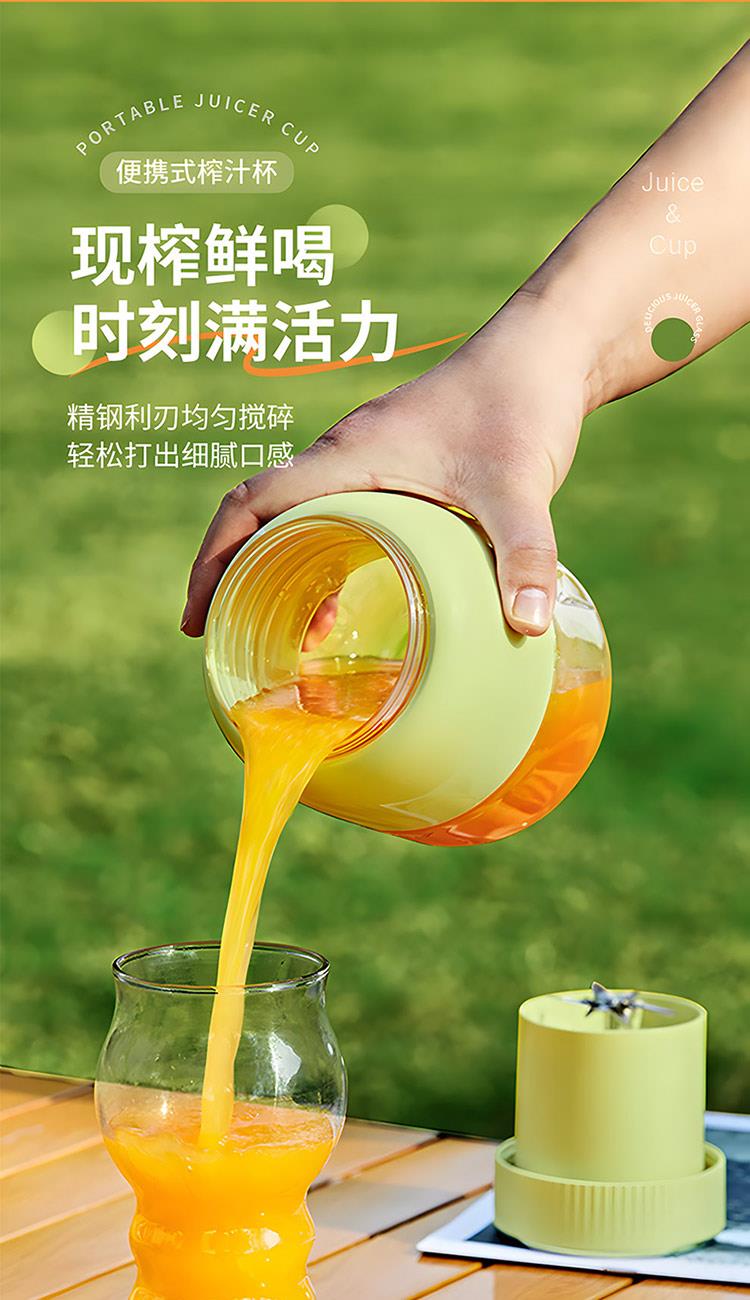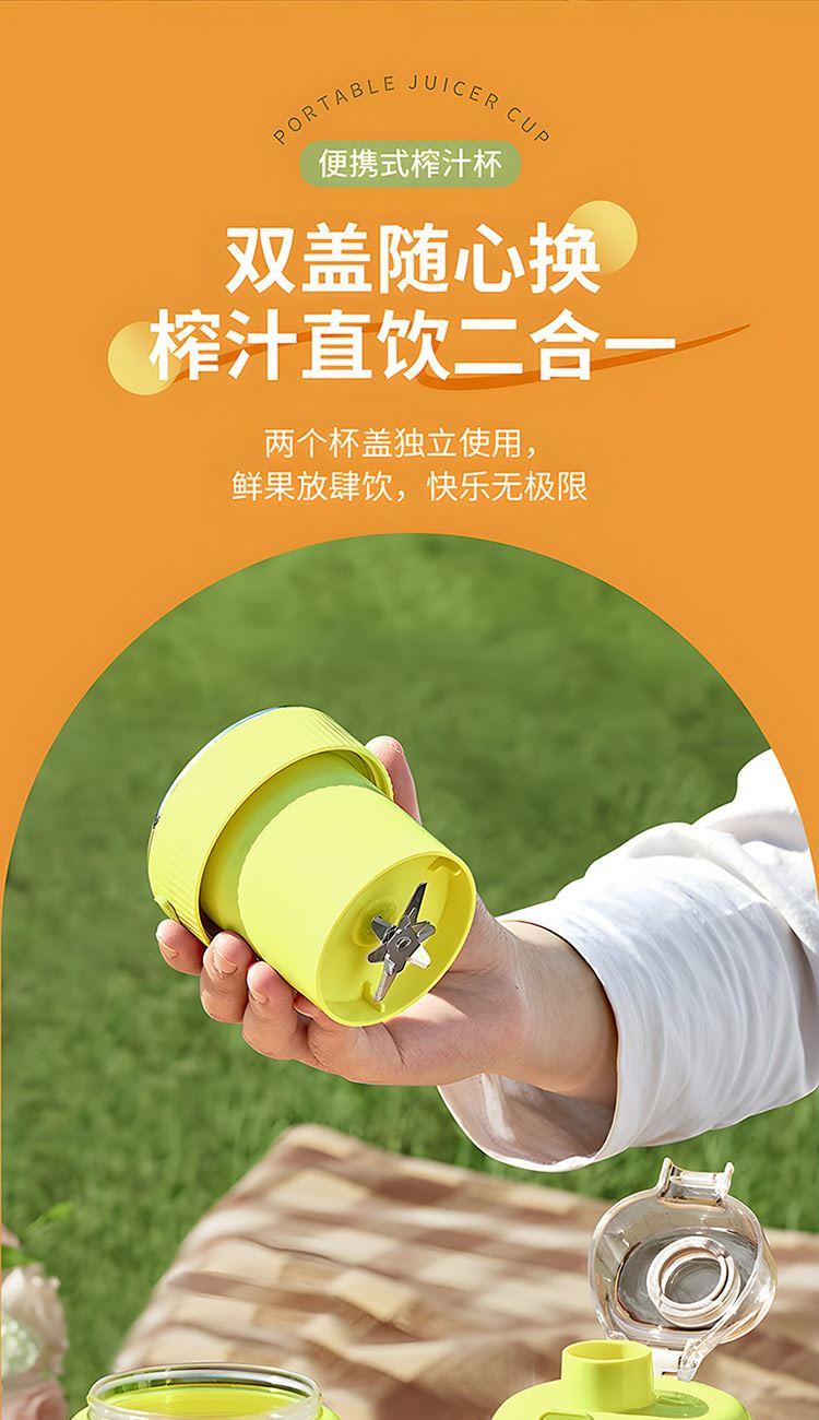 产品功率:50W 榨汁容量:0.5L 直饮容量:0.8L 电池电压:3.7V 输入电压:5V 额定电压:220V 产品尺寸:205*230*430mm 包装方式:提手彩盒+邮箱 ● 双盖随心换榨汁直饮二合一。 ● 800ml大肚量,畅享不续杯,专属水分补给站。 ● 现榨鲜喝,精钢利刃均匀搅碎,打出细腻口感。 ● 20叶精钢刀头,搭载强劲电机。 ● 50W强劲动力,Type-C快充。 ● 2600mAh,大电量续航。 ● mini便携提手,随shi出发,轻盈起飞
