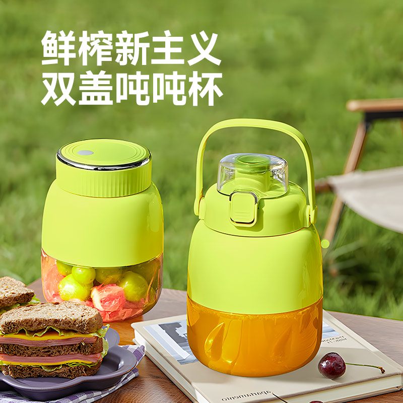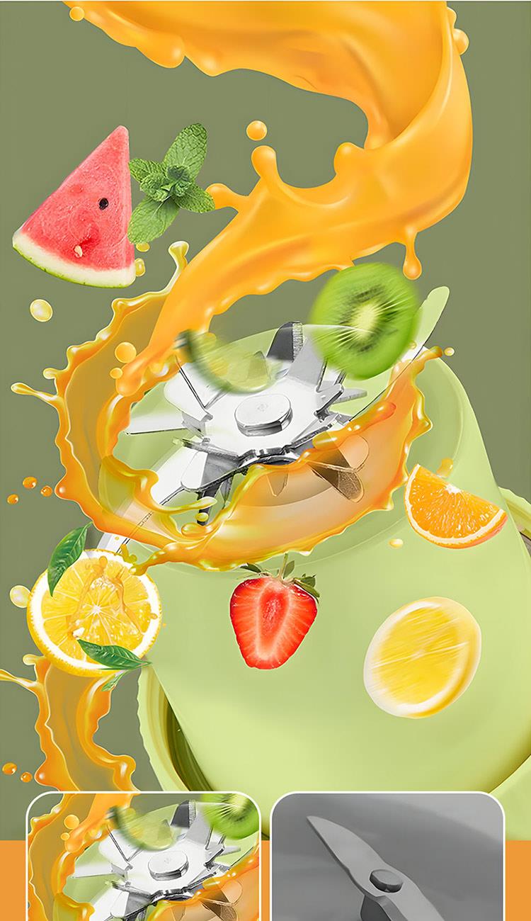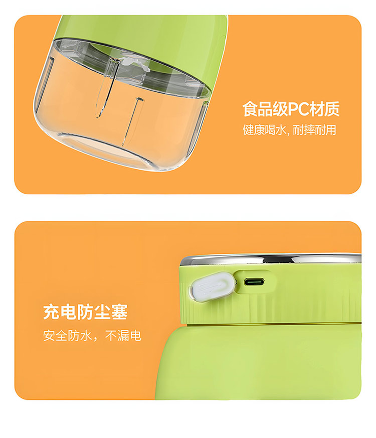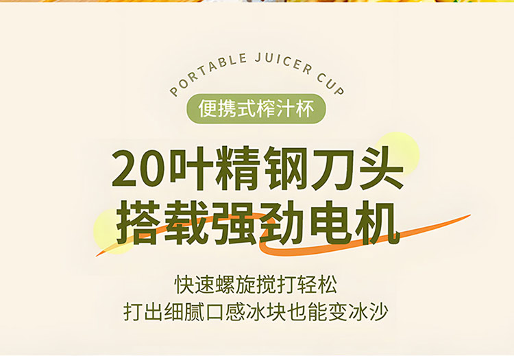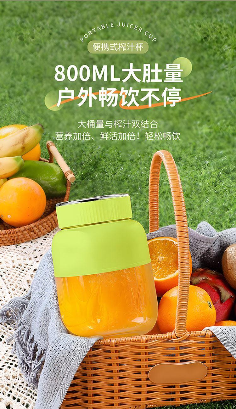 产品功率:50W 榨汁容量:0.5L 直饮容量:0.8L 电池电压:3.7V 输入电压:5V 额定电压:220V 产品尺寸:205*230*430mm 包装方式:提手彩盒+邮箱 ● 双盖随心换榨汁直饮二合一。 ● 800ml大肚量,畅享不续杯,专属水分补给站。 ● 现榨鲜喝,精钢利刃均匀搅碎,打出细腻口感。 ● 20叶精钢刀头,搭载强劲电机。 ● 50W强劲动力,Type-C快充。 ● 2600mAh,大电量续航。 ● mini便携提手,随shi出发,轻盈起飞