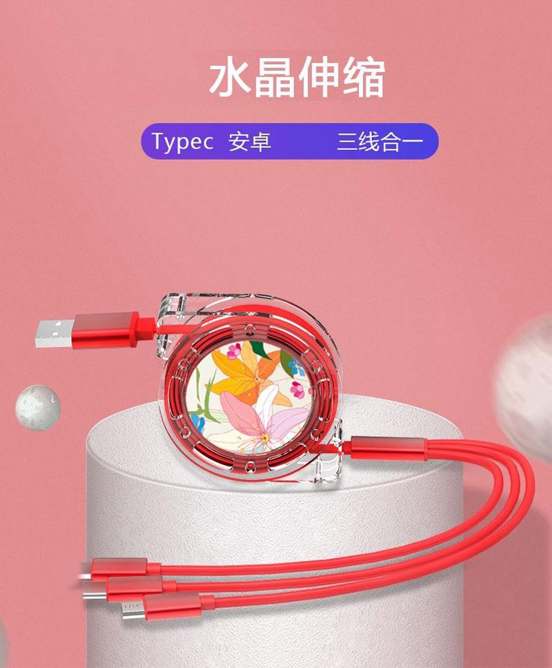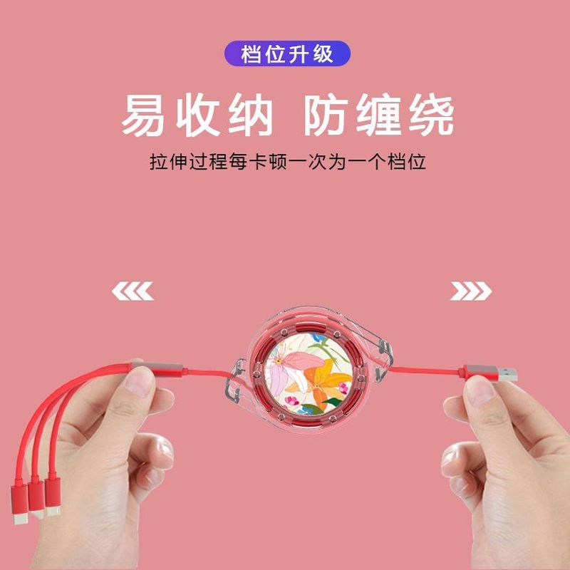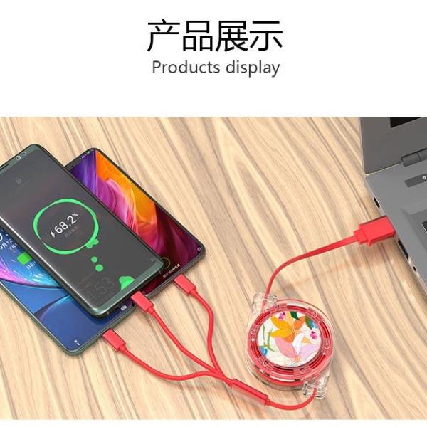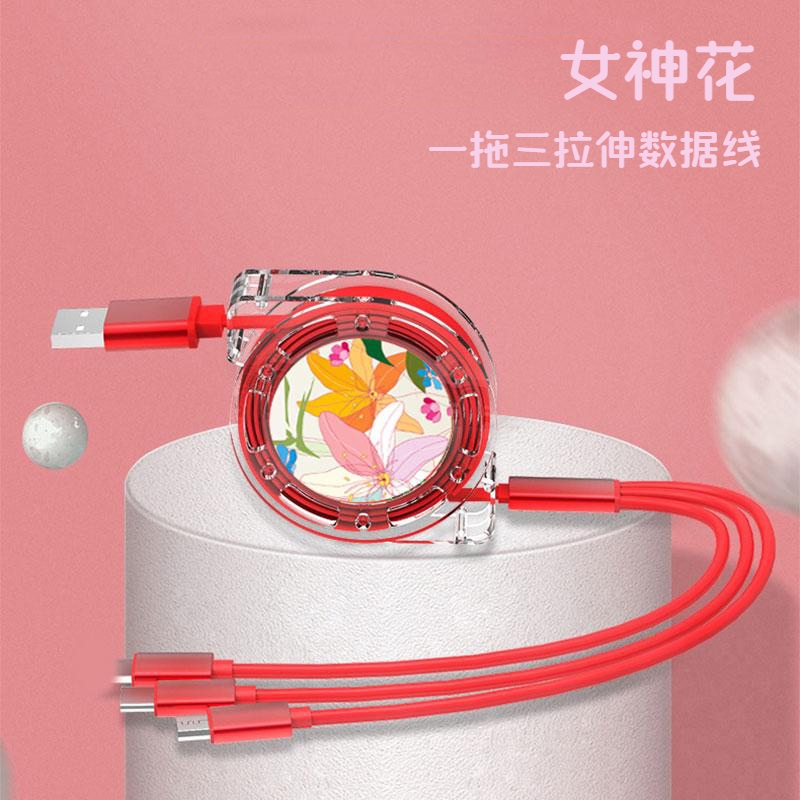 数据线长度:120cm 分线接头数量:一托三 颜色:红色 材料:硅胶+铝金合头 适用机型:苹果/安卓/Type-C • 一拖三数据线:可充电任何手机,数码设备接口。 • 自由伸缩,小巧便携 • 正面财神,背面可定制LOGO宣传 • 经济实用性价比高 出货速度快