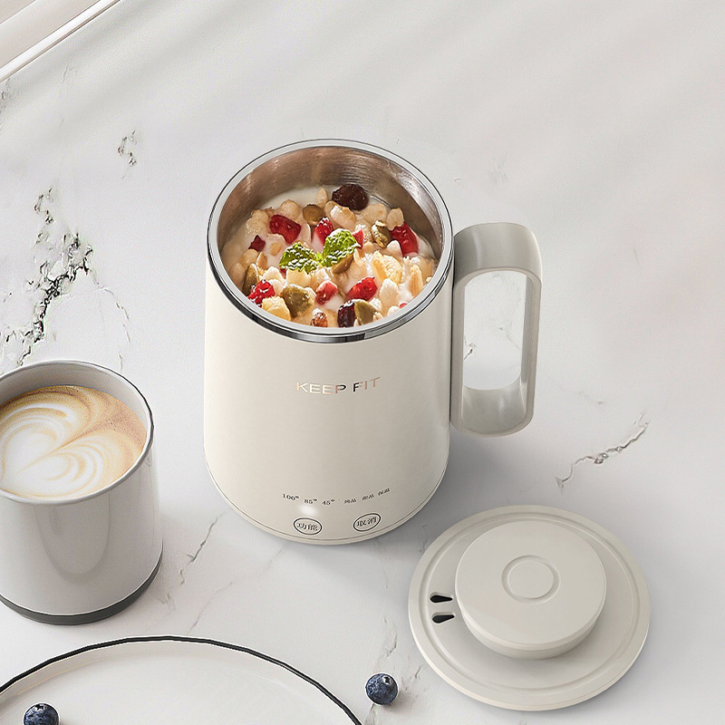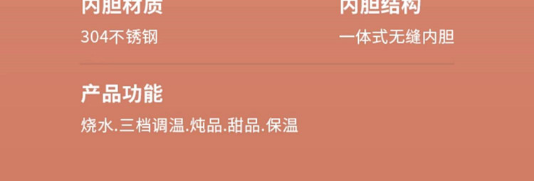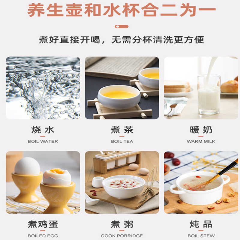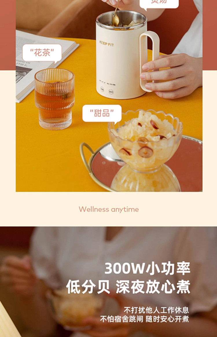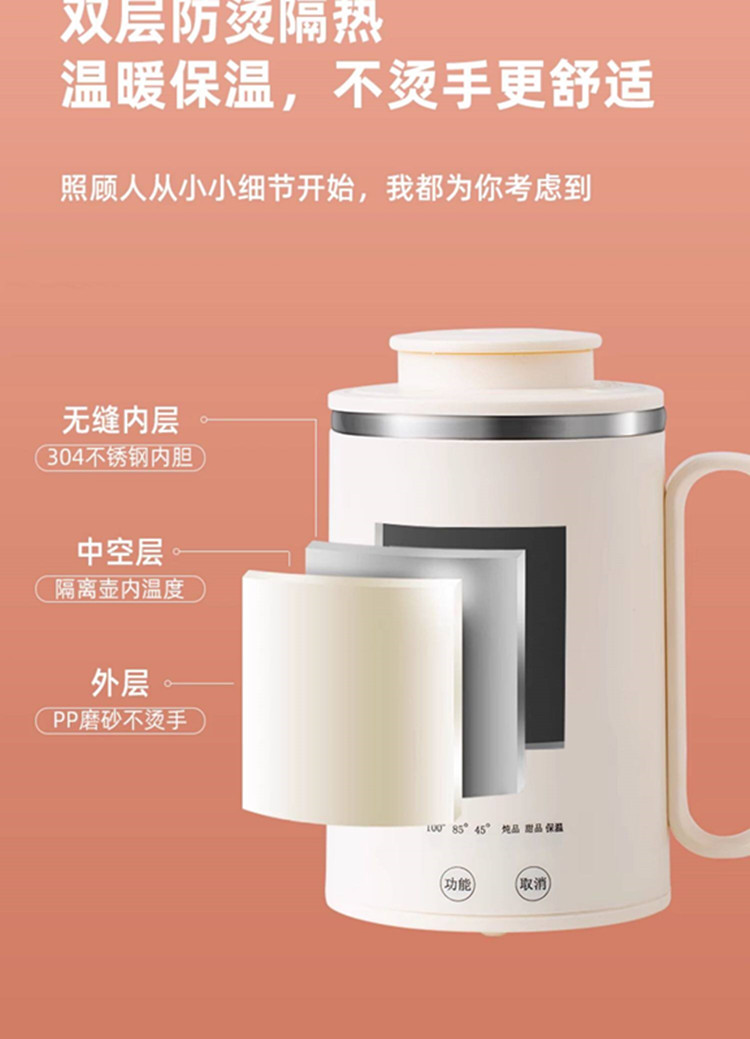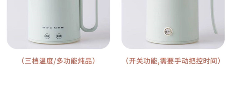 额定功率:300W 额定电压:220V 产品颜色:元气绿/樱花粉/象牙白 产品容量:400ML 产品款式:智能款 礼盒包装 包装清单:主机、滤网、电源线、说明书、礼盒、玻璃盖 包装尺寸:13*13*17.5(cm) 特色功能 1、食品级食品可接触304不锈钢内胆 耐腐蚀材质 2、携带方便,出行好伴侣,轻巧实用颜值高 3、机械款方便操作,即插即用人体工程学 4、温度随意调节,45-85-100°;舒适提手,细密滤网,透气盖口 5、电热杯/水杯二合一,三挡水温