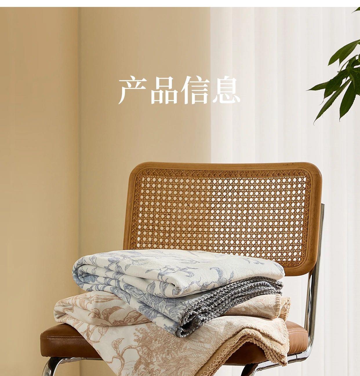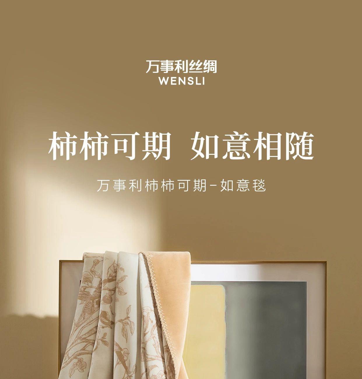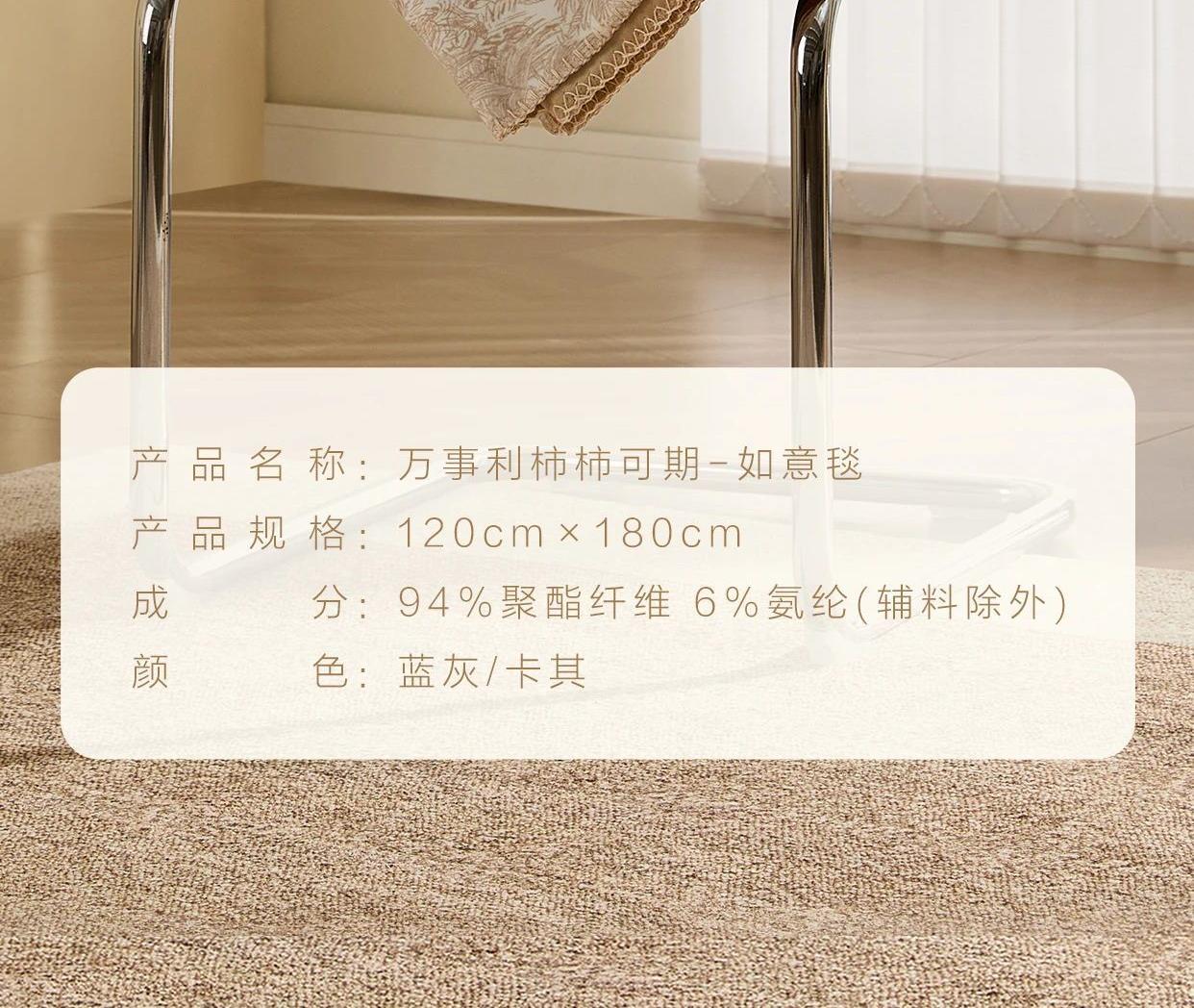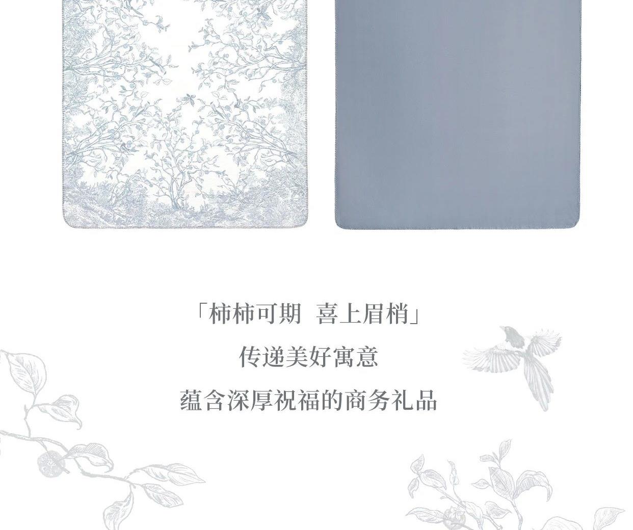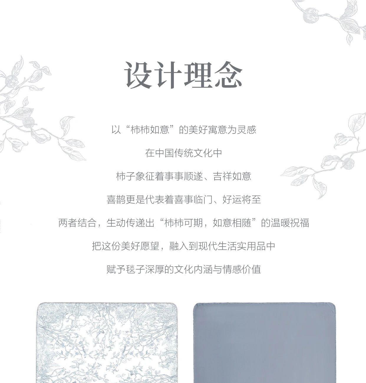 万事利柿柿可期一如意毯 产品规格:120cm×180cm 成分:94%聚酯纤维6%氨纶(辅料除外) 颜色:蓝灰/卡其