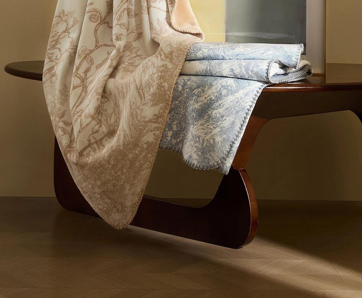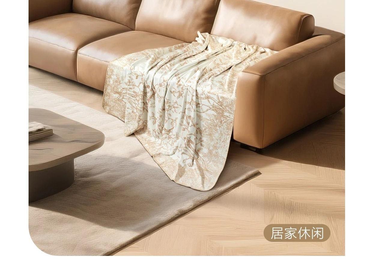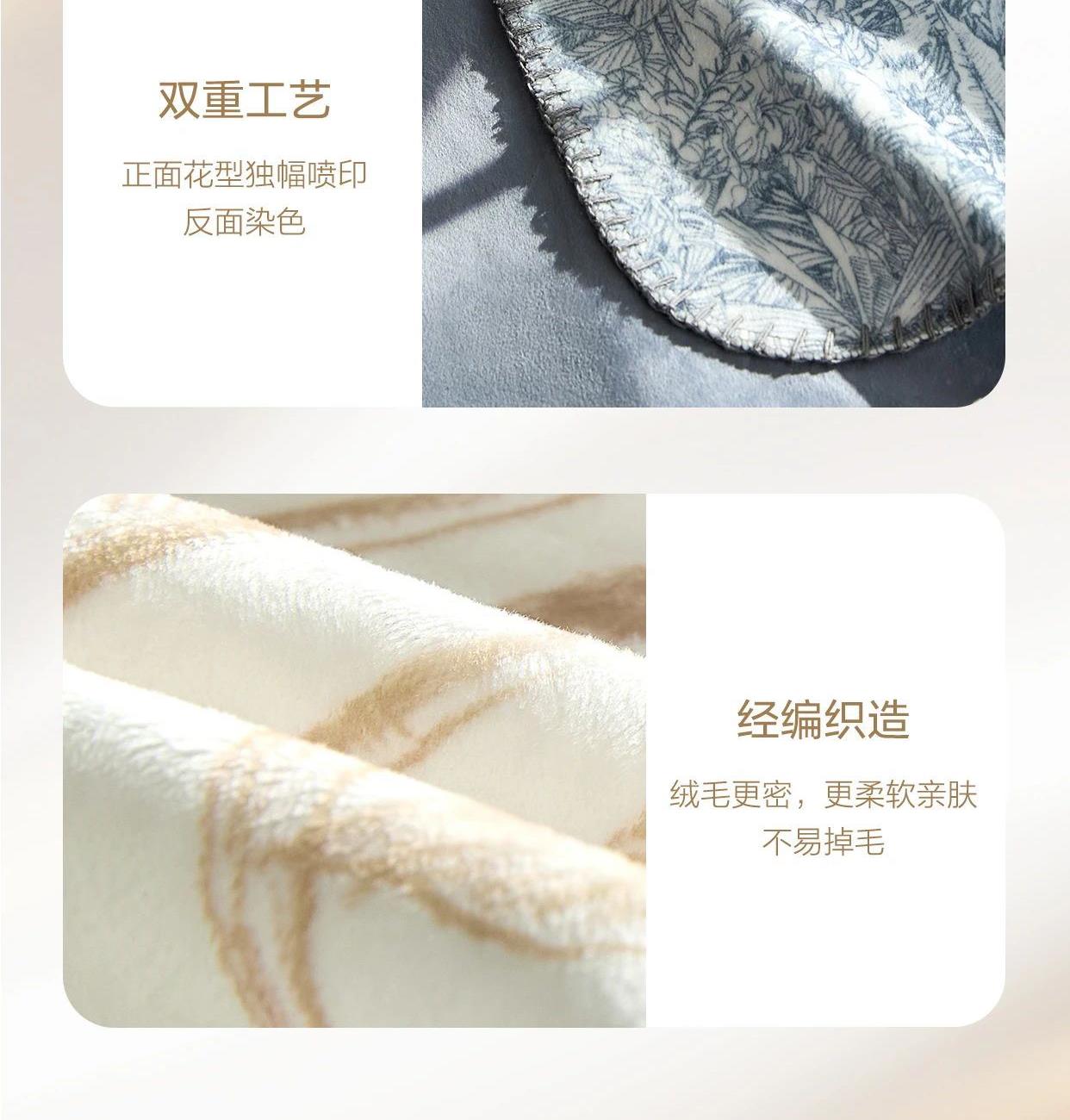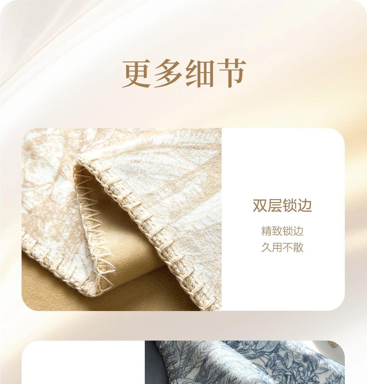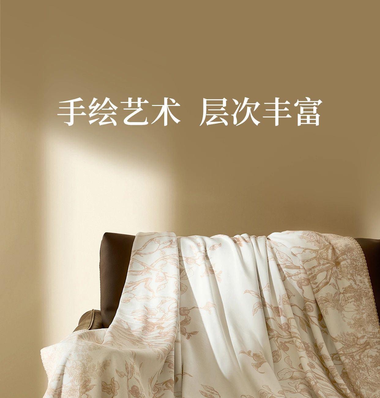 万事利柿柿可期一如意毯 产品规格:120cm×180cm 成分:94%聚酯纤维6%氨纶(辅料除外) 颜色:蓝灰/卡其