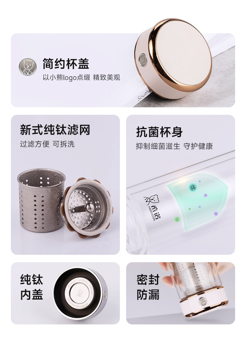 XN-605L :240ml XN-605L :52(杯口直径) x70.5(直径) x144.4(高度) 杯体 高硼硅玻璃+银离子 杯盖 食品级PP 、纯钛TA1 滤网 纯钛TA1 、食品级硅胶 密封圈 食品级硅胶 条形码 XN-605L :6951097701438 颜色 木槿紫,香草黄,珠光浅蓝 ,蜜桃粉,本色,紫罗兰