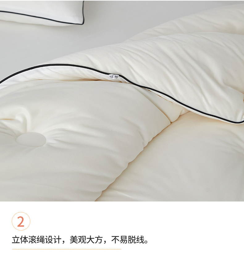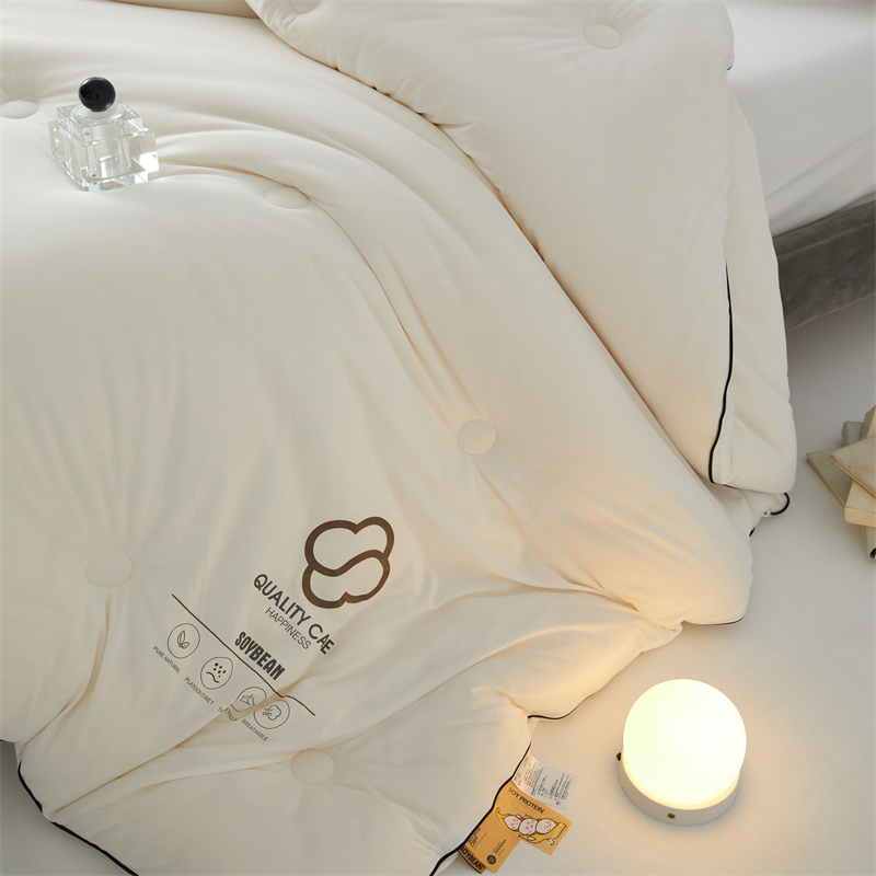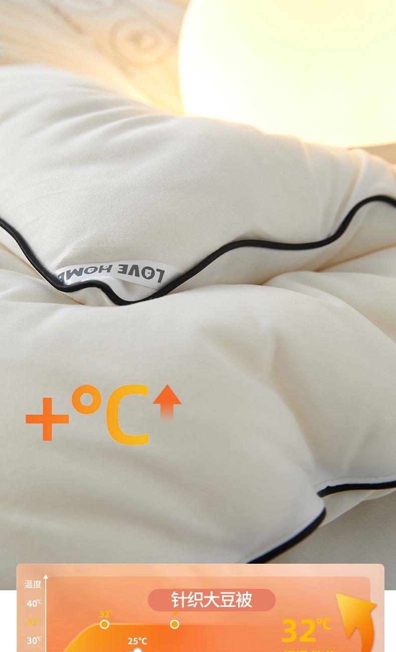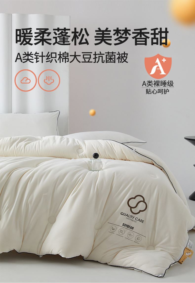 面料:针织棉(聚酯纤维) 填充:10%大豆纤维 +90%聚酯纤维 规格:200cm*230cm 填充克重:2000g 总重量:3000g 包装:精美软包 针织面料柔软爆棚,就是舒服。 柔软大豆被,软糯的触感怎么睡都舒心,让人爱不释手,SOFT仿佛睡在云朵里。
