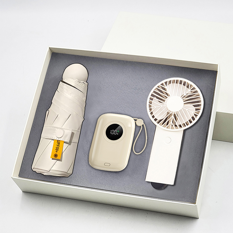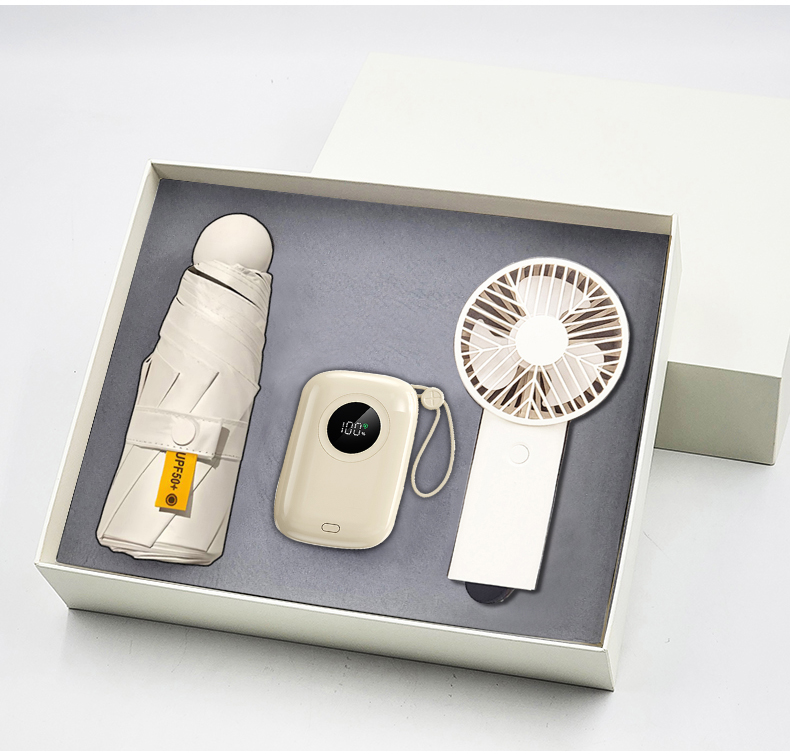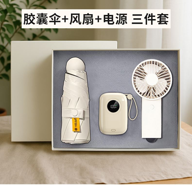 礼盒配置: 1、22.5W超级快充10000mAh自带线移动电源 2、21寸5折6骨钢胶囊伞(高密度碰击黑胶布) 3、风扇(三档调节风力、500mAh电池) 4、米色包装盒尺寸:275x227x75mm 5、米色手提袋尺寸:286x260x85mm 6、颜色:米白色 7、重量:25kg/箱