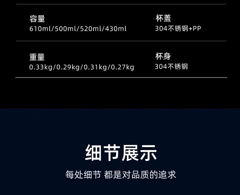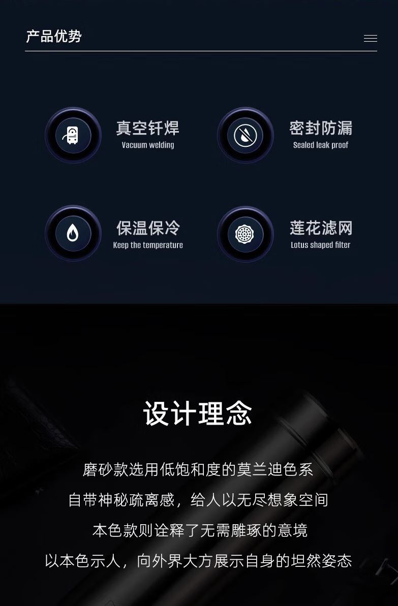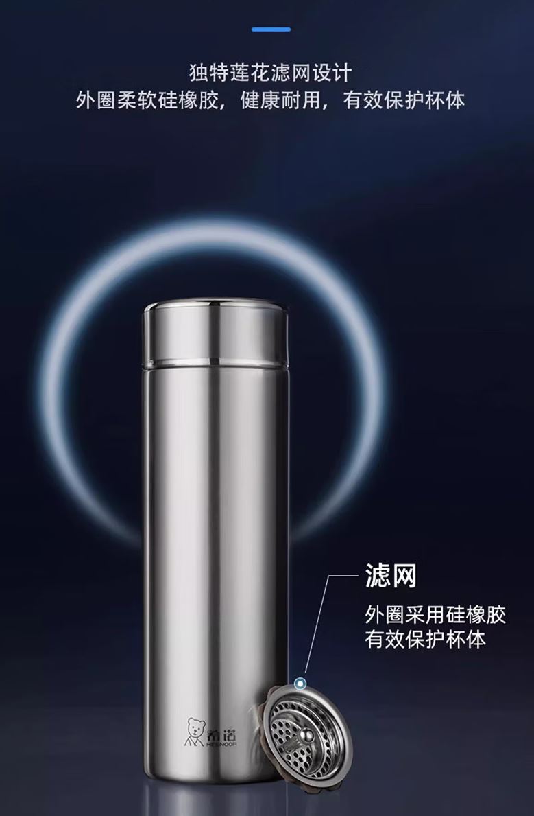 杯体 304不锈钢 杯盖 进口食品级PP、304不锈钢 密封圈 进口食品级硅胶 重量 XN-3301:0.33 kg 莲花滤网,密封硅胶圈,保护杯子内壁,延长寿命 电解抛光技术,保温层不锈钢镀铜有效形成锁热网 加固底座,防震抗撞击