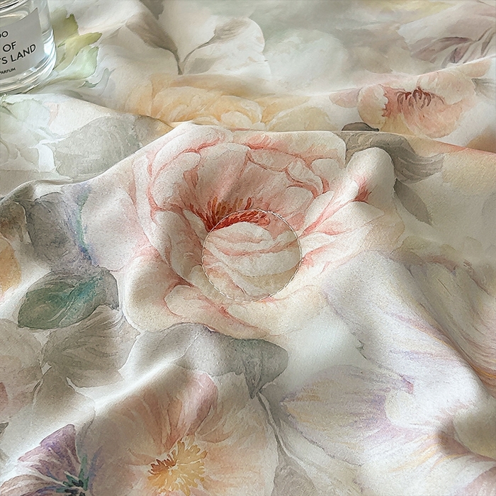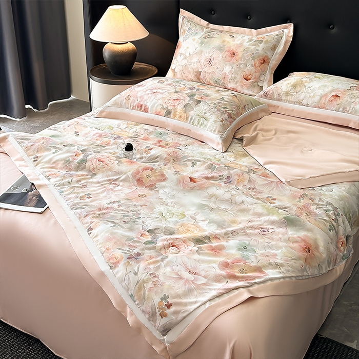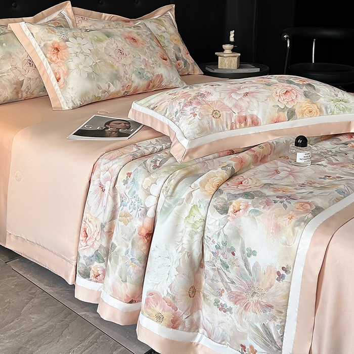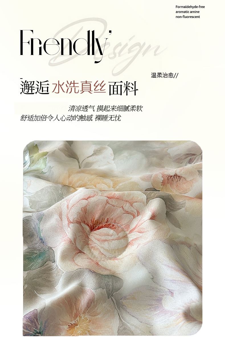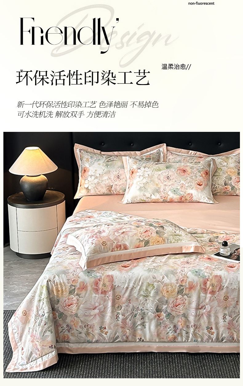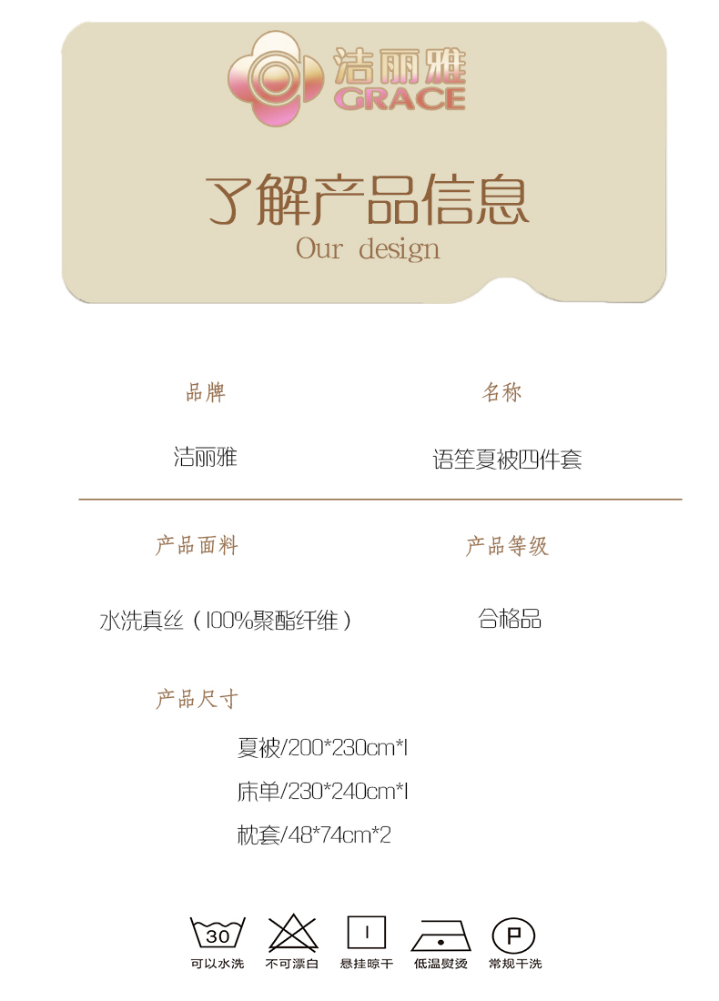 夏被:200*230cm 床单:230*240cm 枕套:48*74cm*2 面料:聚酯纤维 执行标准:GB/T22796-2021 安全类别:GB18401-2010 B类 1.舒适水洗真丝面料,柔软舒适亲肤贴身、不褪色。以再生纤维为原料,经过精梳工艺处理,面料手感柔软如贴身内衣,睡感舒适,透气。凉而不冰,触感舒适不粘身,有着棉的柔软与丝的冰滑,灵感加持,吸湿透气不闷热。 2.面料缩水率低,色牢度高,经洗耐用。
