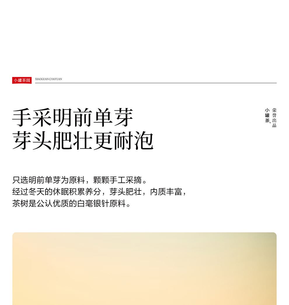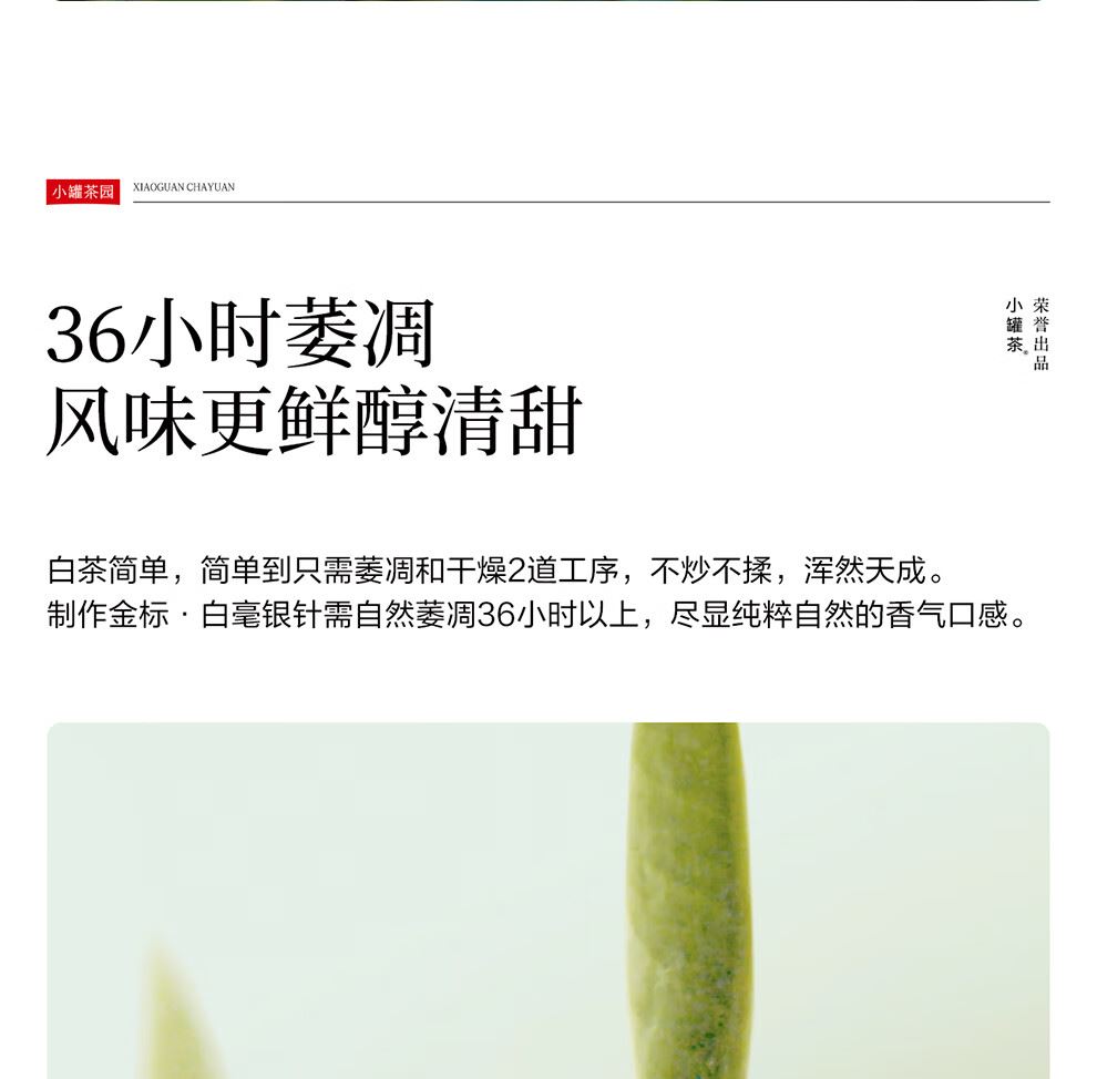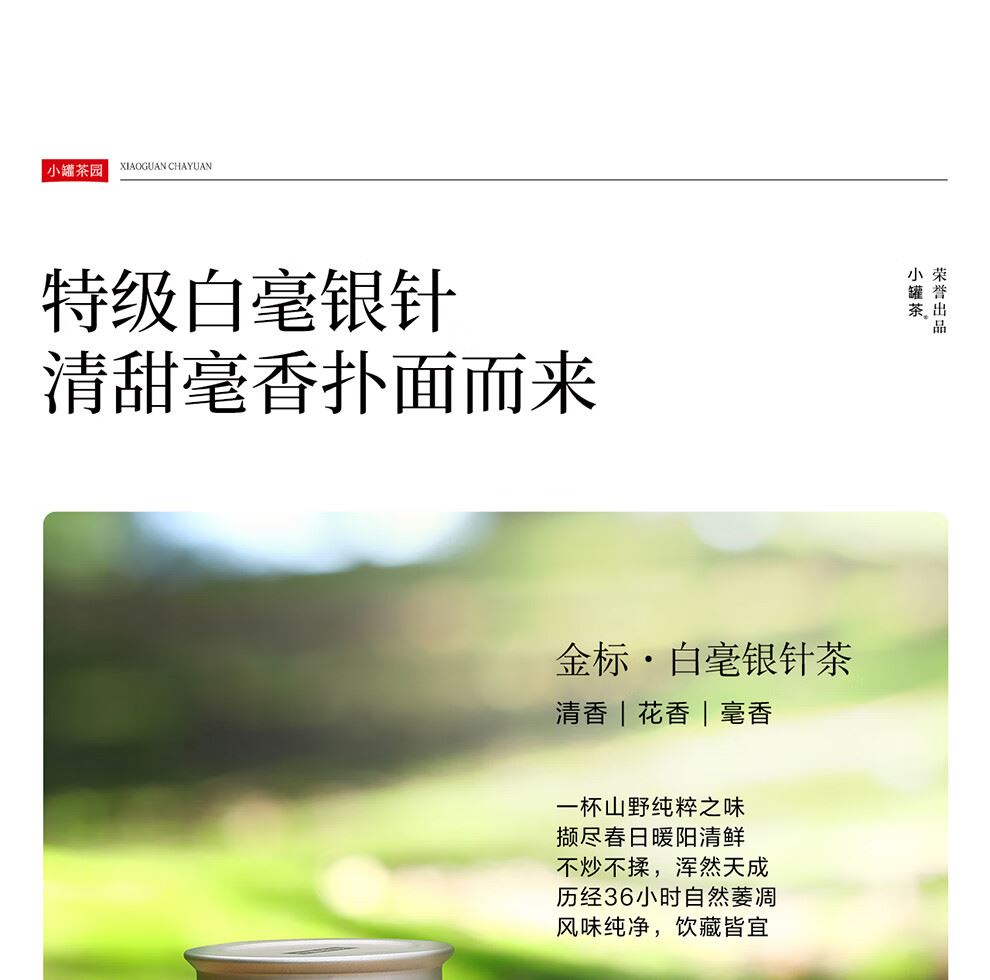清香 | 花香 | 毫香 一杯山野纯粹之味 撷尽春日 暖阳清鲜 不炒不揉,浑然天成 历经36小时自然萎凋风味纯净,饮藏皆宜。
