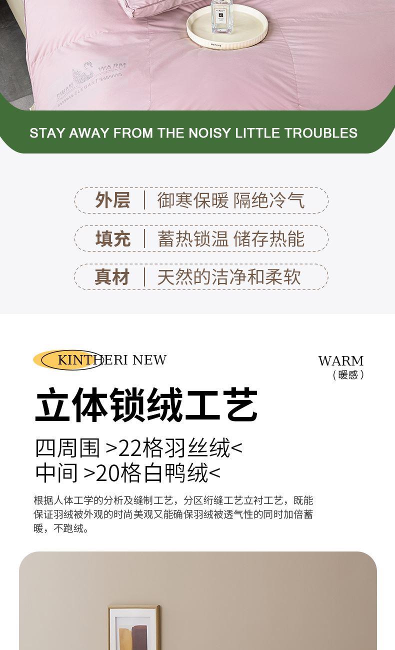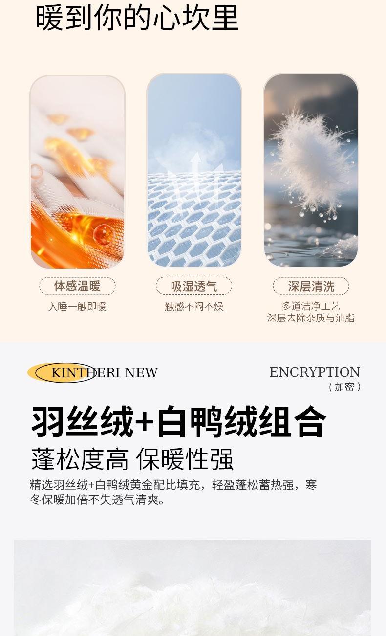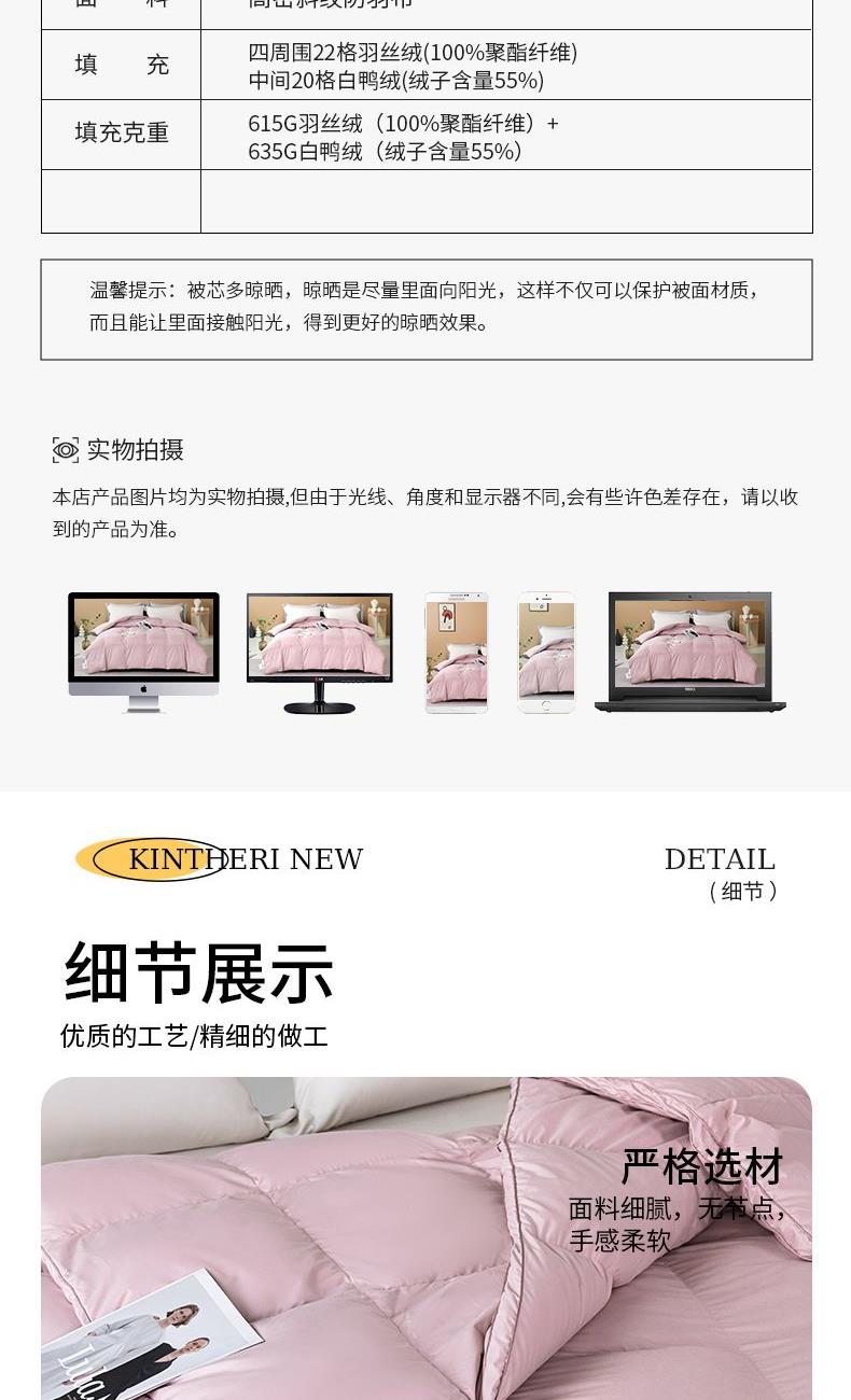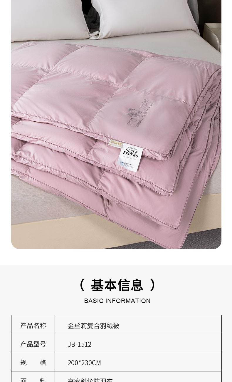 货 号:JB-1512 规 格:200*230cm 面 料:高密斜纹防羽布 填 充:四周围22格羽丝绒(聚酯纤维) 中间20格白鸭绒(绒子含量55%) 填充克重:615G羽丝绒(聚酯纤维)+ 635G白鸭绒(绒子含量55%) 1.高密斜纹防羽面料,紧密锁绒防钻绒,细腻亲肤触感,带来持久安心舒适体验。 2.精选羽丝绒和白鸭绒分区域填充,轻盈蓬松蓄热强,寒冬保暖加倍不失透气清爽。 3.立体立衬工艺,保暖更均匀,双层立衬设计避免冷点,锁温效果升级,全身持续暖意环绕