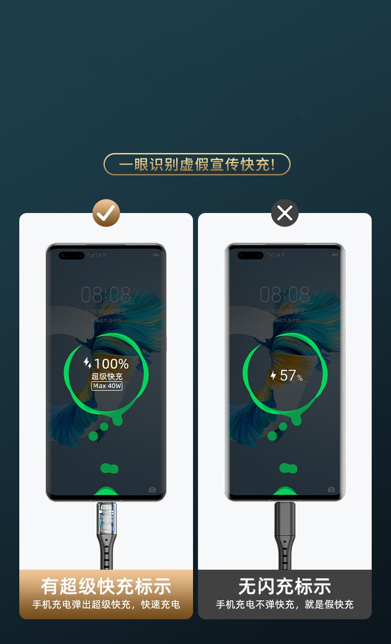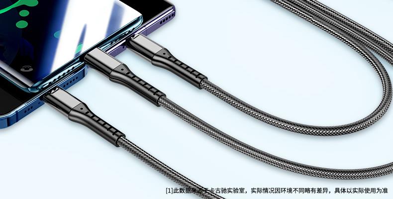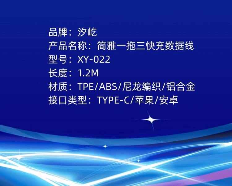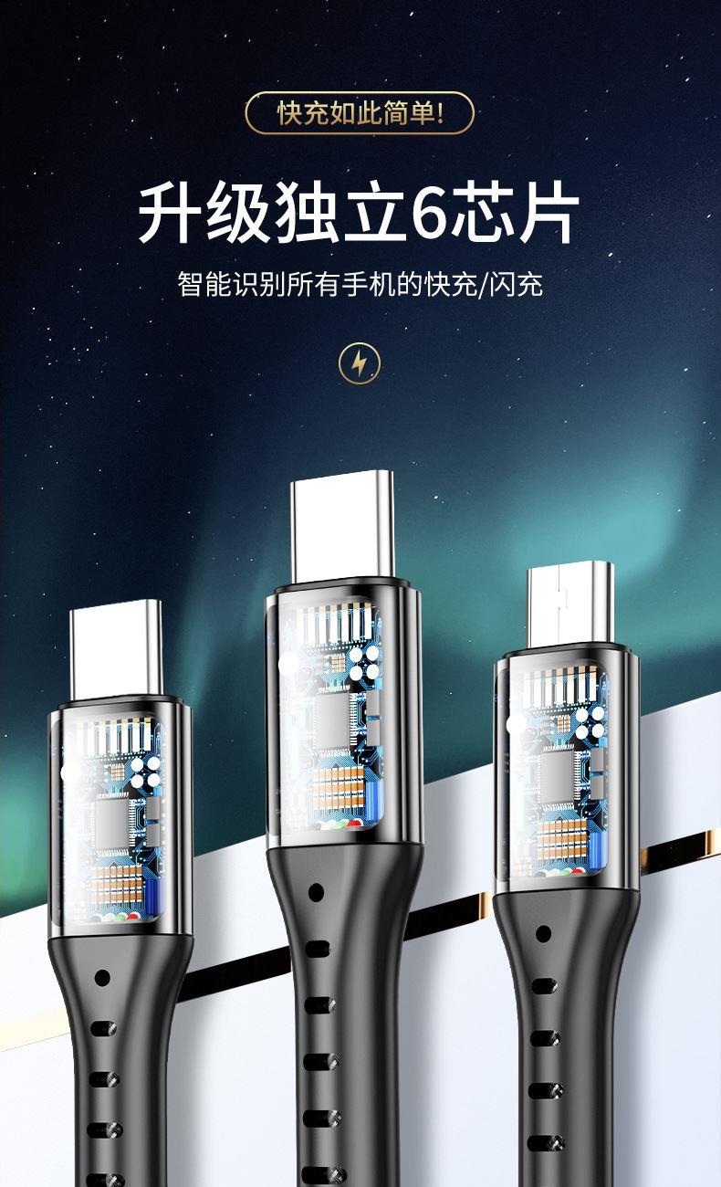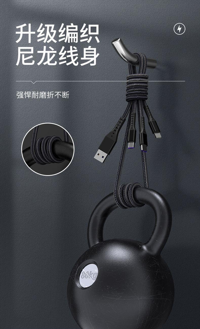 长度:1.2M 电流:6A 材质:TPE/ABS/尼龙编织/铝合金 功能:TYPE-C支持66W快充 适用:TYPE-C/苹果/安卓 颜色:红色 蓝色 黑色 产品重量:46g 产品包装尺寸:140*90*27mm(彩盒) 产品卖点:Type-c接口支持快充,编织尼龙+TPE环保材质,防缠绕,耐拉伸,经久耐用,加固接头,广泛兼容,适用市面绝大多数手机。
