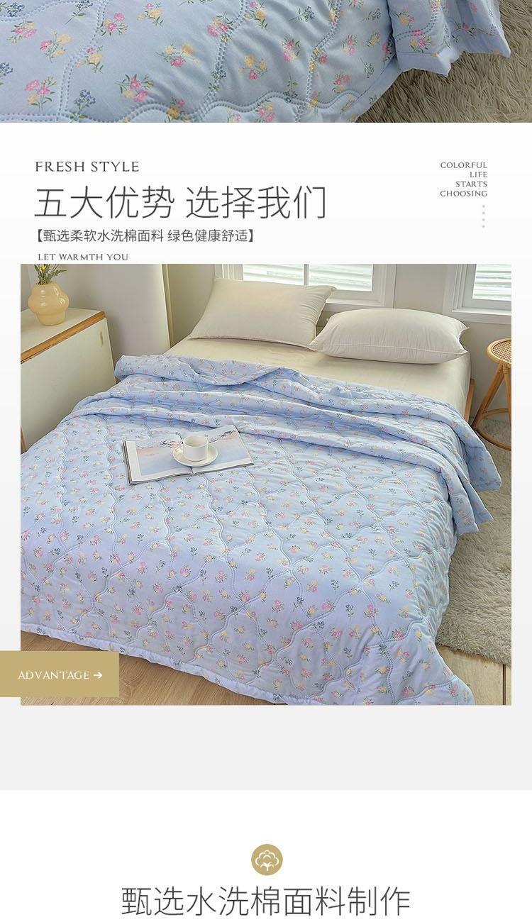 花色:夏季花园 规格:180*200cm 面料:水洗棉 填充物:羽丝绵 包装方式:时尚格子提袋 包装尺寸: 495*90*400mm 外箱尺寸:830*510*660mm 1、时尚风格与舒适亲肤保暖功能结合,打造出美丽的卧室新宠。 2、精选超细纤维精致而作。其制品,质地极其细腻柔软、亲肤,令人倍感舒适。