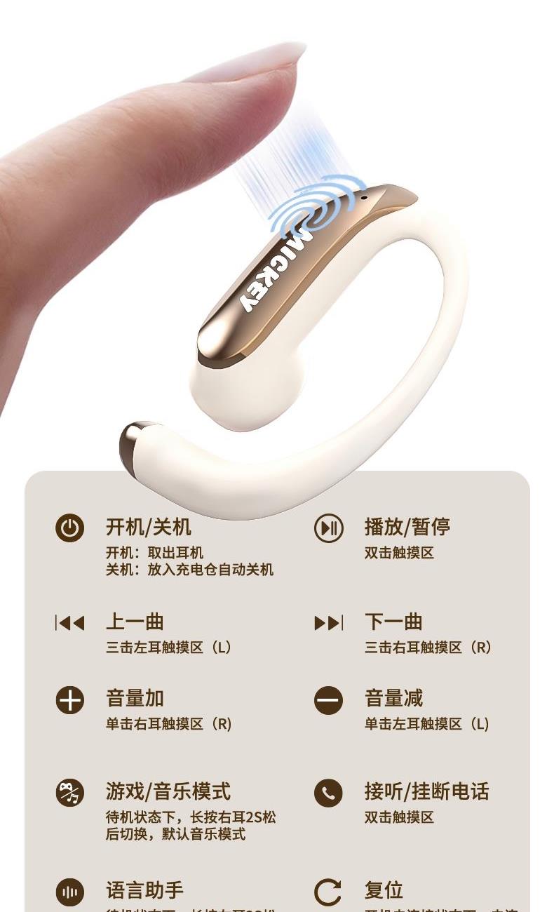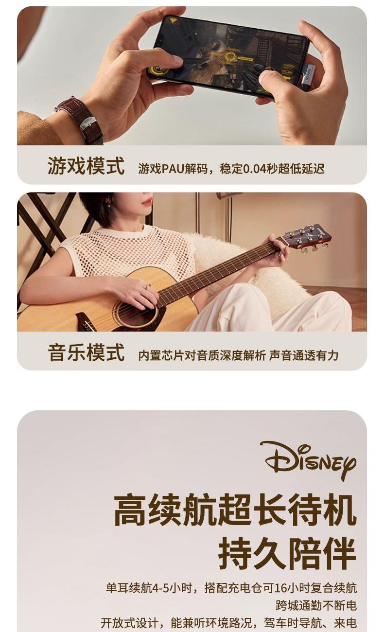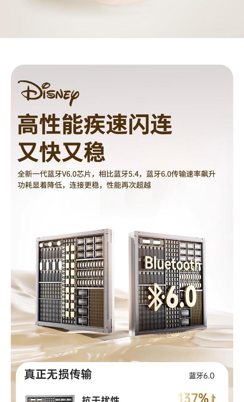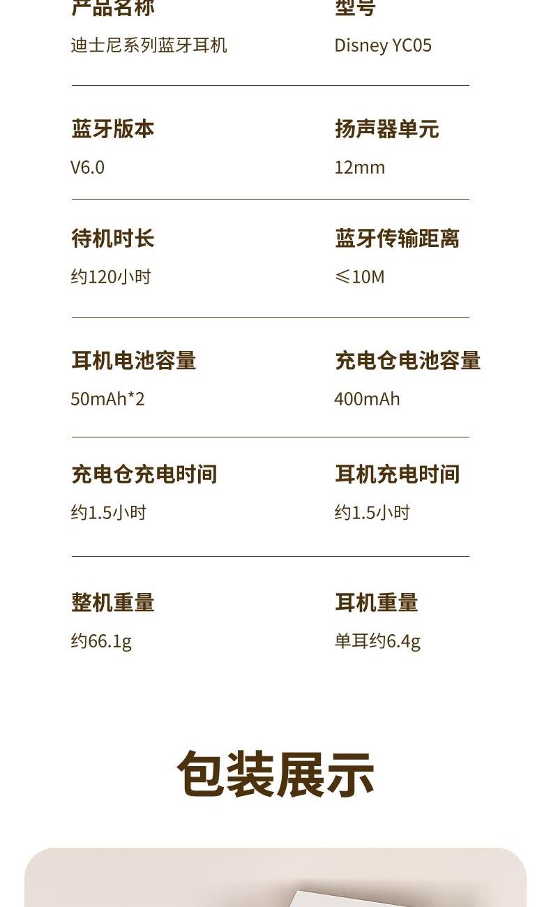 型号:Disney YC05 蓝牙版本:6.0 充电仓电池容量:400mAh 耳机电池容量:50mAh 传输半径:10米 音乐播放:约5小时左右(60%音量) 通话时间:约4小时左右(60%音量) 充电接口:Type-C 充电输入标准:DC5V/1A 充电时间:约1.5小时 续航时间:约36小时 1,迪士尼正版ip授权; 2、充电仓圆润镜面精致造型; 3、轻量化设计,符合人体工学的0感佩戴感觉,开放式设计,定向聚音技术,安全舒适; 4.智能充电仓,记忆配对、单双通道,广泛兼容。 5.触摸按键控制; 6.升级蓝牙6.0,功耗低信号更稳定、视频和游戏同步传输,无感延迟,拒绝卡顿;