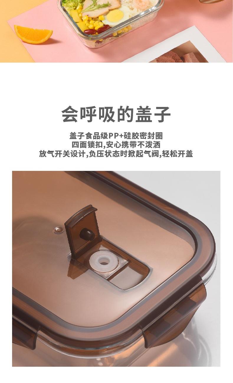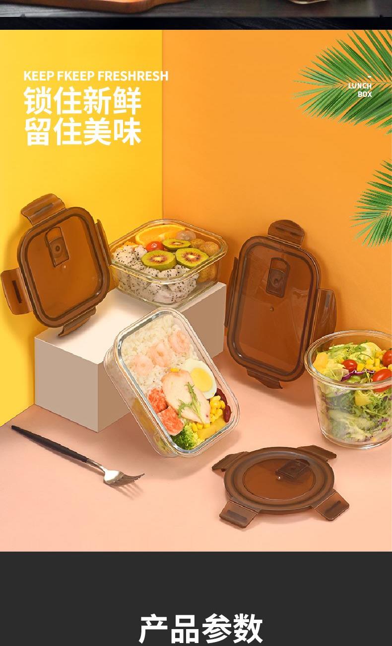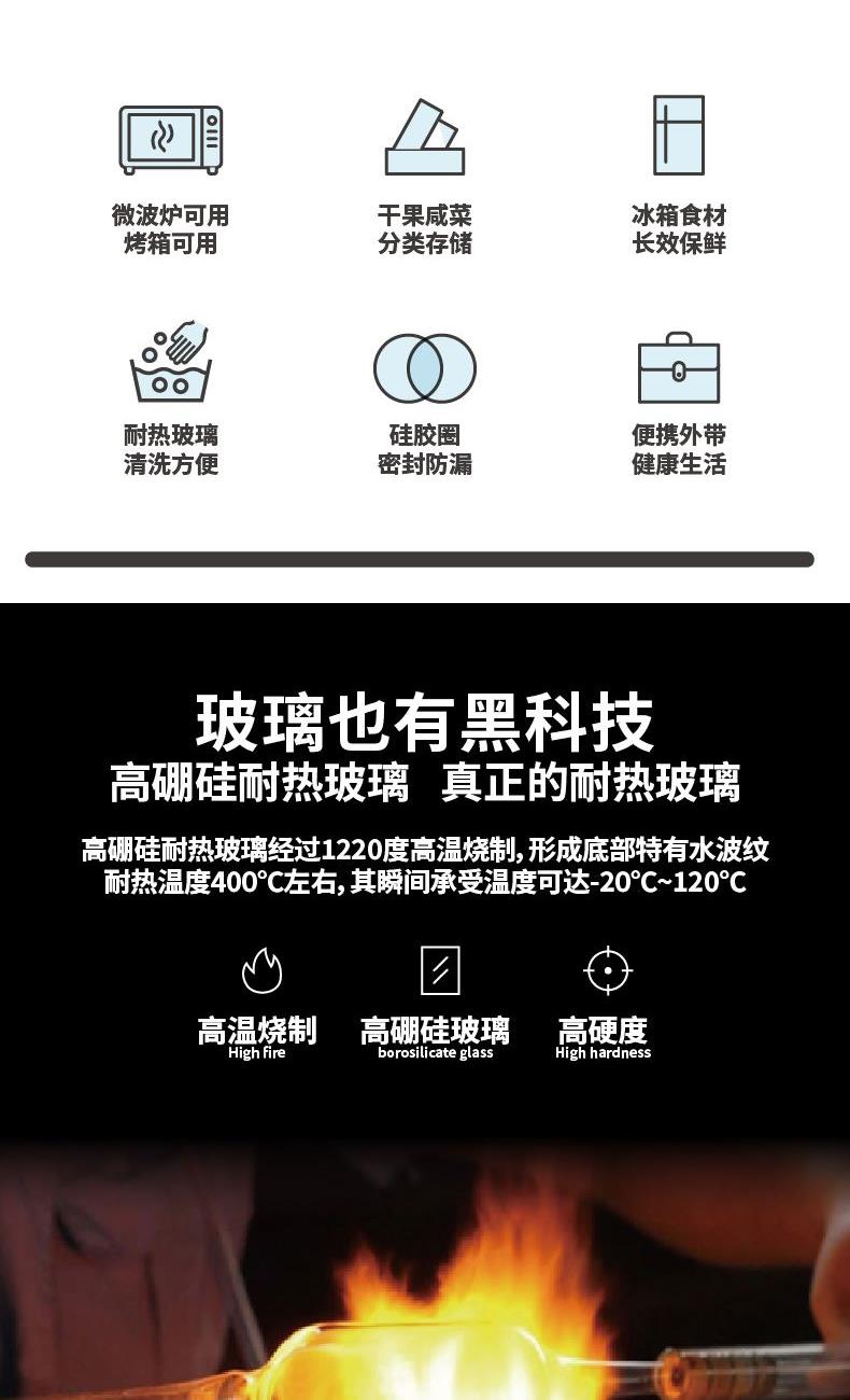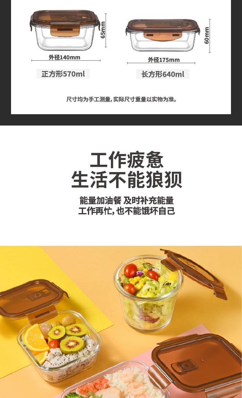 容量:180ml、400ml、570ml、640ml、保温包 保鲜盒材质:硼硅酸盐耐热玻璃/聚丙烯颗粒/硅胶树脂 保鲜盒规格:170ml-12.5*8.8*4.8cm、400ml-13*13*6cm、570ml-14*14*6.5cm、640ml-17.5*13*6cm 彩盒尺寸: 37*7.5*30CM 产品毛重(含彩盒):约1800g 推荐理由 ·盒身高硼硅耐热玻璃材质,微波炉、烤箱使用OK! ·盖子、密封圈均采用食品级材质,国际绿色和平组织推荐材质,健康卫生,使用放心! ·四面锁扣盒盖,强效密封,安心携带不泼洒。 ·盒盖放气开关设计,负压状态下也很容易打开哦! ·玻璃材质易清洗,无异味残留,安全、无毒。