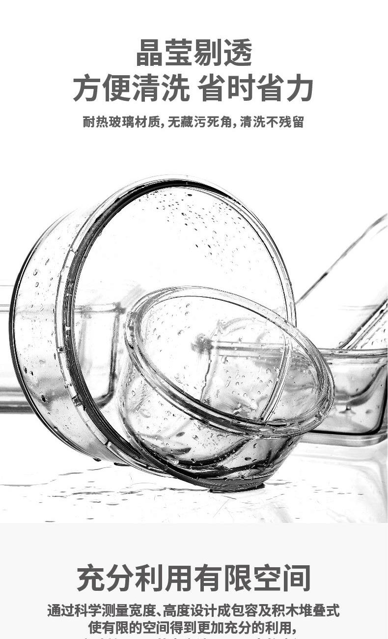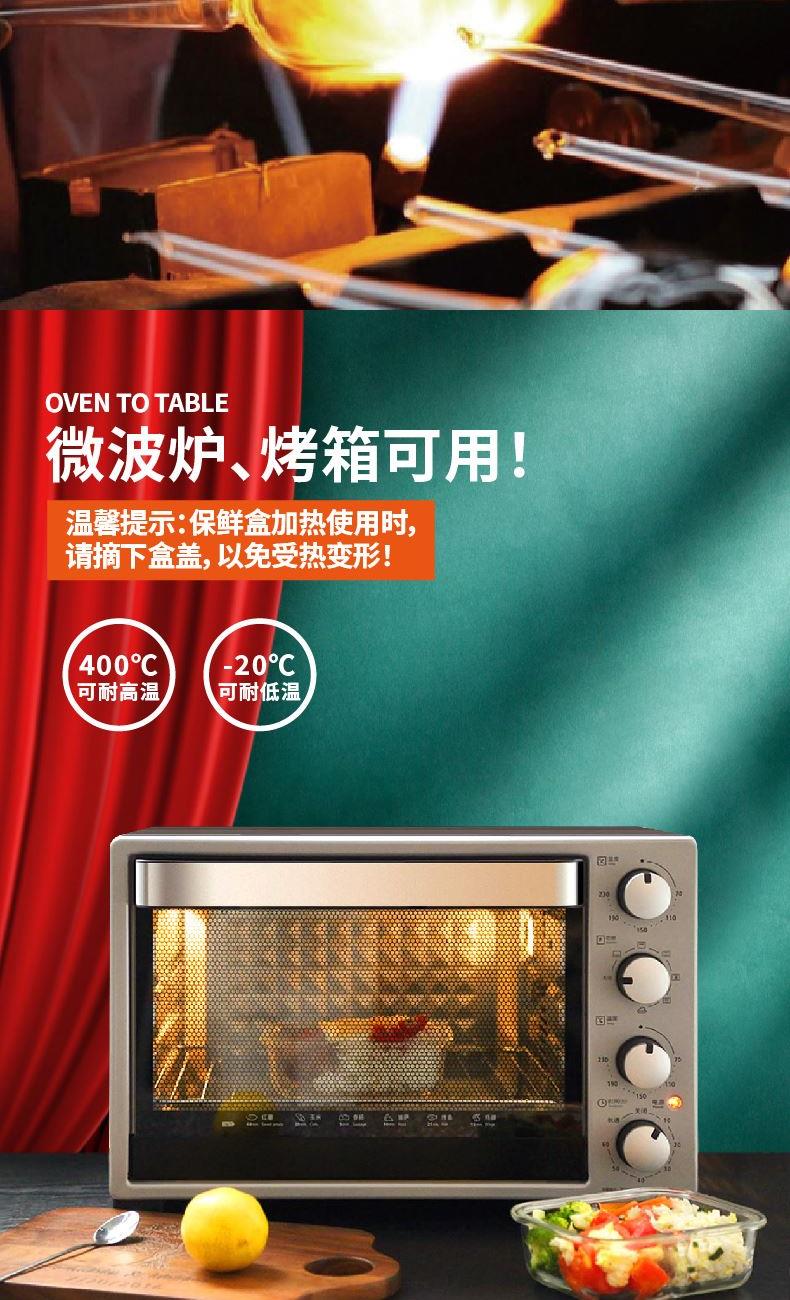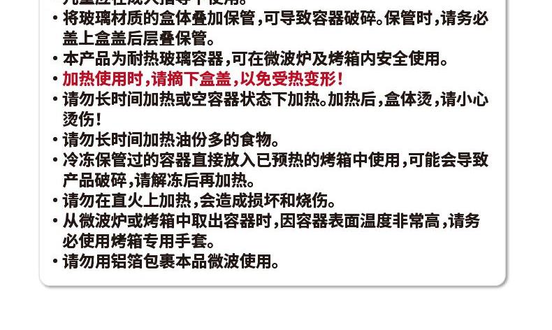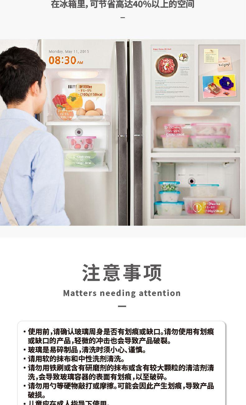容量:180ml、400ml、570ml、640ml、保温包 保鲜盒材质:硼硅酸盐耐热玻璃/聚丙烯颗粒/硅胶树脂 保鲜盒规格:170ml-12.5*8.8*4.8cm、400ml-13*13*6cm、570ml-14*14*6.5cm、640ml-17.5*13*6cm 彩盒尺寸: 37*7.5*30CM 产品毛重(含彩盒):约1800g 推荐理由 ·盒身高硼硅耐热玻璃材质,微波炉、烤箱使用OK! ·盖子、密封圈均采用食品级材质,国际绿色和平组织推荐材质,健康卫生,使用放心! ·四面锁扣盒盖,强效密封,安心携带不泼洒。 ·盒盖放气开关设计,负压状态下也很容易打开哦! ·玻璃材质易清洗,无异味残留,安全、无毒。