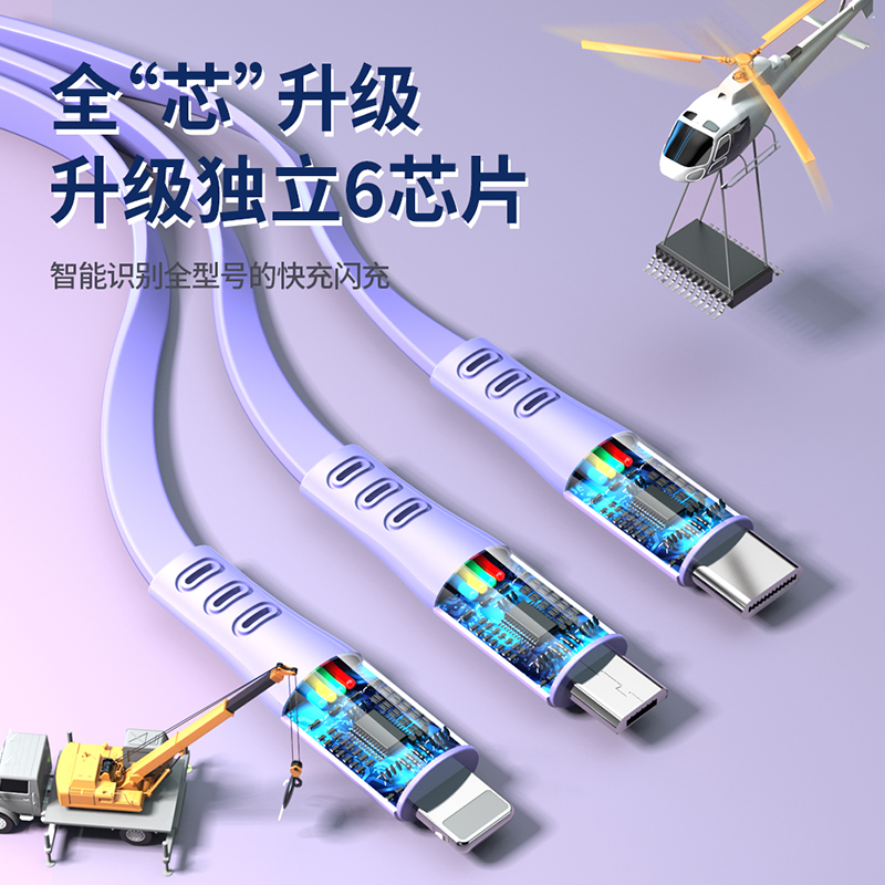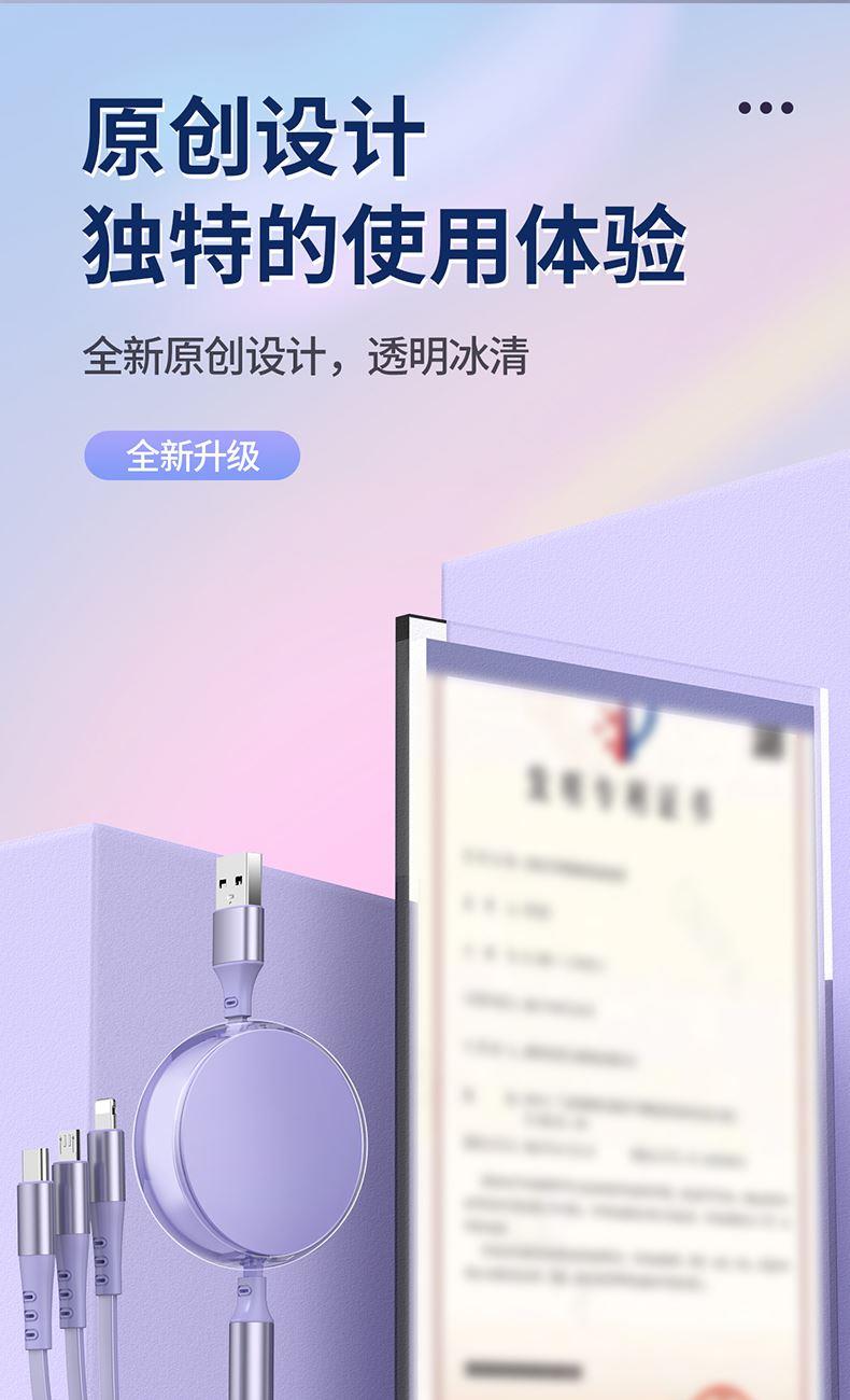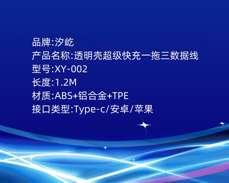 额定电压:5V 输出电流:6A 长度:120cm 材质:ABS+铝合金+TPE 颜色:绿色,蓝色 接口:苹果接口 安卓接口 Type-c接口 功能:TYPE-C支持66W快充 产品重量:52g 产品包装尺寸:140*90*27mm(彩盒) 产品卖点:透明外壳设计,手感舒适,三头接口广泛适配,五档伸缩流畅不卡顿,Type-c接口支持快充。
