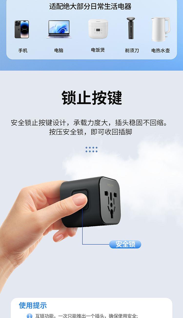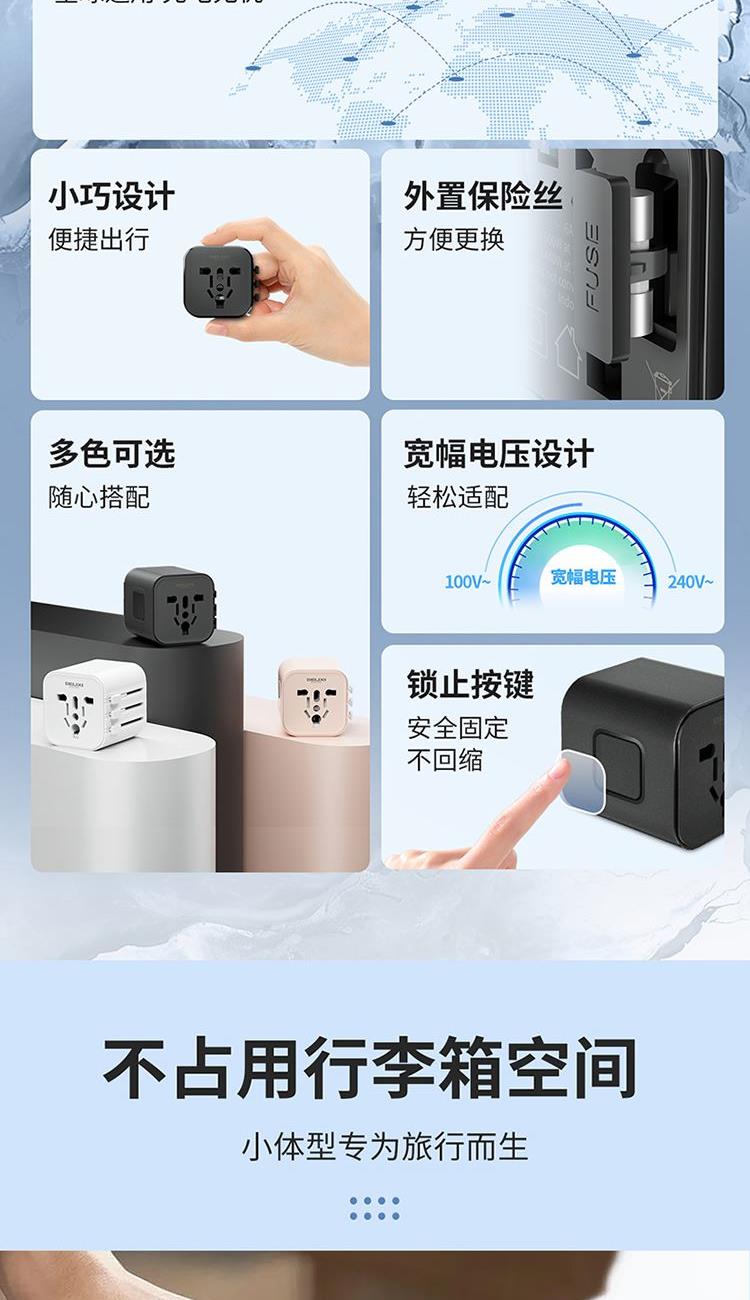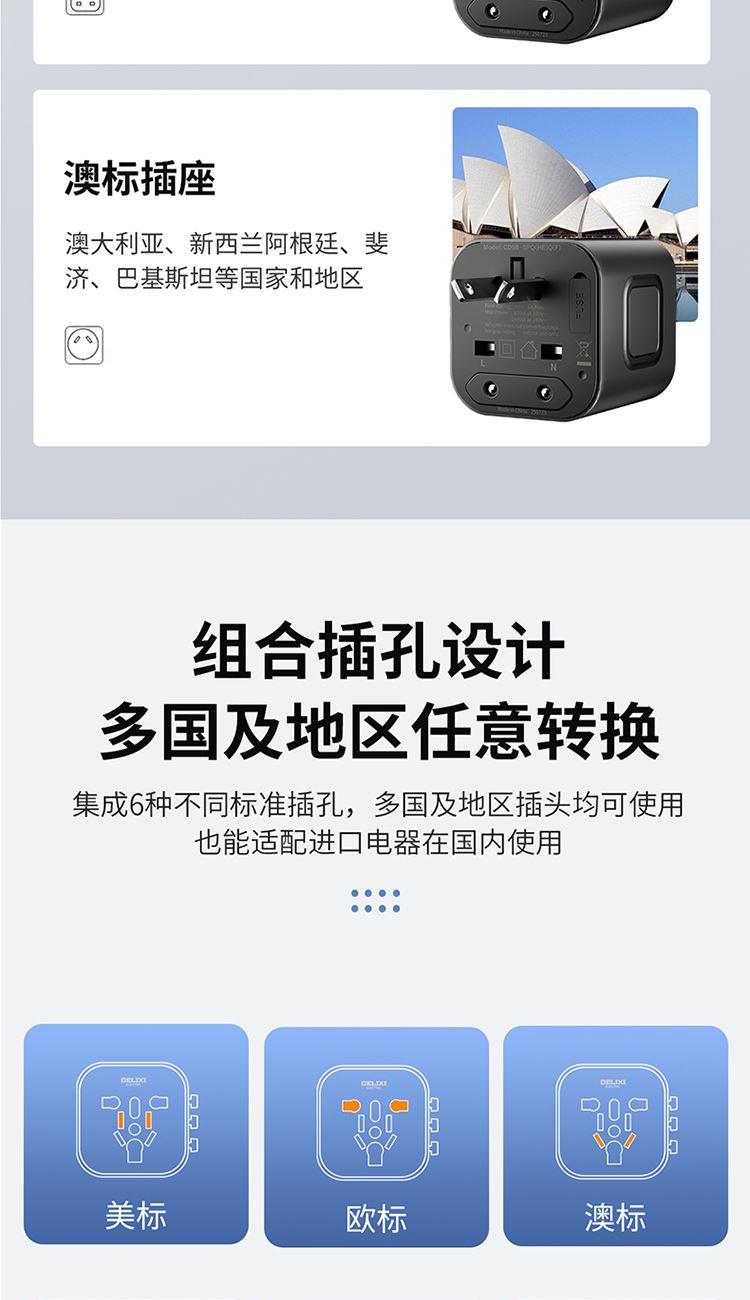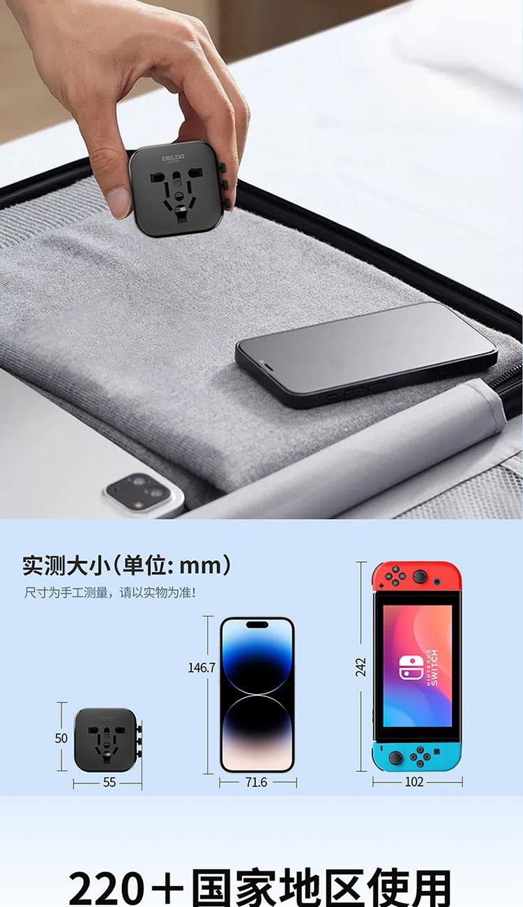 产品:德力西电气全球通旅行插座 基础款 粉色 产品型号:CD98-SPQ(HE)Q (F) 产品颜色:粉色 宽幅电压:100-240V适配 产品尺寸:55*50* 52mm 产品材质:PC+ABS 阻燃材料 电流:6A MAX 产品位数:欧标、英标、美标、澳标、一位二孔、一位三孔、无线