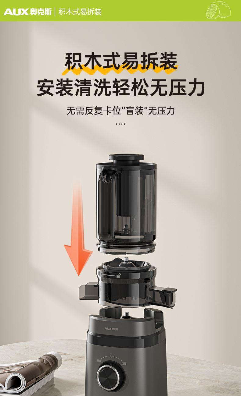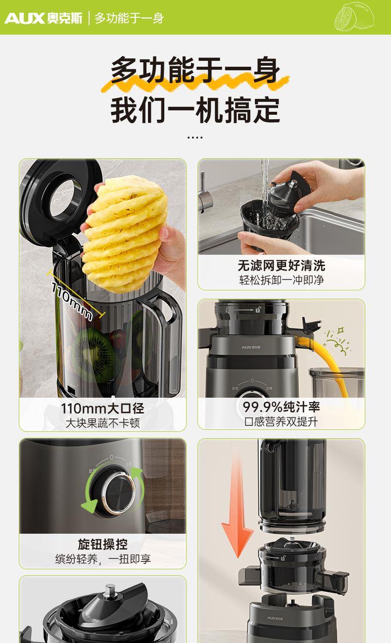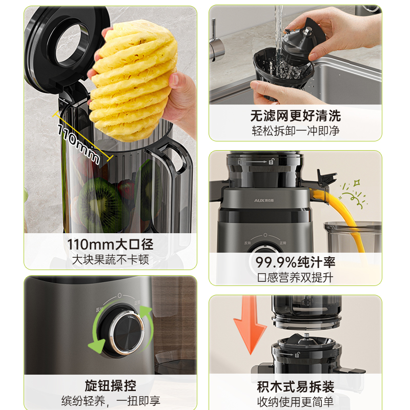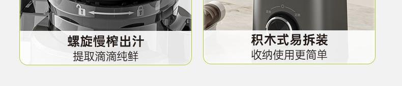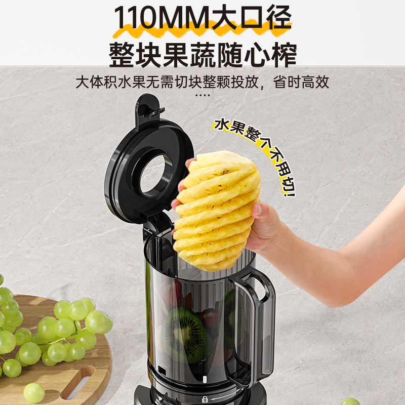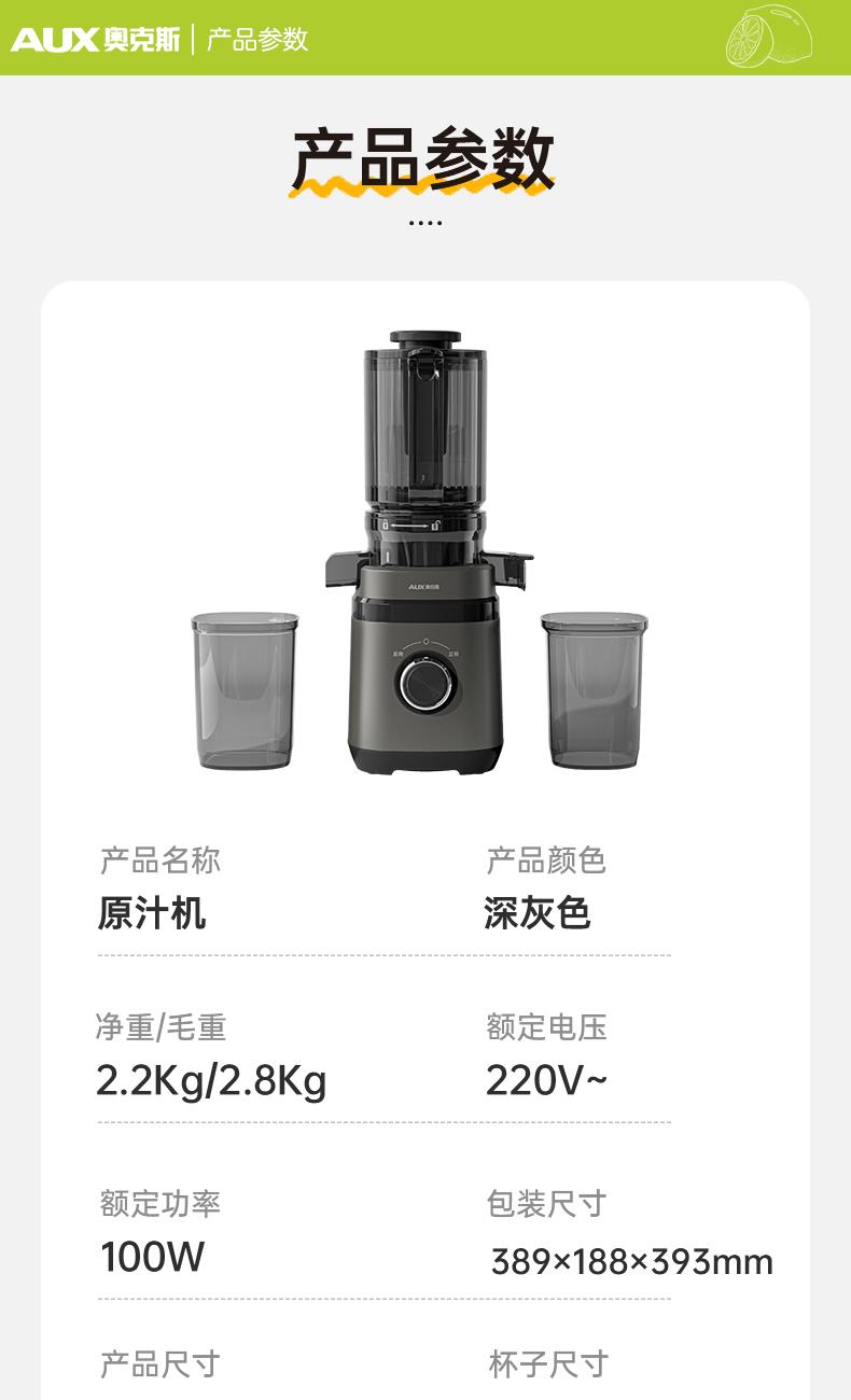 额定电压:220V~ 额定功率:100W 额定频率:50Hz 容 量:可出汁量500ML,果渣杯800ML 材 质:榨汁杯:PC,推料棒:PP,刀轴:不锈钢420 整块果蔬顺畅出汁,原汁原味乐享鲜榨 无滤网更好清洗,轻松拆卸一冲即净 渣汁自动分离,无需手动过滤 积木式易拆装,安装清洗轻松无压力 110MM大口径,无需切块省时高效