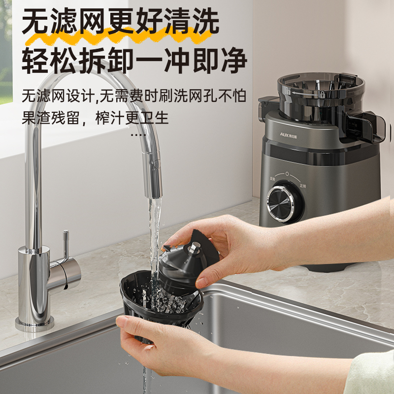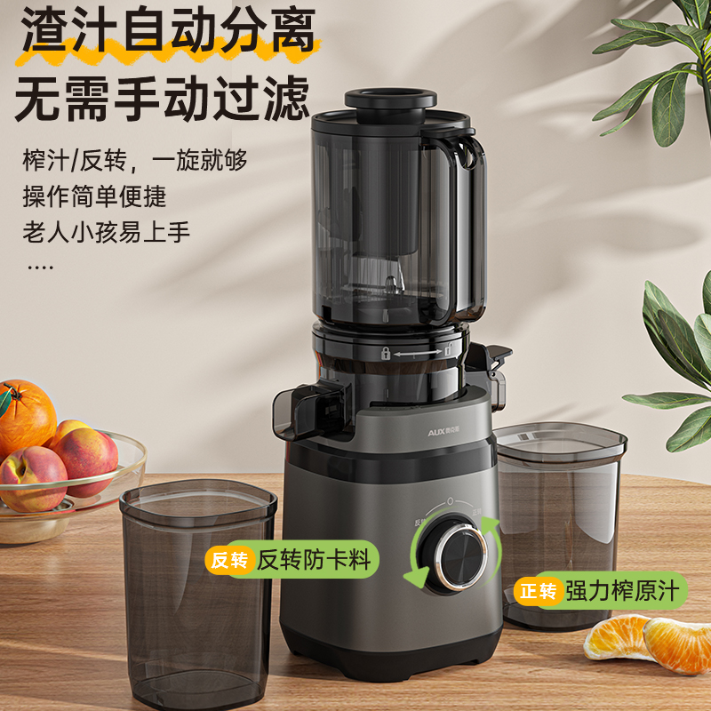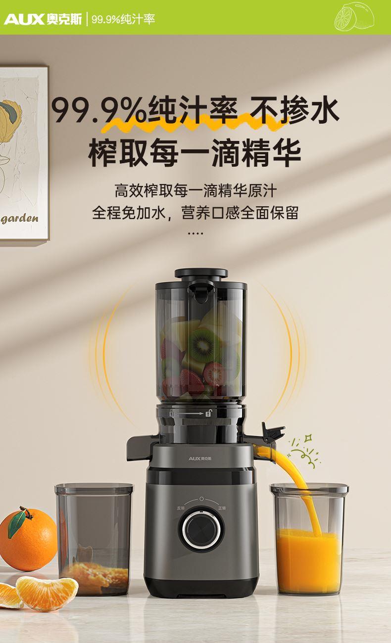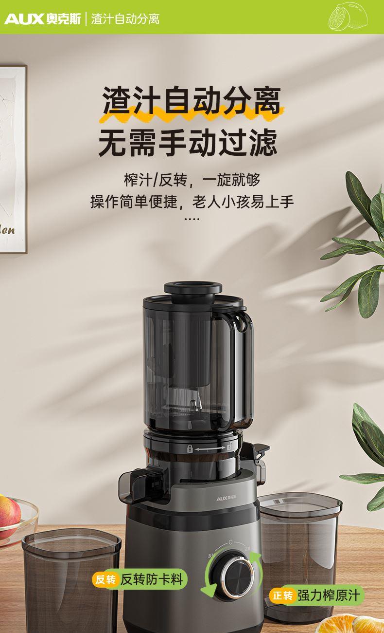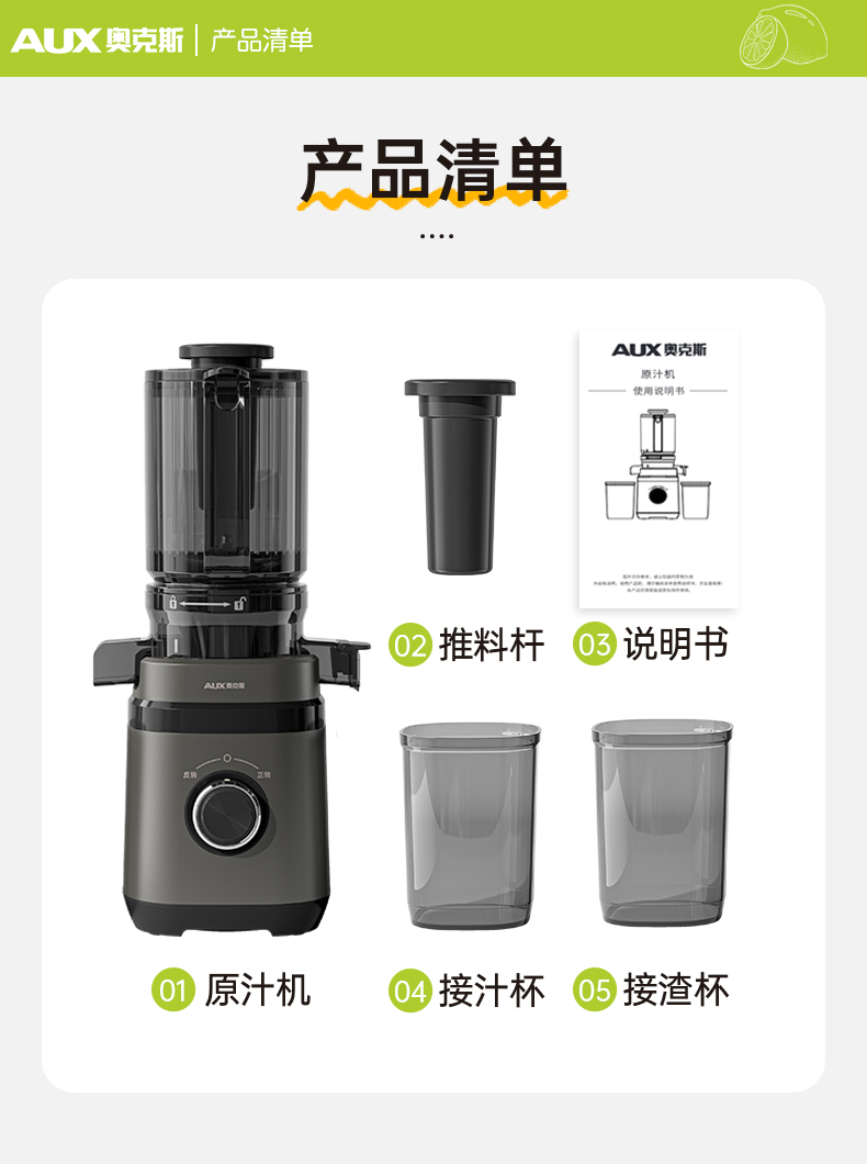 额定电压:220V~ 额定功率:100W 额定频率:50Hz 容 量:可出汁量500ML,果渣杯800ML 材 质:榨汁杯:PC,推料棒:PP,刀轴:不锈钢420 整块果蔬顺畅出汁,原汁原味乐享鲜榨 无滤网更好清洗,轻松拆卸一冲即净 渣汁自动分离,无需手动过滤 积木式易拆装,安装清洗轻松无压力 110MM大口径,无需切块省时高效