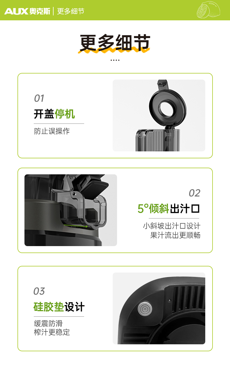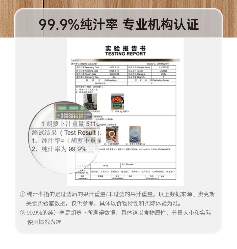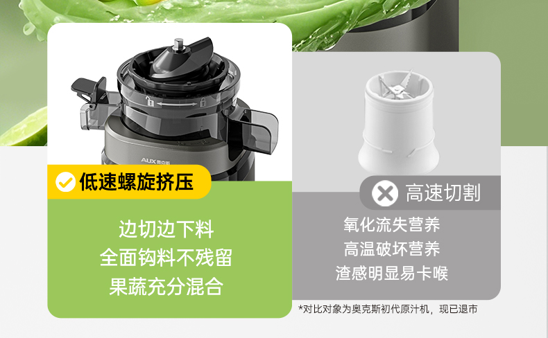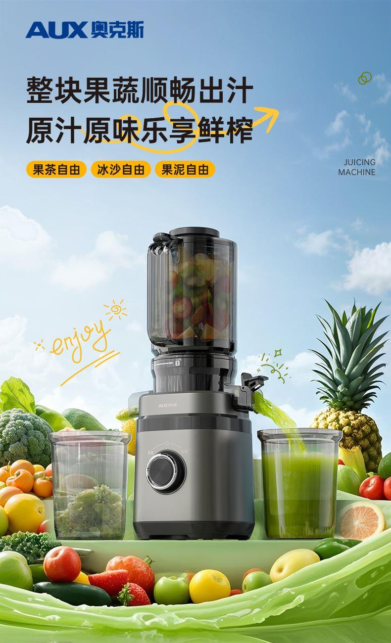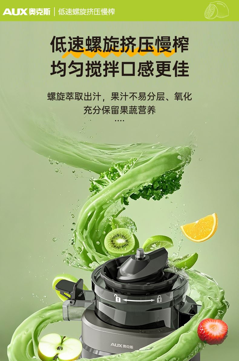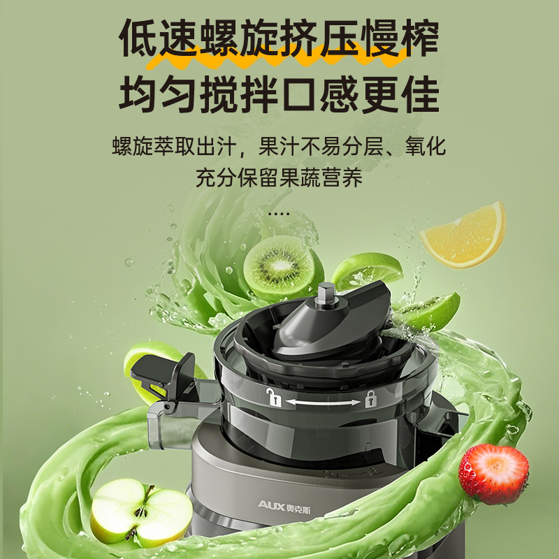 额定电压:220V~ 额定功率:100W 额定频率:50Hz 容 量:可出汁量500ML,果渣杯800ML 材 质:榨汁杯:PC,推料棒:PP,刀轴:不锈钢420 整块果蔬顺畅出汁,原汁原味乐享鲜榨 无滤网更好清洗,轻松拆卸一冲即净 渣汁自动分离,无需手动过滤 积木式易拆装,安装清洗轻松无压力 110MM大口径,无需切块省时高效