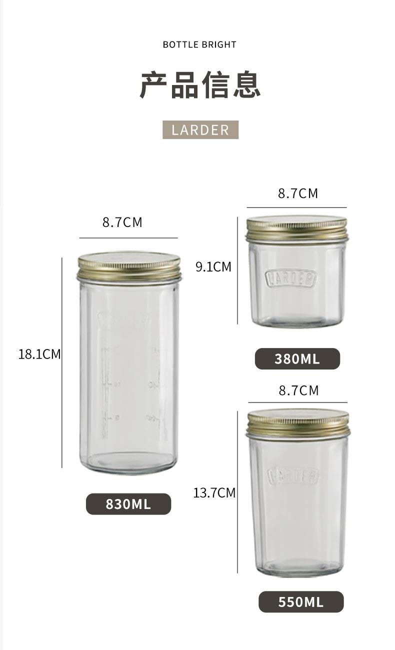 材 质:高白料钠钙玻璃 产品参数:大830ml*2、中550ml*2、小380ml*2 彩盒尺寸:280*95*284mm 外箱尺寸:58*40*30cm 产品卖点:1.采用高透光无铅玻璃瓶身,无毒无异味,可直接接触食材,符合健康饮食需求,透明质地清晰展示内容物状态。​2.复古工业美学设计复刻1927年经典工业风,古铜色马口铁螺纹防滑盖+棱纹金属质感,搭配叠落式结构。 ​3.三容量选择,满足厨房储物、吧台调酒、办公收纳等需求;可叠放设计节省空间,成组摆放提升空间格调。