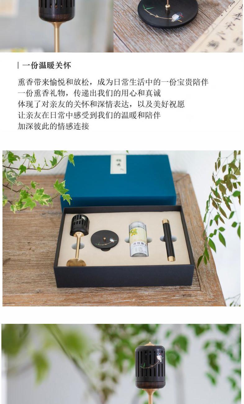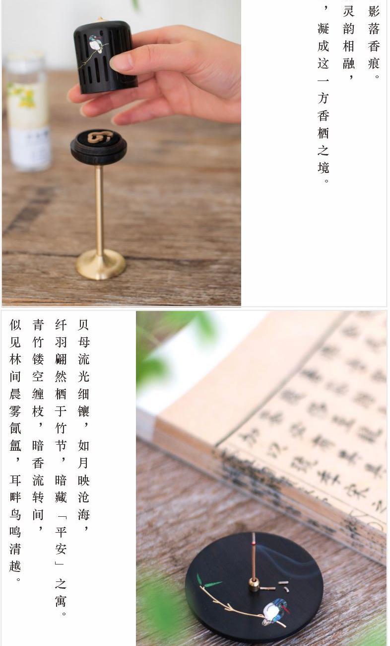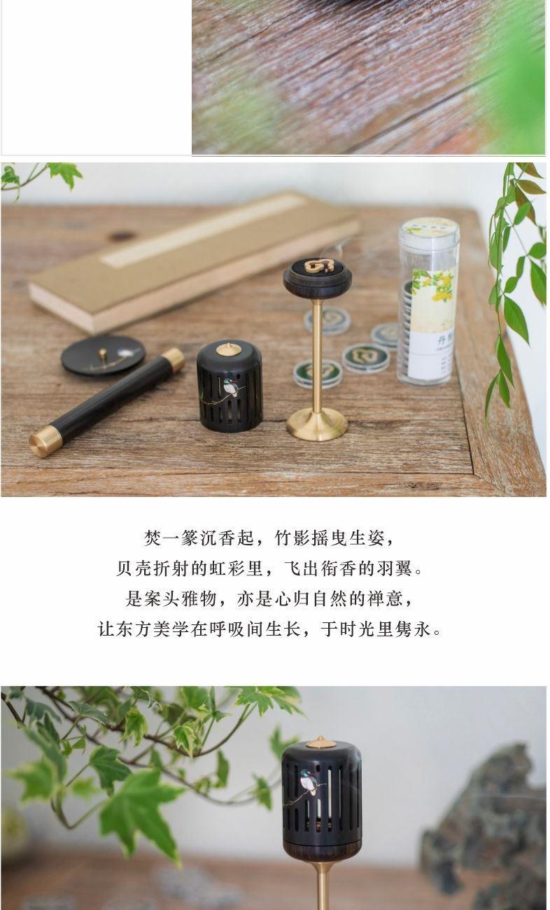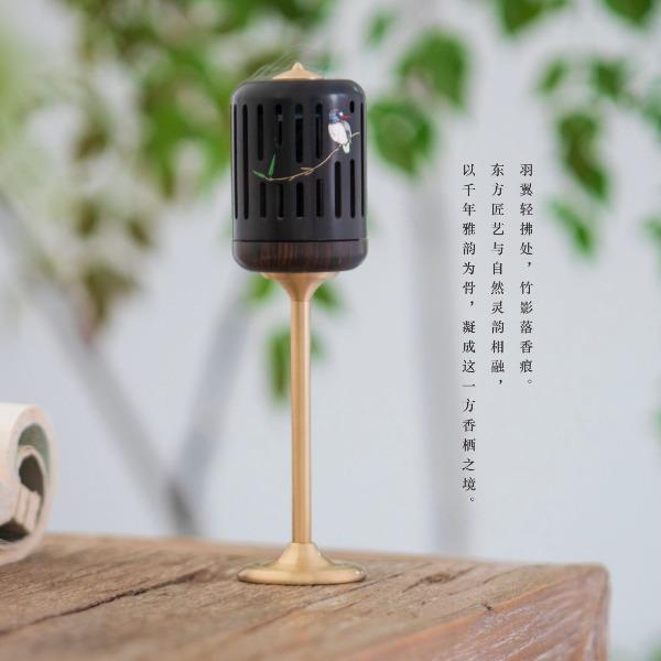 【锦秀】多功能案头香具:一器融雅,双境生宁 以黄铜之温润承托,借鸟笼之巧思拢韵,将东方雅趣与实用功能相契,打造适配居家与办公双场景的案头香具。 居家场景:案头藏幽,静享私语 置于书房案台、客厅茶桌,点燃香氛,青烟穿笼而出,似将外界纷扰隔绝。伴书、品茗或静思时,香韵与器物雅趣交织,为日常空间注入松弛感,让居家时光更具诗意禅意。 办公场景:方寸减压,高效伴手 安放于办公桌面,简约设计不占空间,却能打破环境的单调。工作间隙,一缕清香缓缓弥散,助你舒缓紧绷思绪,快速平复状态,在高效办公中寻得片刻从容。 兼具实用与观赏性,燃香时是静心器物,闲置时为空间雅饰,轻松平衡生活与工作的美学与节奏。
