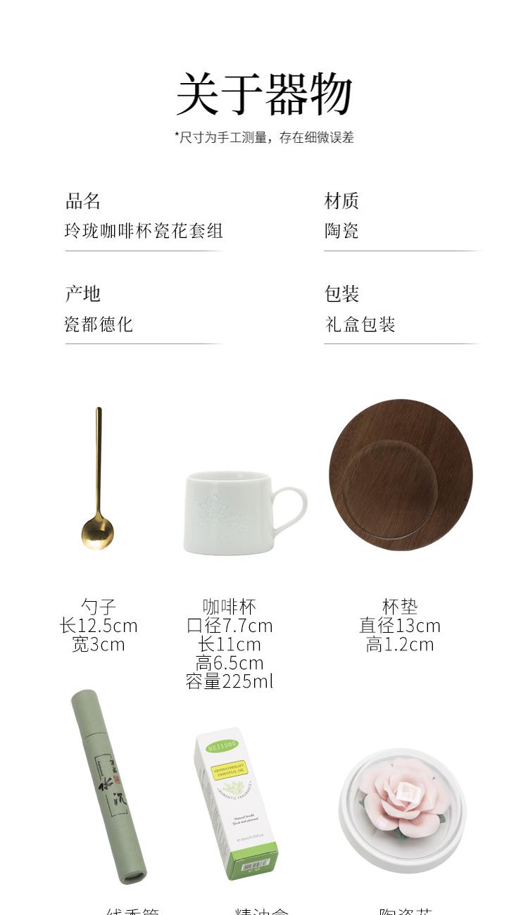 玲珑咖啡杯*1 不锈钢勺子*1 胡桃木咖啡垫*1 陶瓷花*1 香薰*2 线香*2 礼盒*1 手提袋*1 材质:羊脂玉瓷 礼盒尺寸:29cm*21cm*12cm 产品尺寸:咖啡杯:直径7.7cm长度11 高6.5cm 容量225ml
