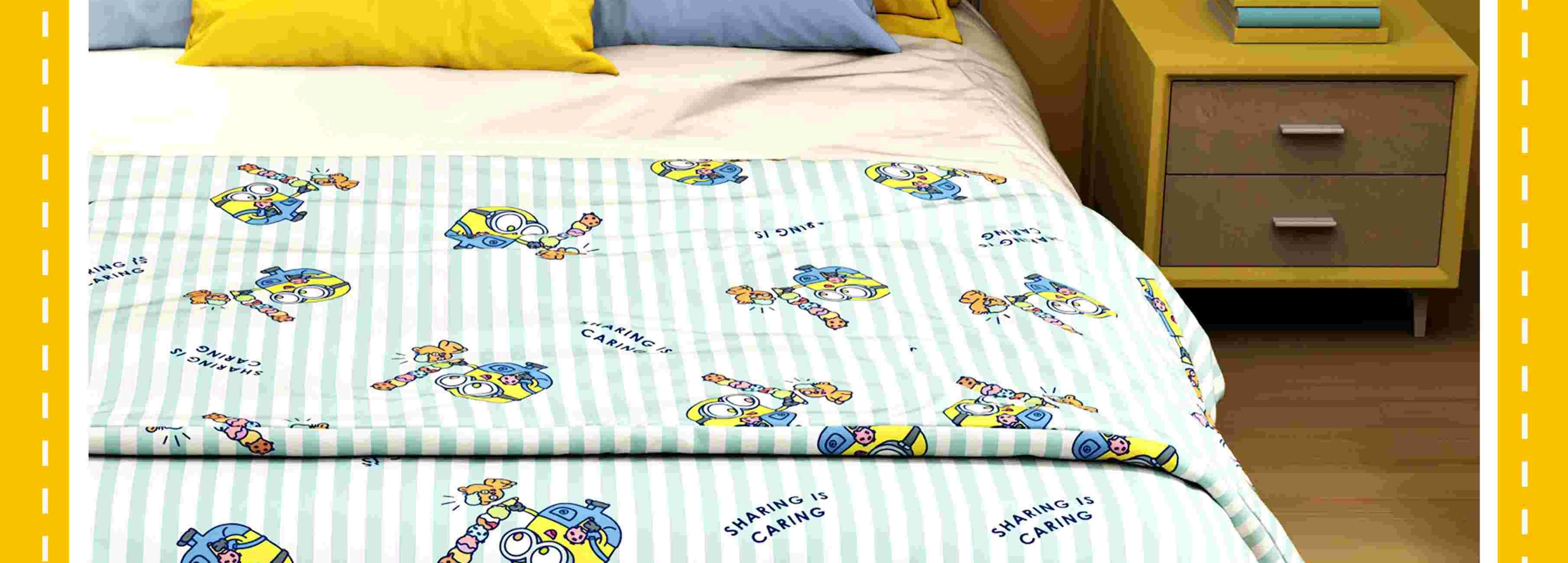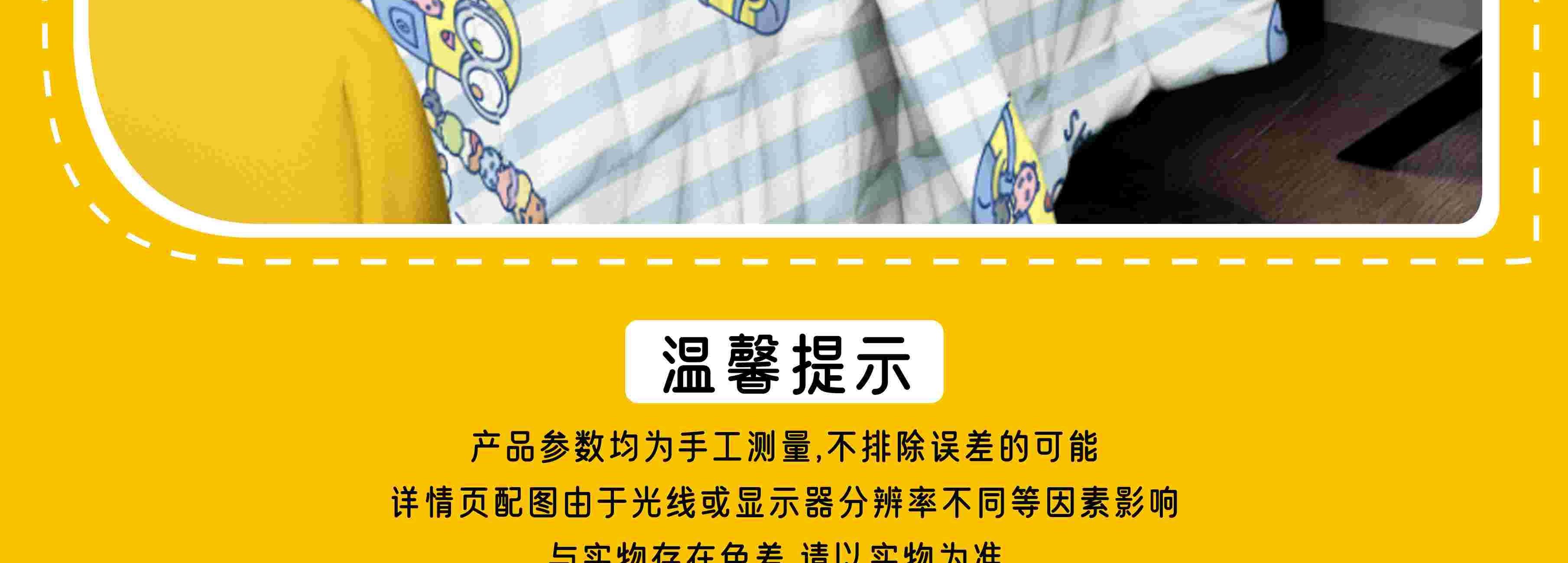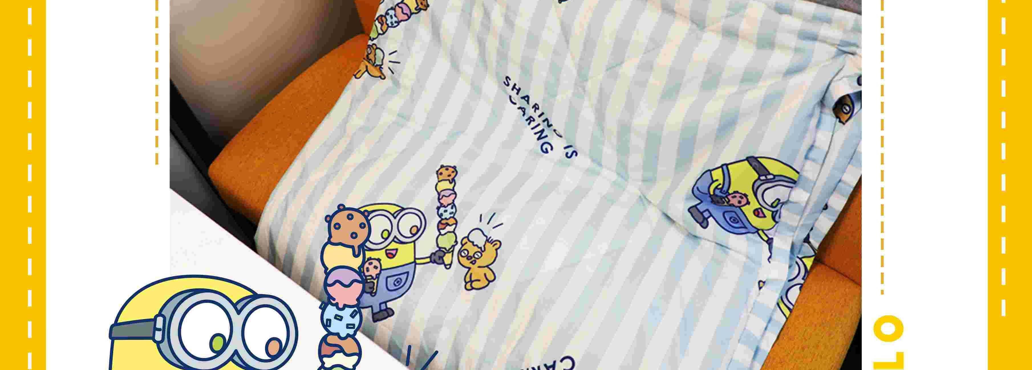 材 质:聚酯纤维 规格尺寸:150*200cm 配件明细:无纺布袋*1 吊牌*1 无纺布袋尺寸:450*350*100mm 产品净重:850g 产品毛重:930g 外箱尺寸:72*50*80cm 轻盈柔软,易于携带 当夏日的阳光变得炽热,小黄人双面夏凉被,将是你清凉入睡的好伙伴。 透气性好,能够迅速排出湿气,保持被窝内的干爽和舒适。 可直接水洗的面料和填充物,使得清洗和保养变得简单方便。