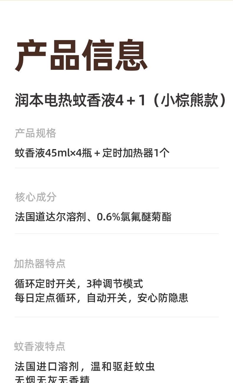 润本电热蚊香液: 法国道达尔溶剂,0.6%氯氟醚菊酯,45ml,4+1定时款