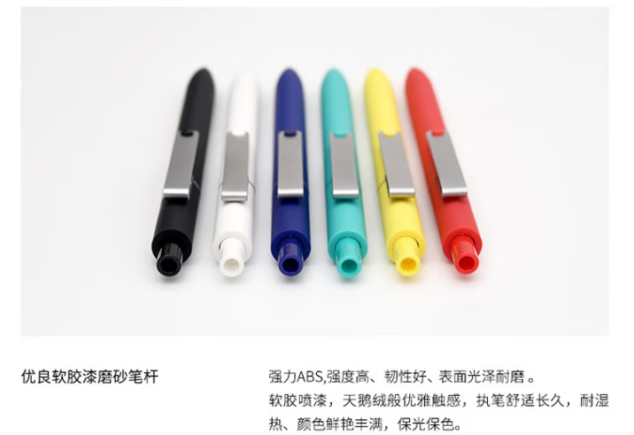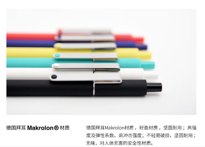 尺 寸:152*10mm 材 质:聚碳酸酯 外观颜色:黑色/白色/绿色/红色/深蓝色 1、独特笔夹设计,金属质地彰显质感,别具一格。 2、采用KEFILL双珠笔芯,书写流畅顺滑,不易断墨。 3、双倍书写长度,约800米大容量墨水,书写持久。 4、采用软胶喷漆工艺,触感细腻柔和,执笔更舒适。 定制工艺:笔夹激光Logo 笔身印刷Logo 打样周期:3-5天 货 期:7-10天发货(不含重大法定假日) 包装方式:单支OPP袋