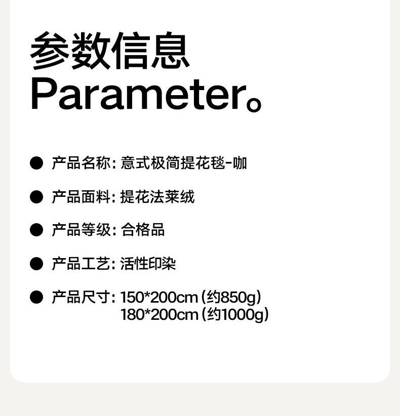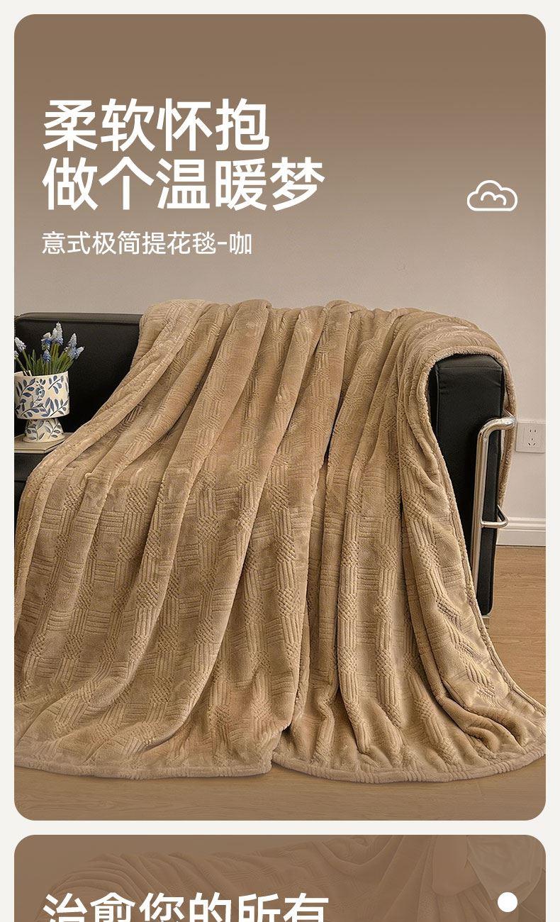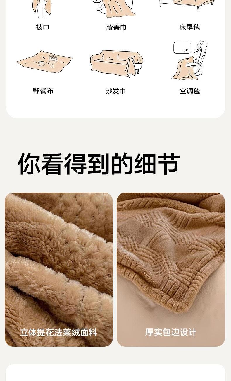 货 号 :HMT-2518 面 料 :提花法莱绒 规 格 :180*200cm 重 量 :净重约1000g 包装尺寸 :45*36*14.5cm 装 箱明细 :50条/包 1、采用提花法莱绒作为面料,触感比拟撸猫感。 2、加厚工艺,保暖性更强。 3、精致卷边,仪式感强。 4、搭配精美内袋,礼盒,彰显品 牌质感,高 端大气