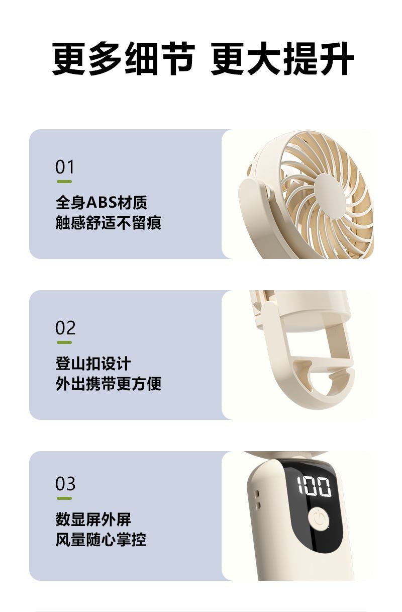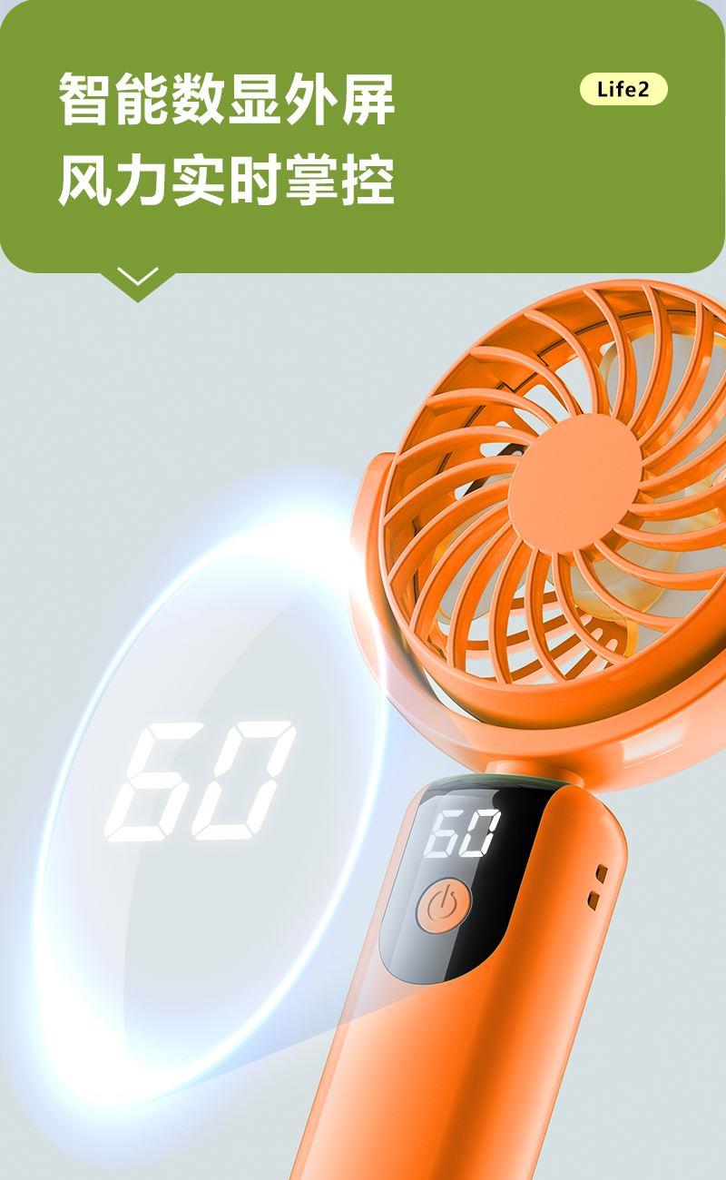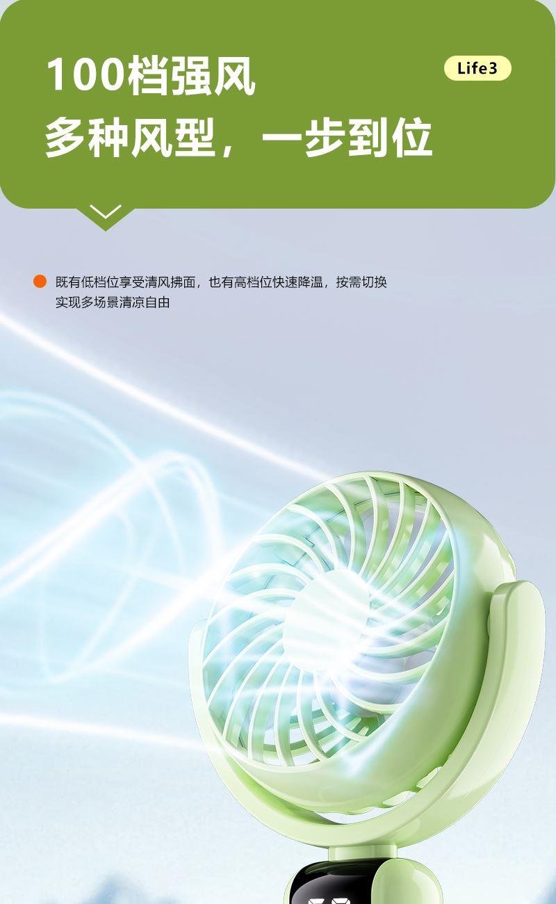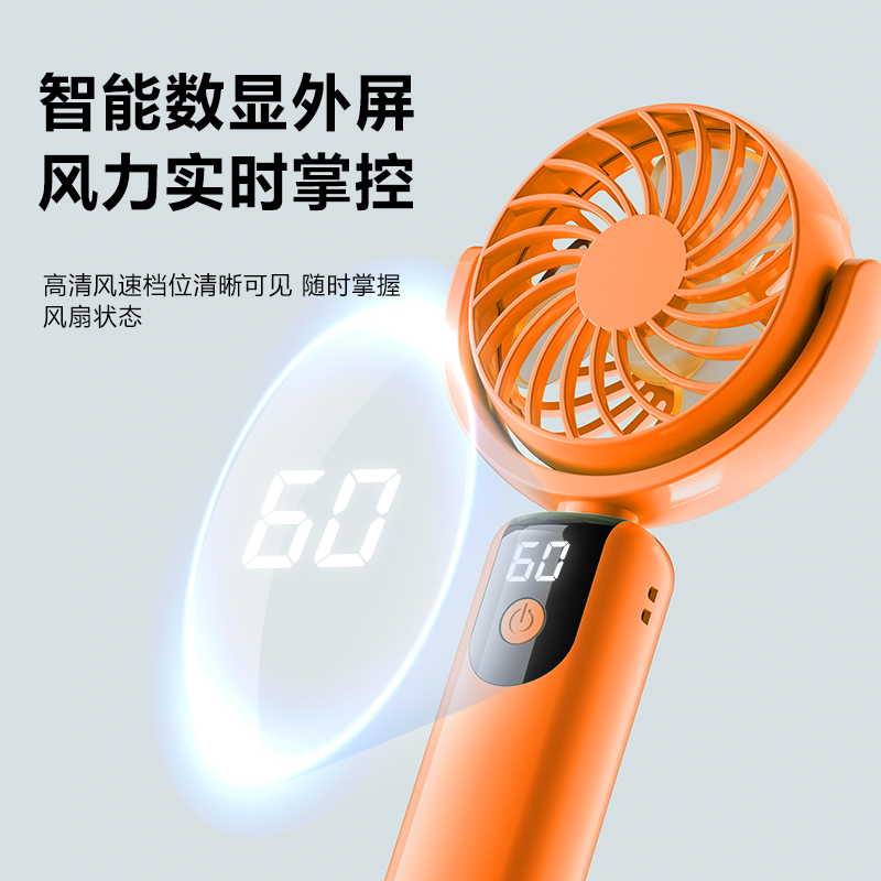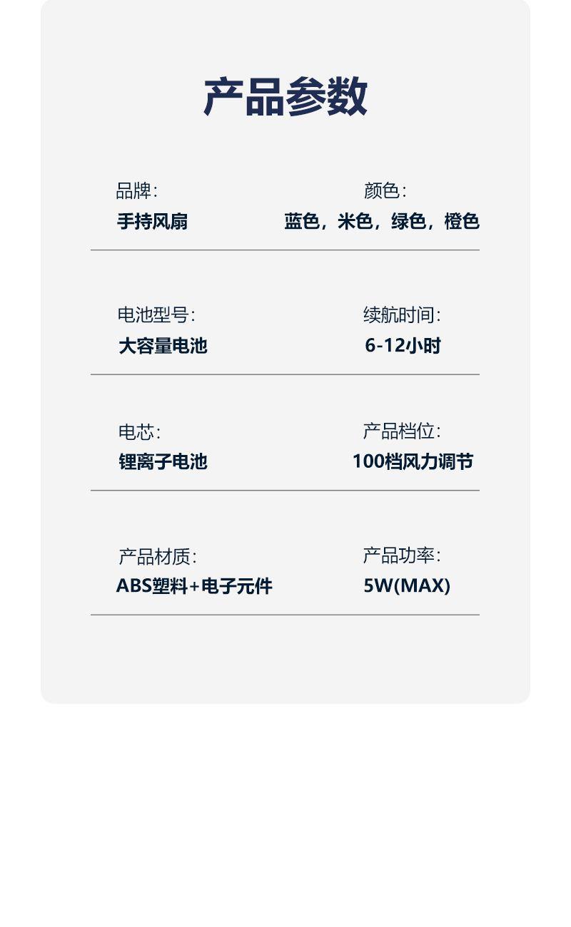 产品材质:ABS 产品功能:100档风力调节 产品容量:1200mAh 产品尺寸:218*100*36mm 产品颜色:白色,蓝色,橙色,绿色 智能数显设计,100档风速,采用高性能锂电池,续航更持久;一键开关,使用更方便;挂钩设计,升级亲肤挂钩设计,挂在背包上,钩在手上,清新自然的风一路相随。隐藏式支架,放桌面,办公,也是稳稳的。