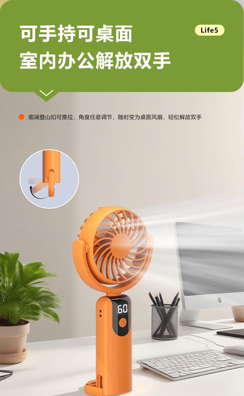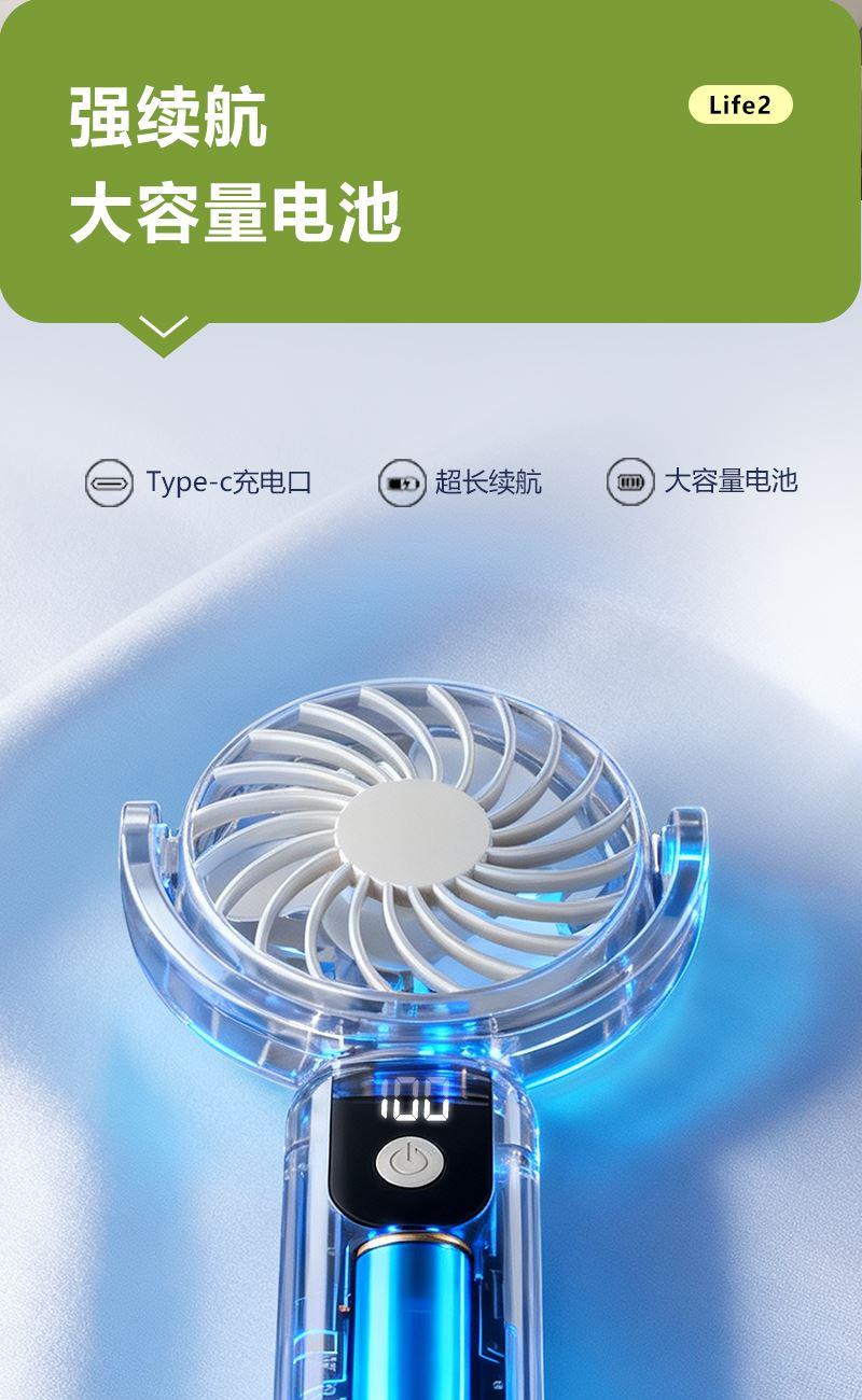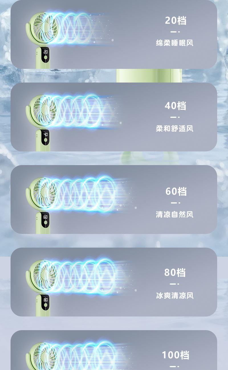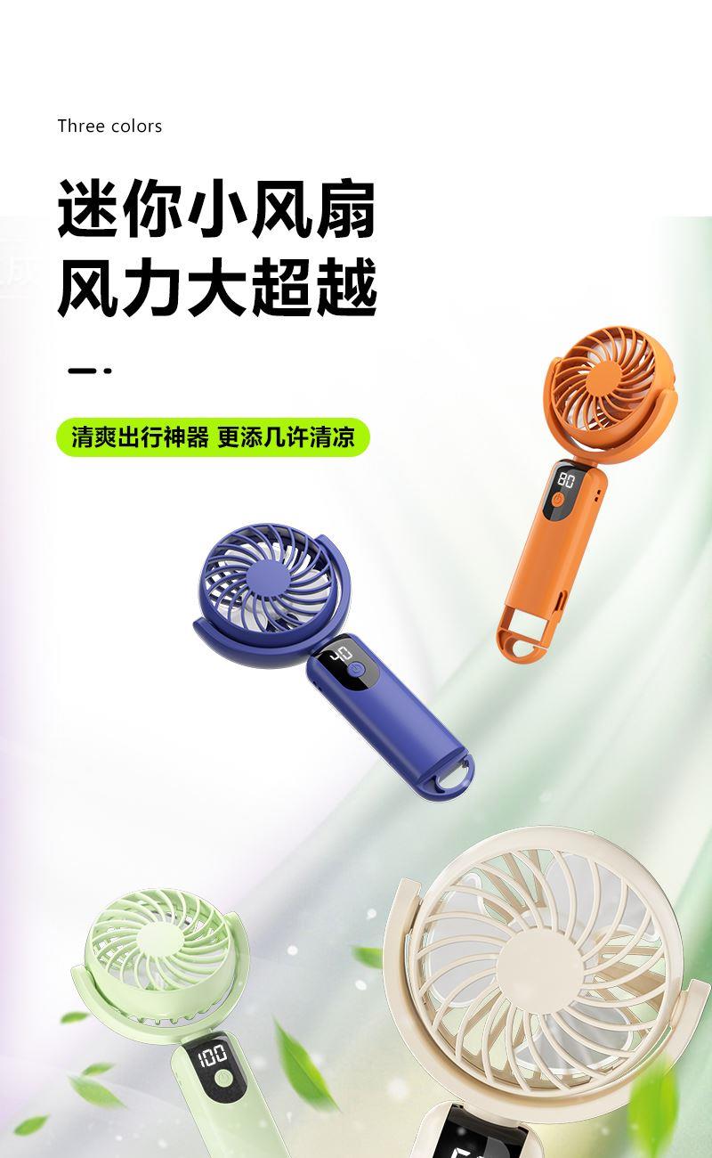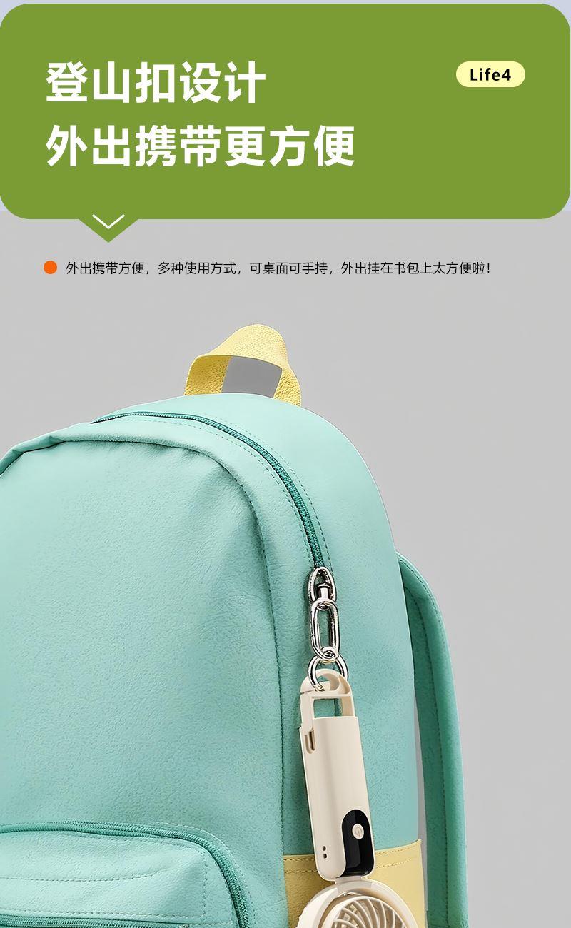 产品材质:ABS 产品功能:100档风力调节 产品容量:1200mAh 产品尺寸:218*100*36mm 产品颜色:白色,蓝色,橙色,绿色 智能数显设计,100档风速,采用高性能锂电池,续航更持久;一键开关,使用更方便;挂钩设计,升级亲肤挂钩设计,挂在背包上,钩在手上,清新自然的风一路相随。隐藏式支架,放桌面,办公,也是稳稳的。