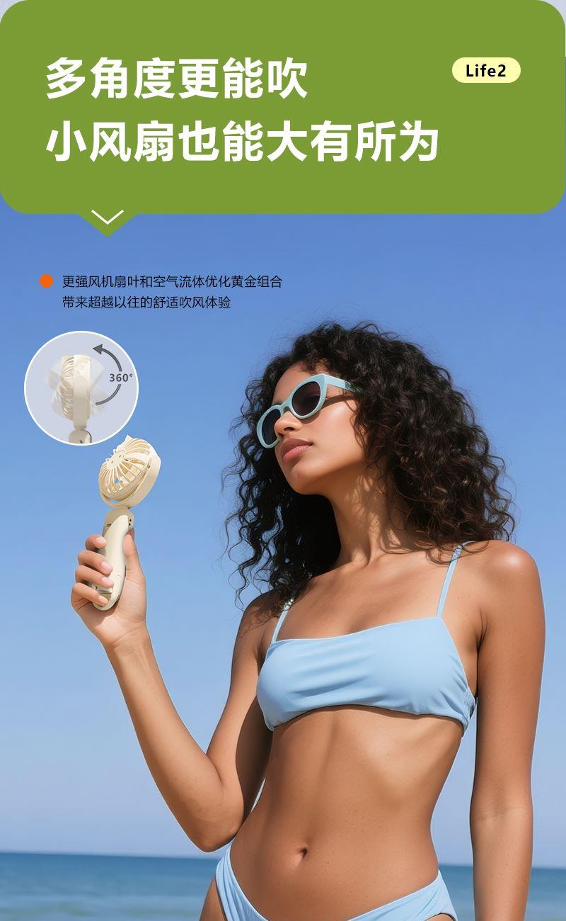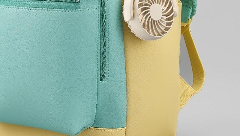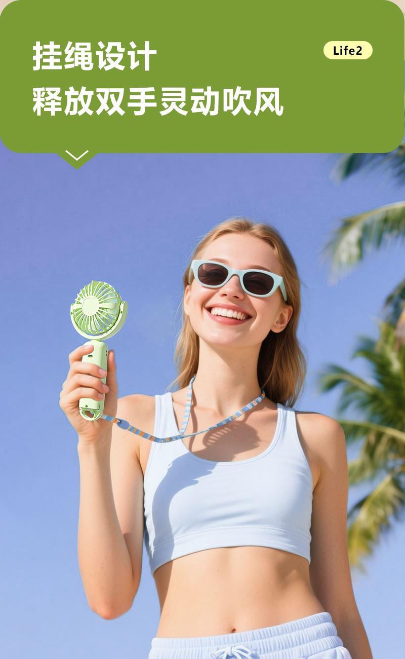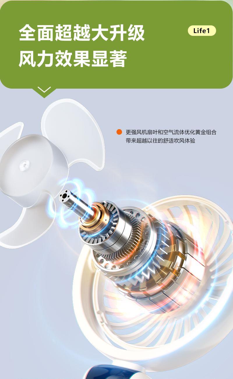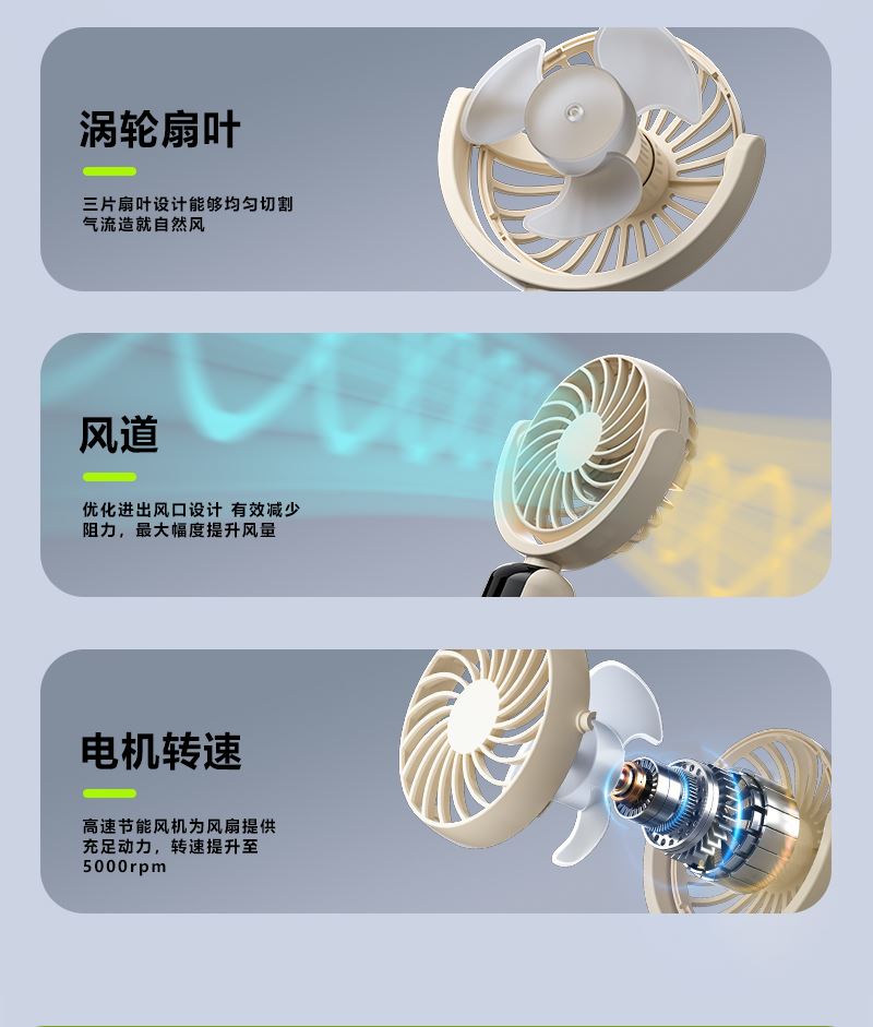 产品材质:ABS 产品功能:100档风力调节 产品容量:1200mAh 产品尺寸:218*100*36mm 产品颜色:白色,蓝色,橙色,绿色 智能数显设计,100档风速,采用高性能锂电池,续航更持久;一键开关,使用更方便;挂钩设计,升级亲肤挂钩设计,挂在背包上,钩在手上,清新自然的风一路相随。隐藏式支架,放桌面,办公,也是稳稳的。