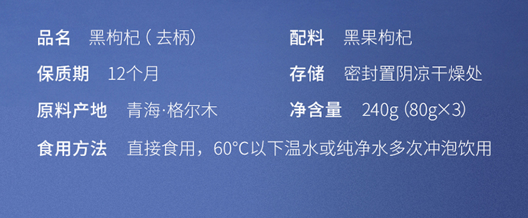 品 名:黑枸杞(去柄) 配料:黑果枸杞 保质期:12个月 存储:密封置阴凉干燥处净含量 240g(80gX3) 原料产地:青海·格尔木 食用方法:直接食用,60°C以下温水或纯净水多次冲泡饮用