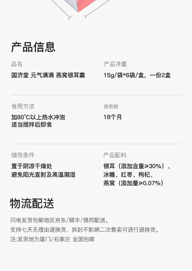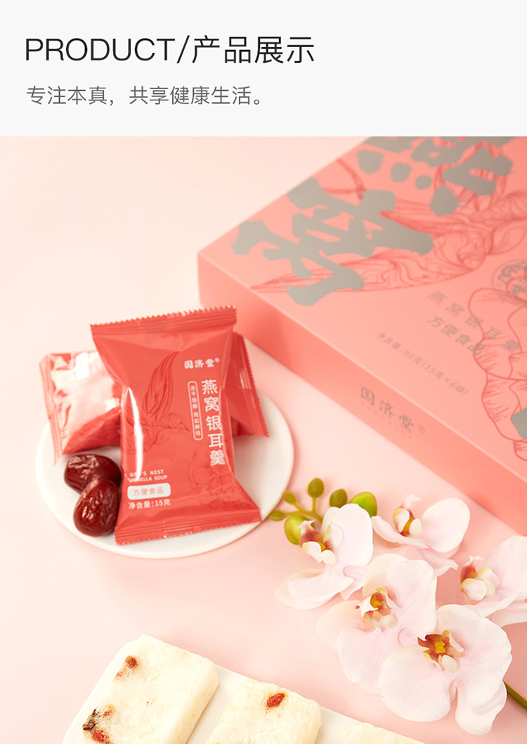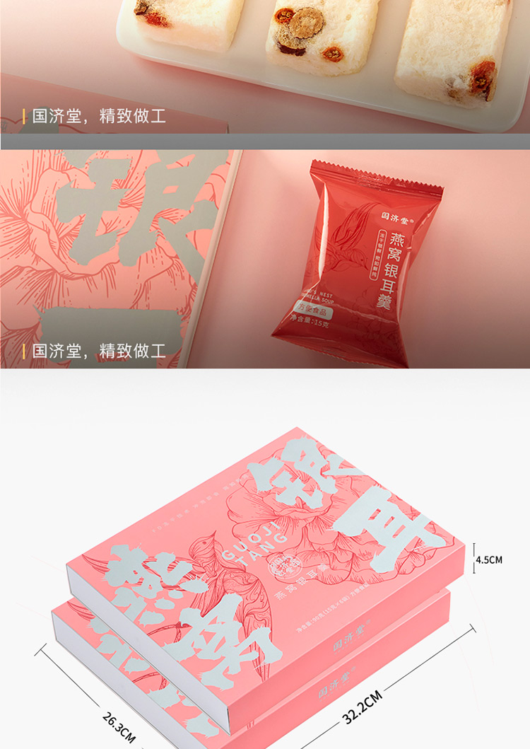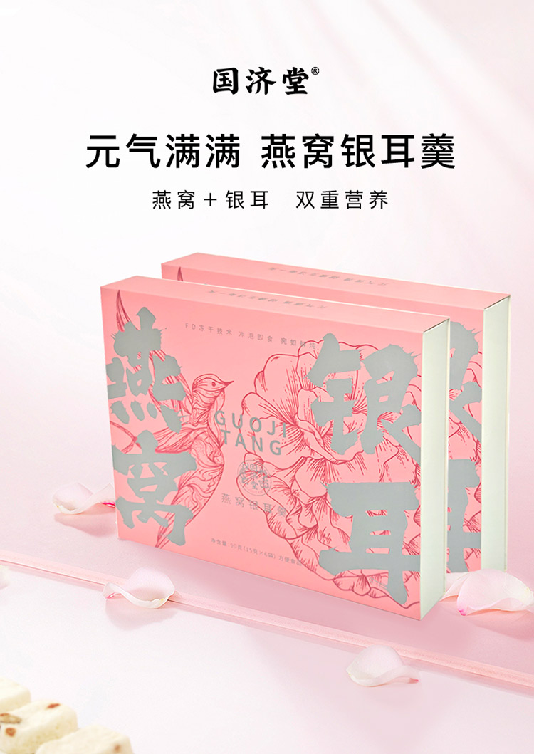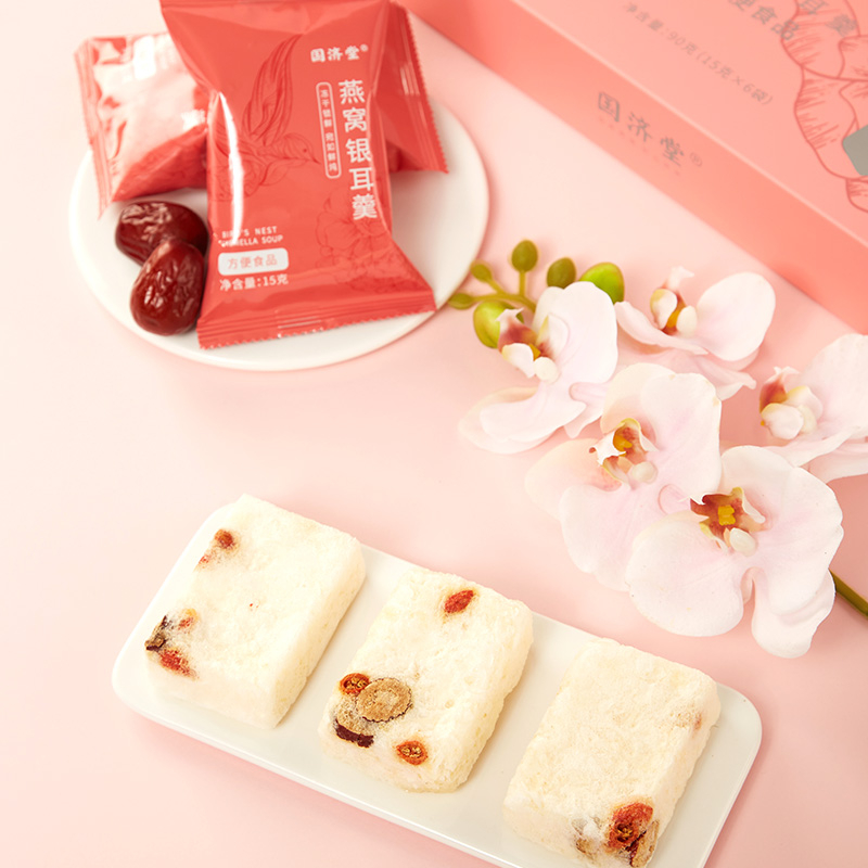 规格:冻干燕窝银耳羹15克/袋*6袋/盒*2盒 (银耳含量≥30%、燕窝含量≥0.07%) 配料:银耳、冰糖、红枣、枸杞、燕窝 食用方法:将产品拆包放于杯中,加入200-250mL开水,冲泡搅拌均匀即可食用,静置2分钟后口感更佳。 保质期:18个月净含量:90克/盒*2盒 国济堂自行开发设计的年轻化、潮流化新产品——燕窝银耳羹。随着社会生活的快节奏发展,冻干产品的需求越来越多,本款采用暖粉+银配色,更年轻更时尚。 真材实料的搭配,银耳、红枣、枸杞等肉眼可见