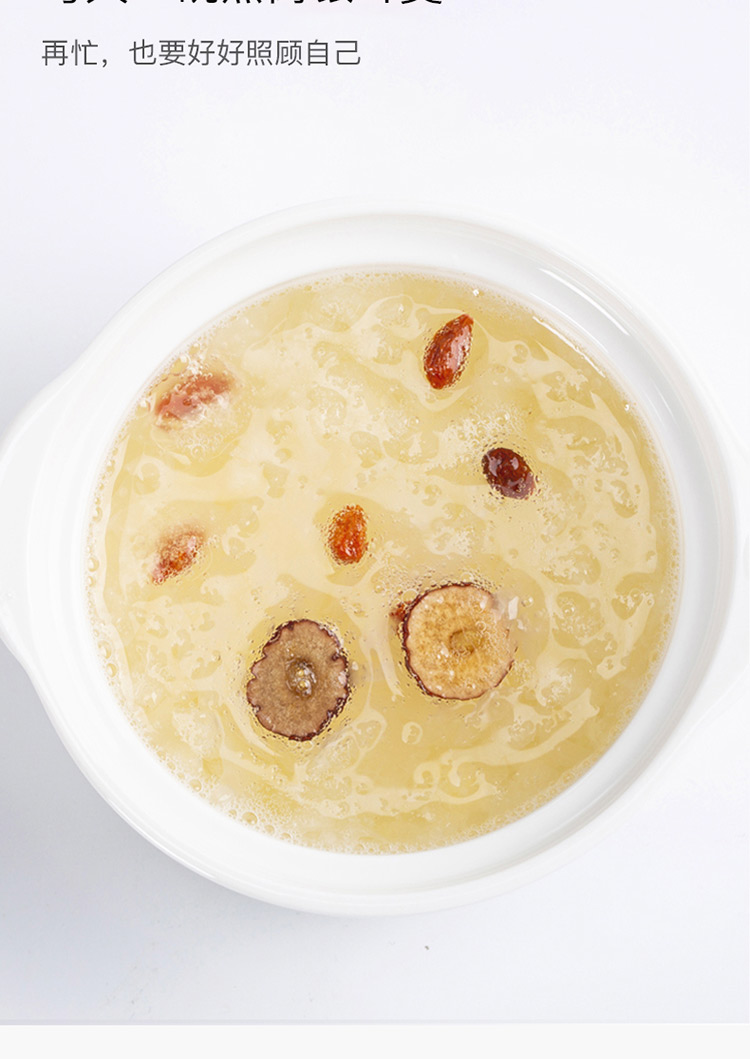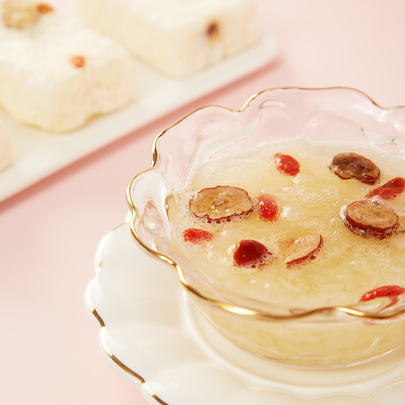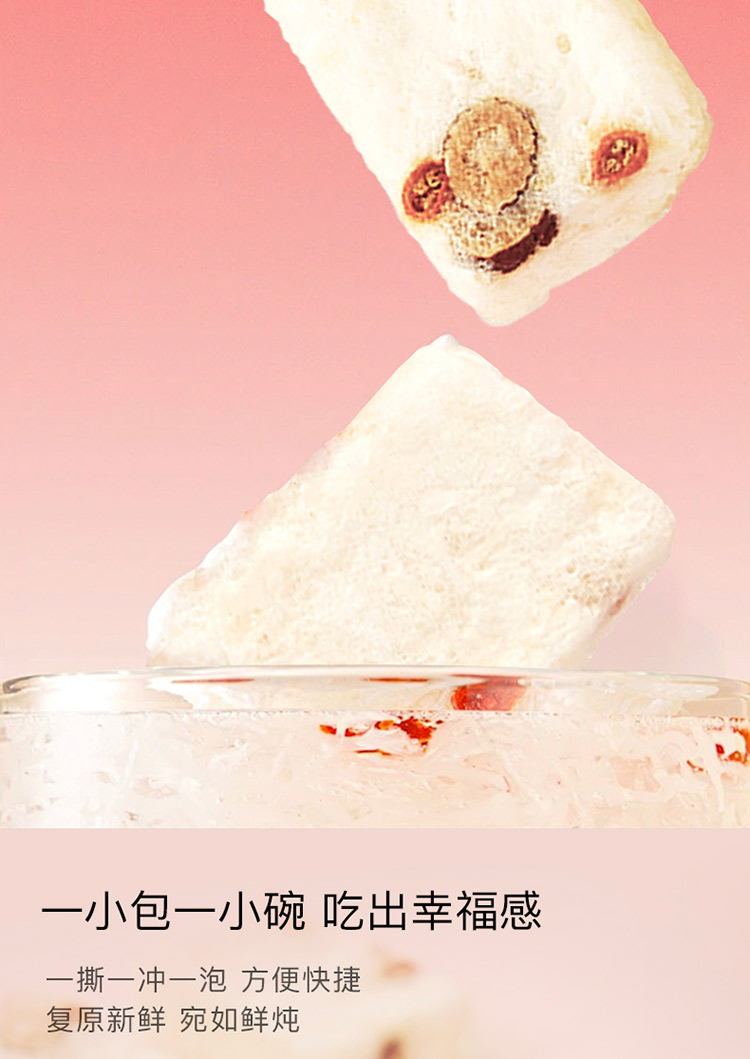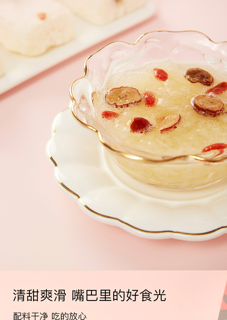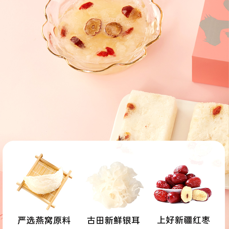 规格:冻干燕窝银耳羹15克/袋*6袋/盒*2盒 (银耳含量≥30%、燕窝含量≥0.07%) 配料:银耳、冰糖、红枣、枸杞、燕窝 食用方法:将产品拆包放于杯中,加入200-250mL开水,冲泡搅拌均匀即可食用,静置2分钟后口感更佳。 保质期:18个月净含量:90克/盒*2盒 国济堂自行开发设计的年轻化、潮流化新产品——燕窝银耳羹。随着社会生活的快节奏发展,冻干产品的需求越来越多,本款采用暖粉+银配色,更年轻更时尚。 真材实料的搭配,银耳、红枣、枸杞等肉眼可见