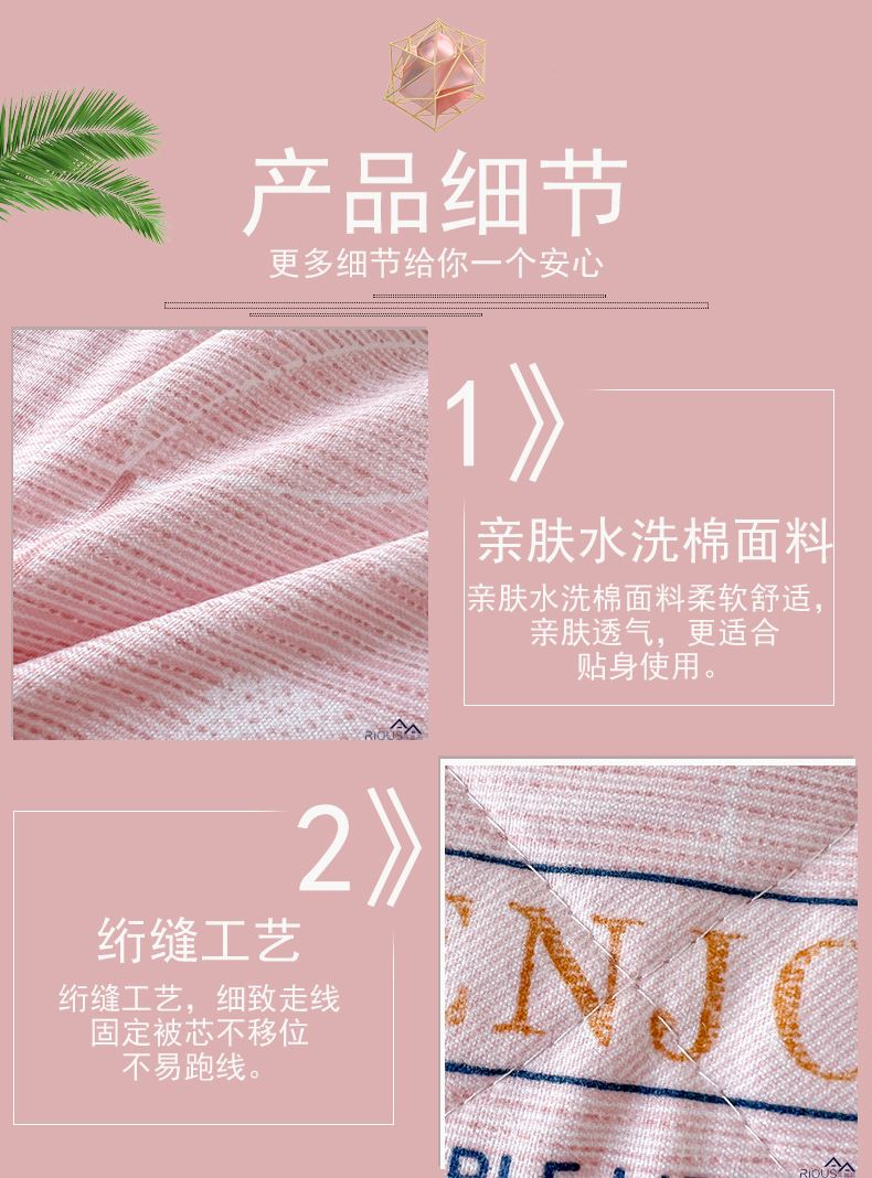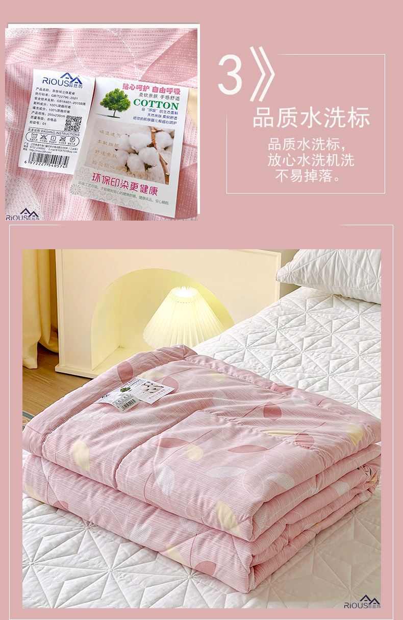 2.整张羽丝绒填充,整张棉更加平整挺括,更加耐用,长期使用都不用担心内芯缠绕导致结块结板,更不用担心跑棉的问题,久用也能保持蓬松。直接机洗手洗均可以