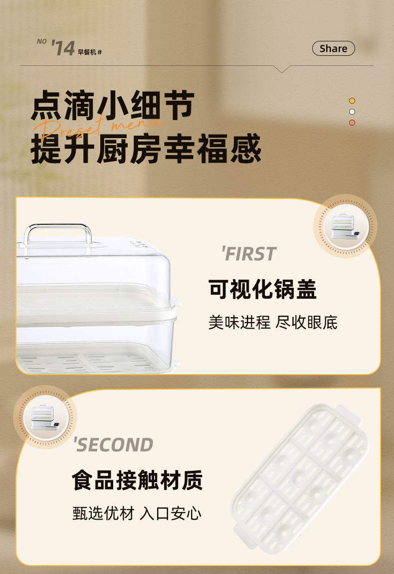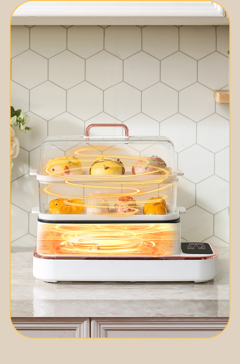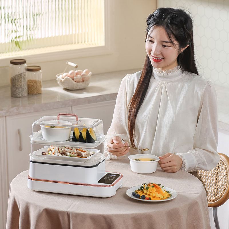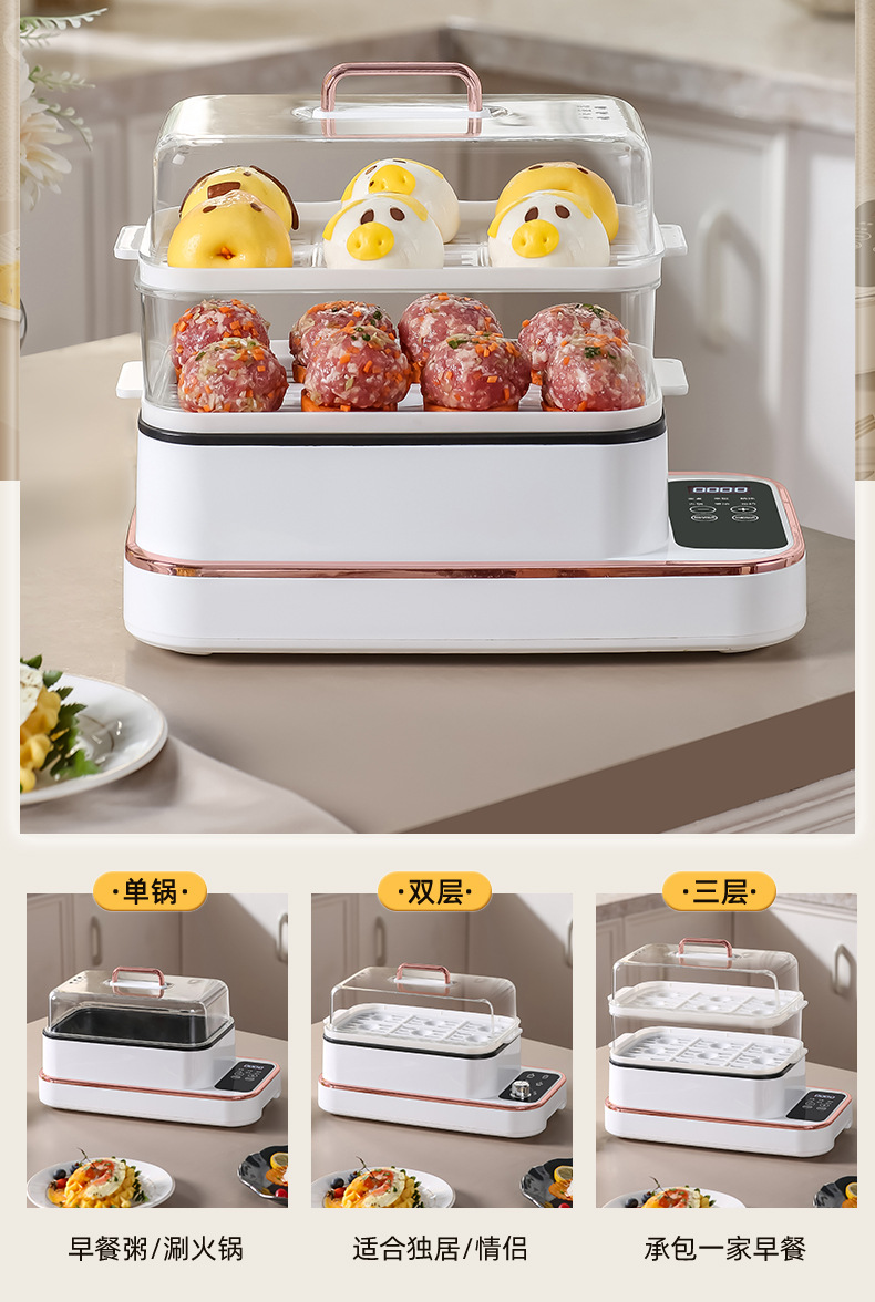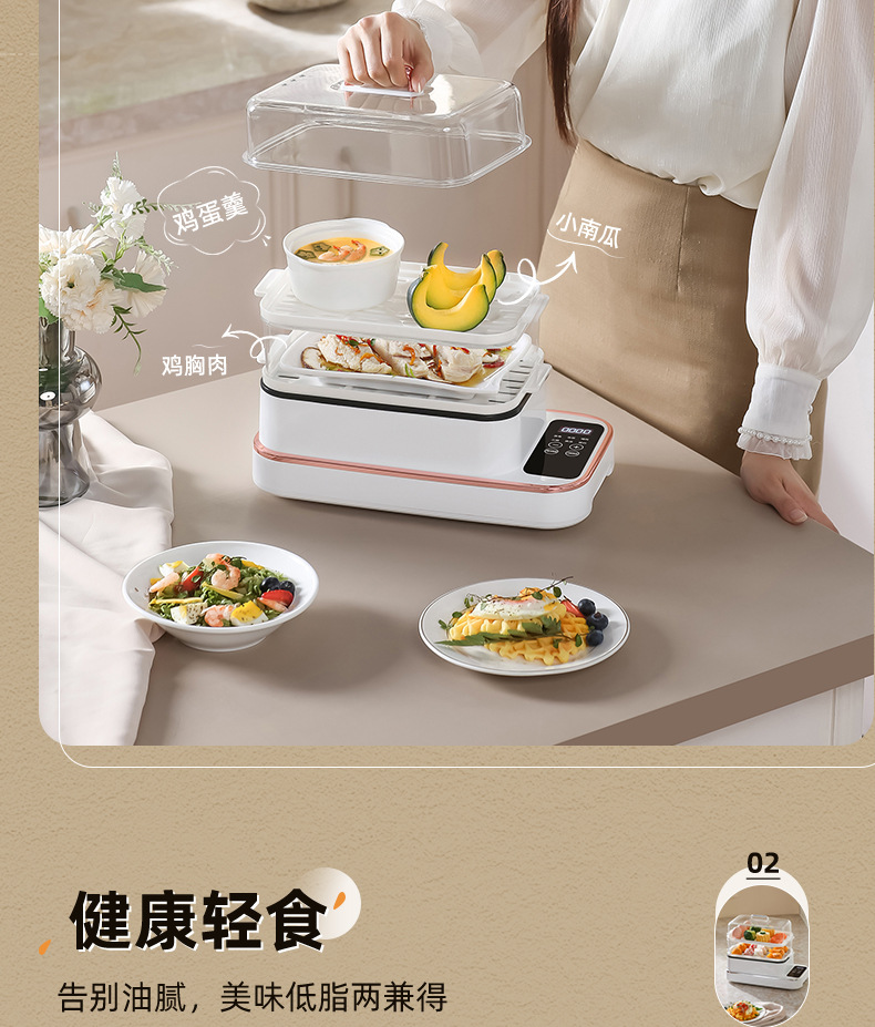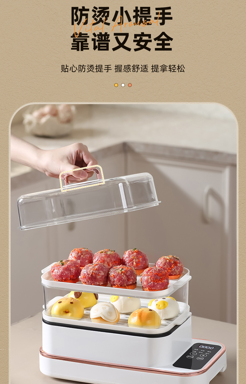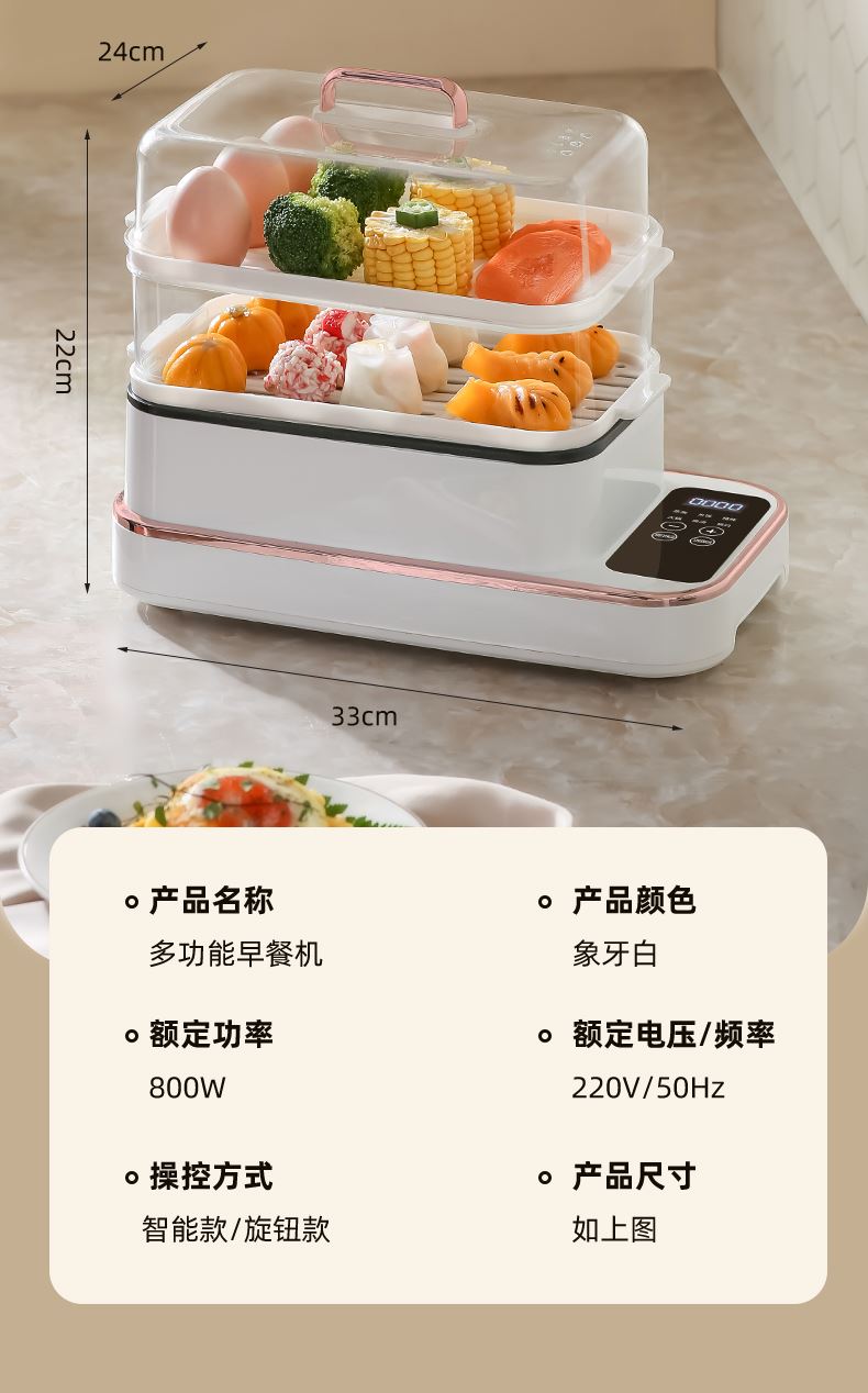 额定功率:800W 额定电压:220V 产品颜色:白色 主机容量:5.8L 产品款式:智能款 产品规格:2L蒸笼自有组合 包装清单:主机、透明盖、PP蒸格、电源线、说明书 特色功能 1、巧设导流孔蒸格,科学排水不浸水;底部多孔散热,保证烹饪安全; 2、可视化蒸盖,烹煮过程更好掌握火候;镀金提手,隔层隔热不会烫手; 3、可分离电线,清洗方便,安全使用;主机容量2L,蒸笼自有组合; 4、800W大功率,烹饪无需等待;食品级PP材质,耐高温不易变形,耐酸,耐磨不易碎; 5、支持10小时预约和8小时保温;360°整圈发热,受热均匀不易焦; 6、自动断电,防干烧功能;一机多用,可用于婴儿用品高温蒸汽消毒更安全;