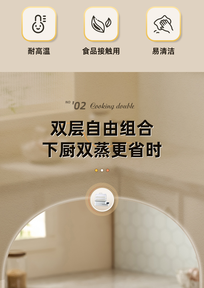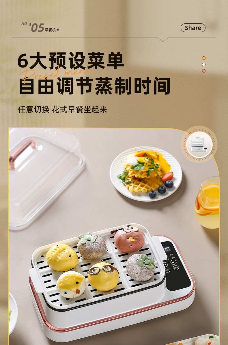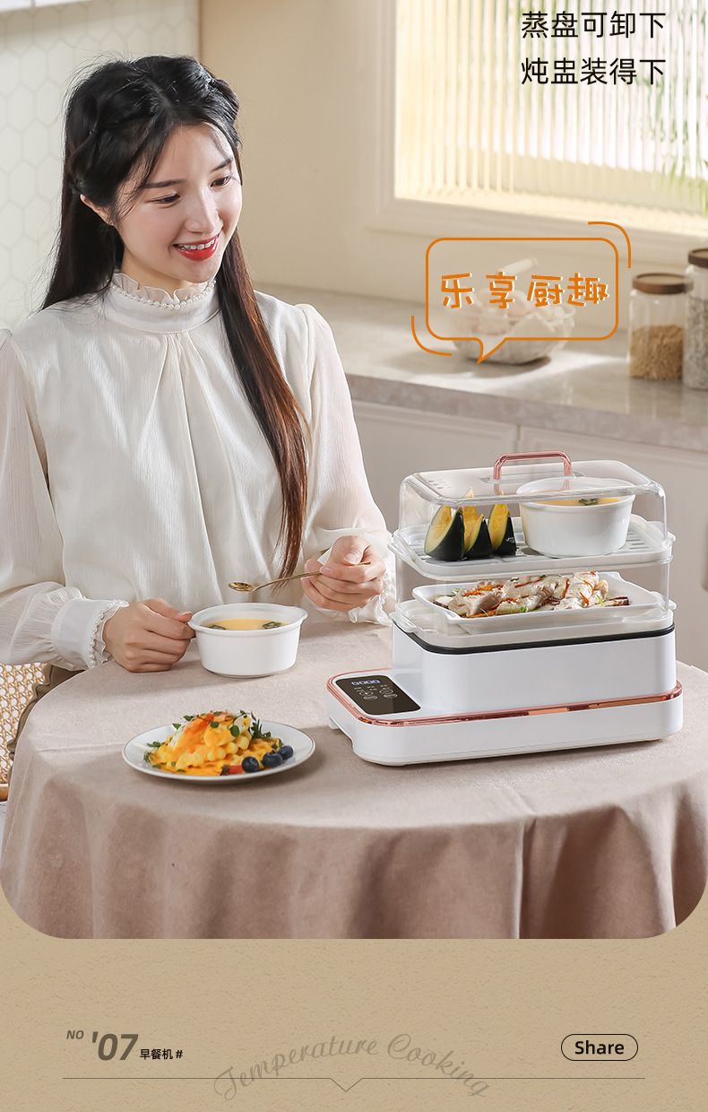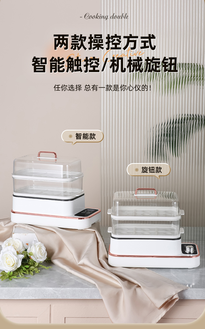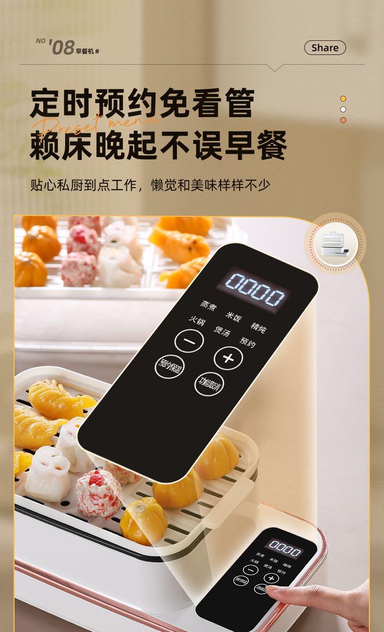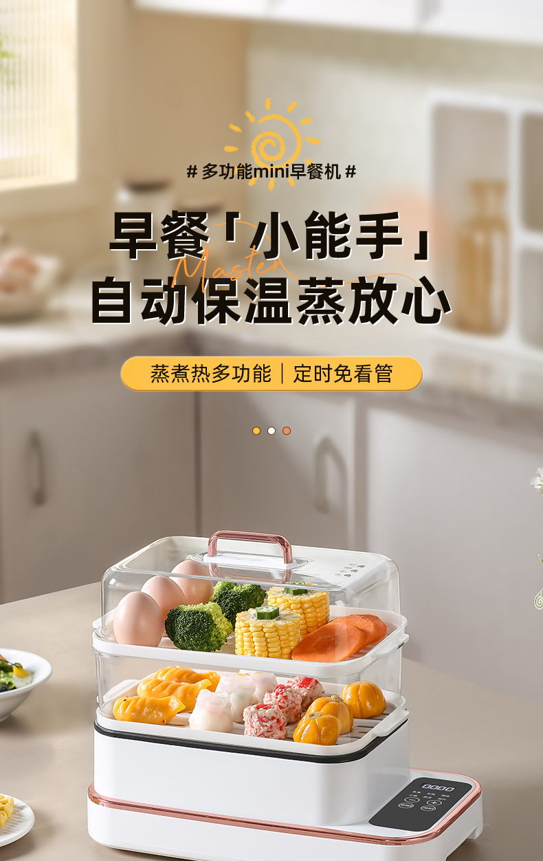 额定功率:800W 额定电压:220V 产品颜色:白色 主机容量:5.8L 产品款式:智能款 产品规格:2L蒸笼自有组合 包装清单:主机、透明盖、PP蒸格、电源线、说明书 特色功能 1、巧设导流孔蒸格,科学排水不浸水;底部多孔散热,保证烹饪安全; 2、可视化蒸盖,烹煮过程更好掌握火候;镀金提手,隔层隔热不会烫手; 3、可分离电线,清洗方便,安全使用;主机容量2L,蒸笼自有组合; 4、800W大功率,烹饪无需等待;食品级PP材质,耐高温不易变形,耐酸,耐磨不易碎; 5、支持10小时预约和8小时保温;360°整圈发热,受热均匀不易焦; 6、自动断电,防干烧功能;一机多用,可用于婴儿用品高温蒸汽消毒更安全;