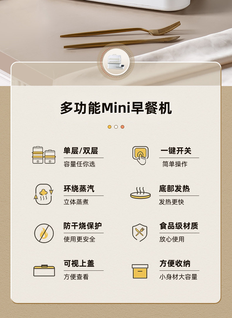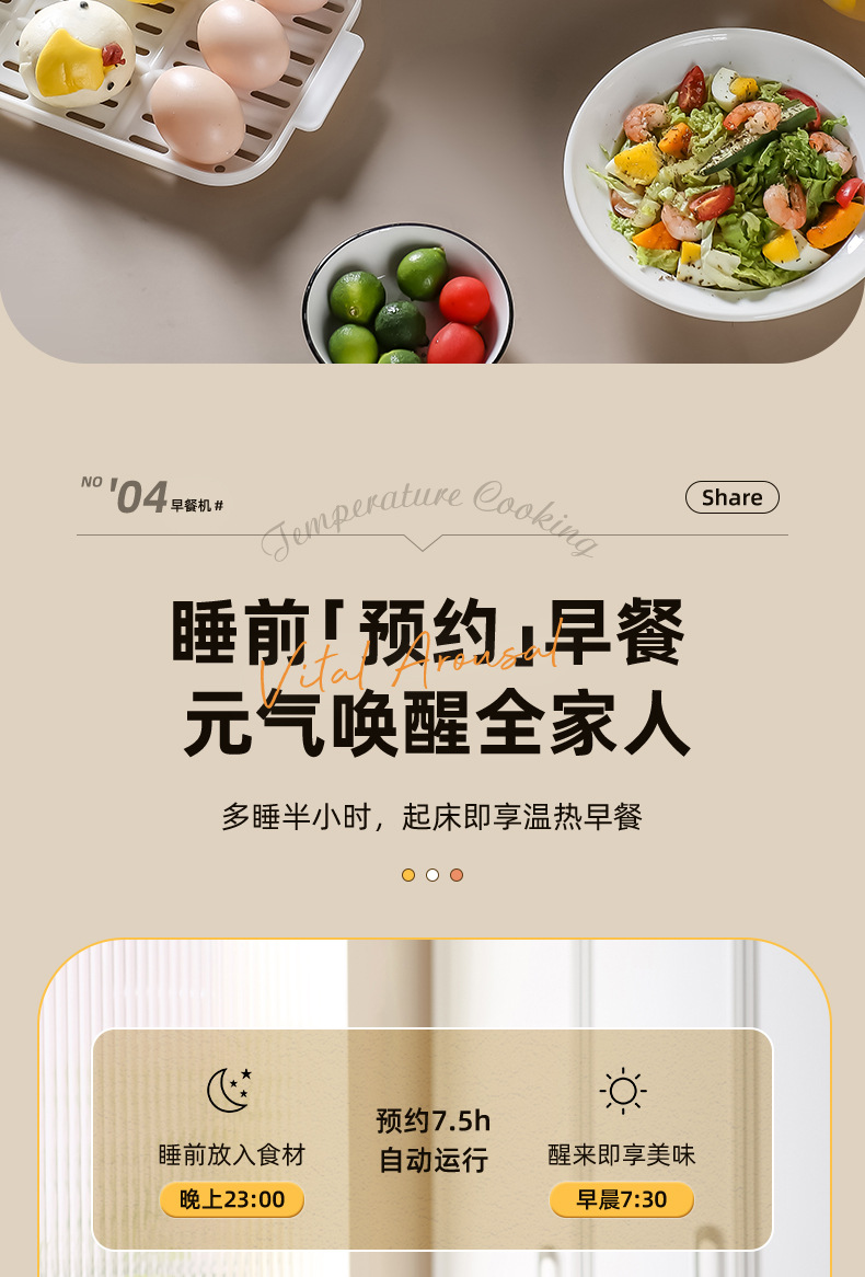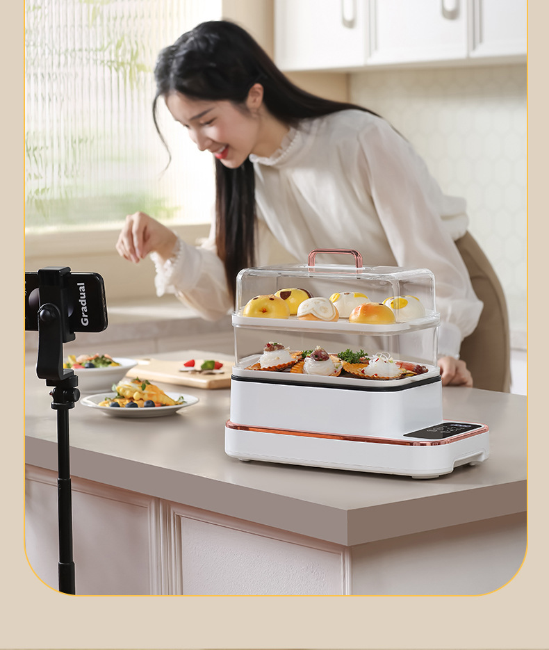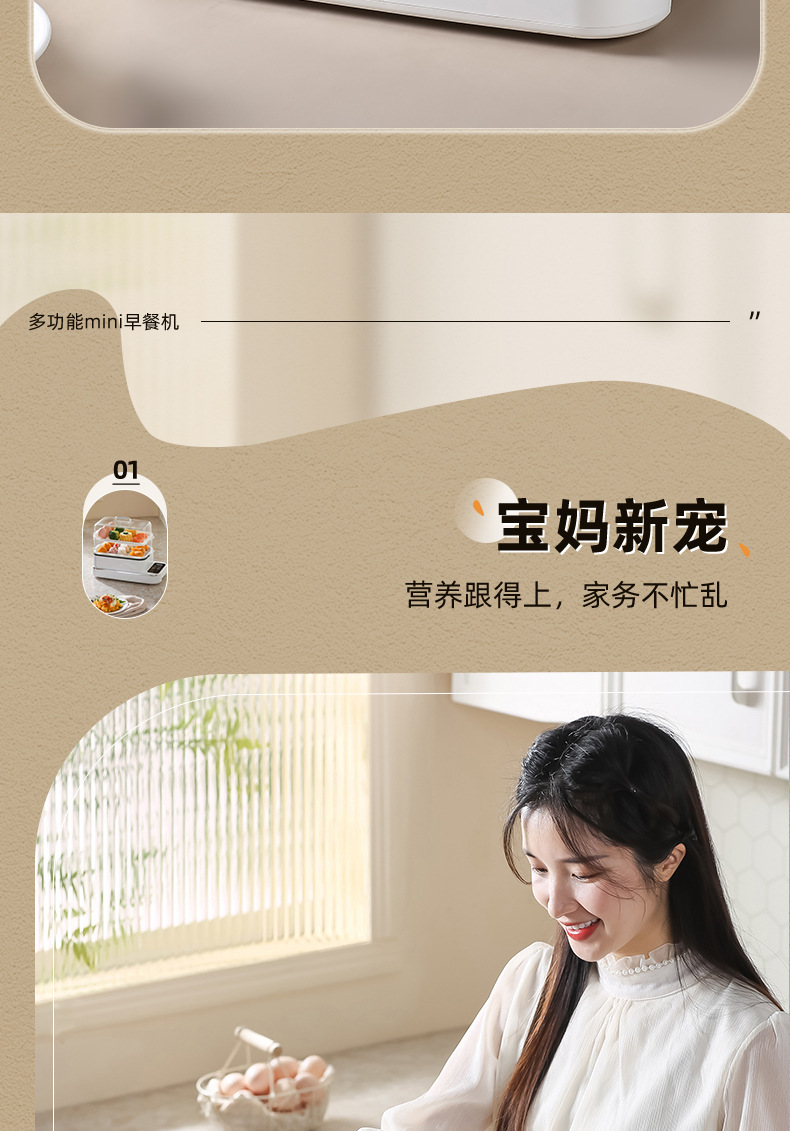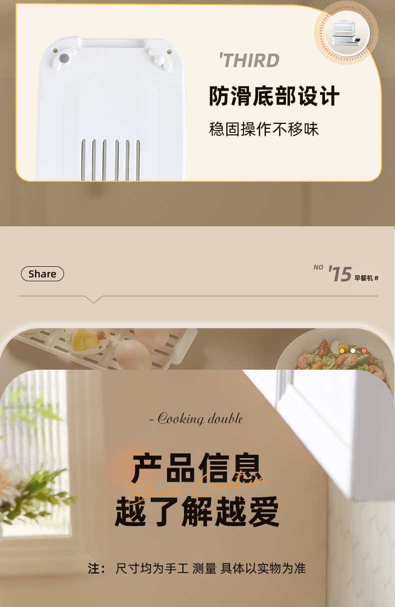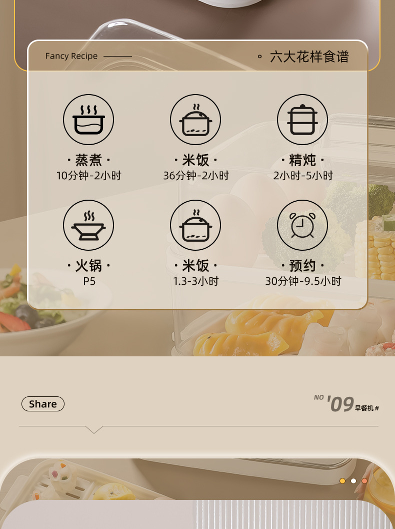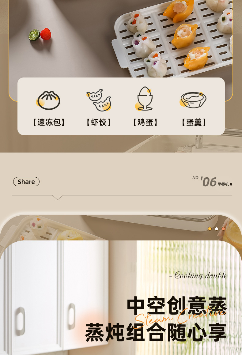 额定功率:800W 额定电压:220V 产品颜色:白色 主机容量:5.8L 产品款式:智能款 产品规格:2L蒸笼自有组合 包装清单:主机、透明盖、PP蒸格、电源线、说明书 特色功能 1、巧设导流孔蒸格,科学排水不浸水;底部多孔散热,保证烹饪安全; 2、可视化蒸盖,烹煮过程更好掌握火候;镀金提手,隔层隔热不会烫手; 3、可分离电线,清洗方便,安全使用;主机容量2L,蒸笼自有组合; 4、800W大功率,烹饪无需等待;食品级PP材质,耐高温不易变形,耐酸,耐磨不易碎; 5、支持10小时预约和8小时保温;360°整圈发热,受热均匀不易焦; 6、自动断电,防干烧功能;一机多用,可用于婴儿用品高温蒸汽消毒更安全;