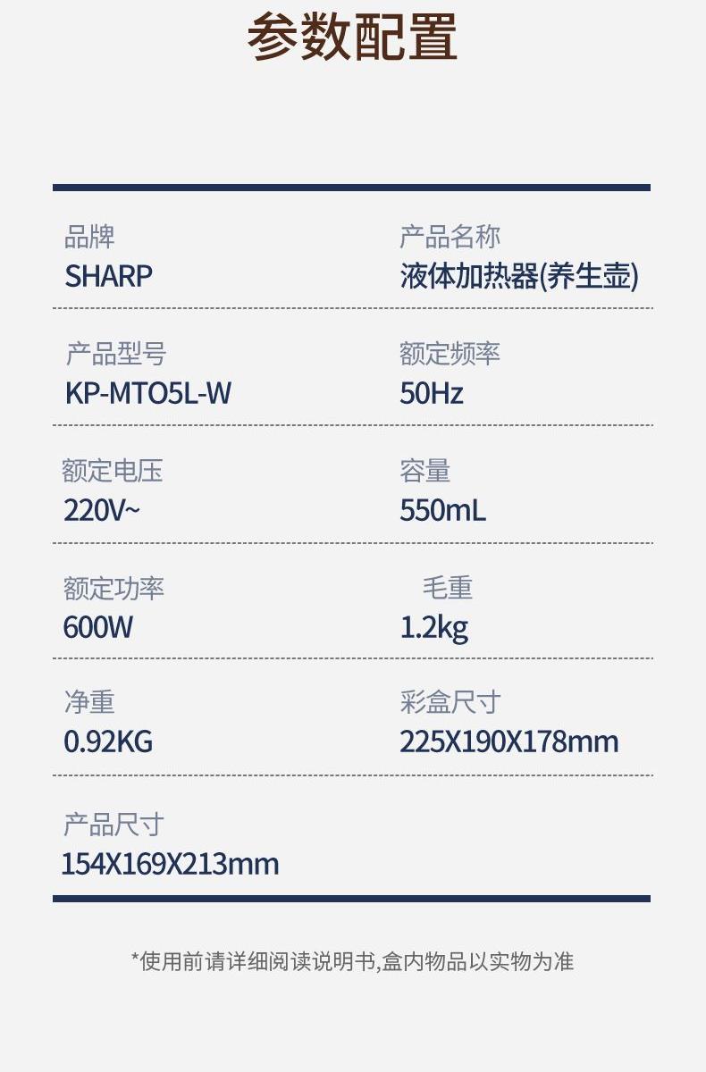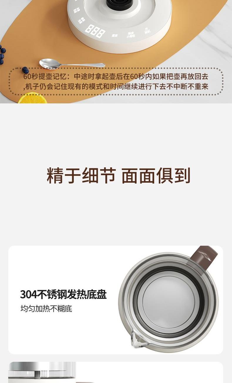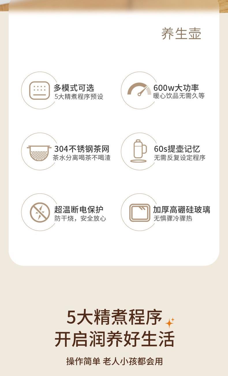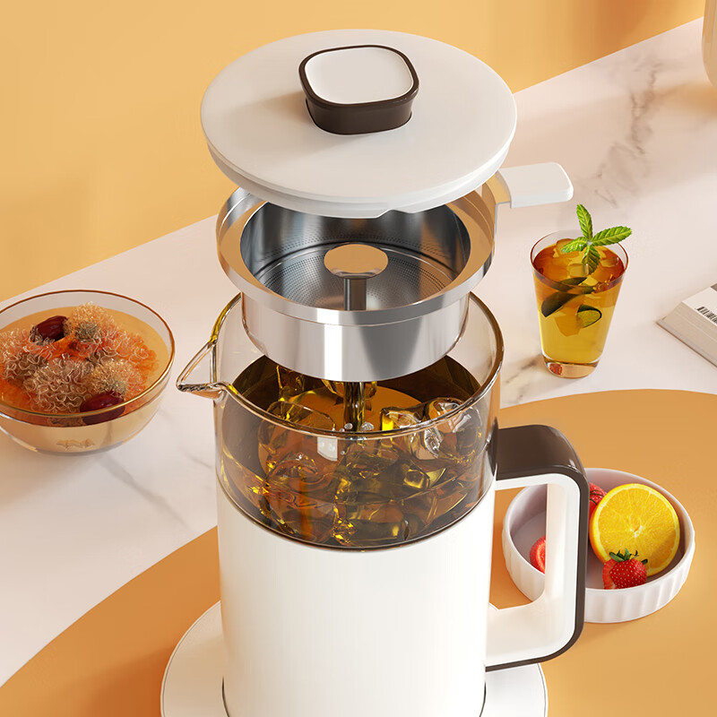 产品颜色:白色 产品材质:PP、高硼硅玻璃、304不锈钢 额定频率:50Hz 额定电压:220V~ 额定功率:600W 产品容量:550mL 产品尺寸:154x169x213mm 产品净重:0.92KG 商品条形码:6971849440392 多种模式可选,5大精煮程序预设。 304不锈钢茶网,茶水分离喝茶不喝渣。 超温断电保护,防干烧,安全放心。 60S提壶记忆,无需设定程序。 加厚高硼硅玻璃,无惧骤冷骤热。 600W速热功率,饮品无需久等。