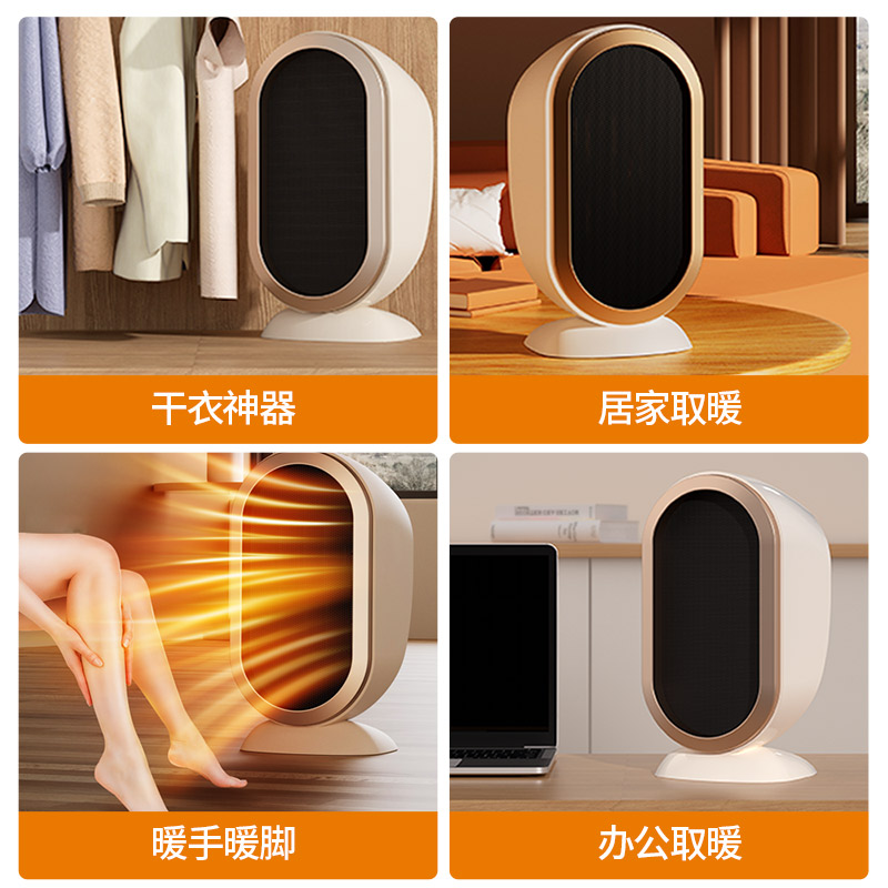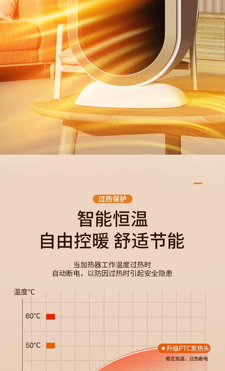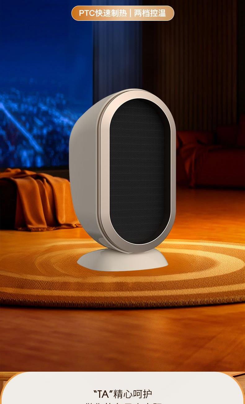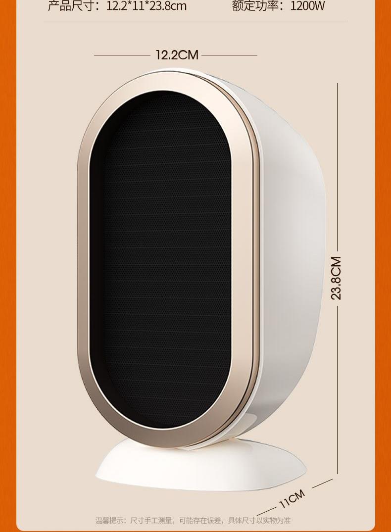产品档位:恒温热风/高温热风 产品颜色:米色/白色 产品尺寸:12.2*11*23.8cm 额定功率:1200W PTC 陶瓷 1200W 强速制热:大功率陶瓷发热体,开机即热不等待,快速驱散寒意,暖感直达全身​ 广角全域覆盖:加宽散热角度设计,热气均匀扩散至全屋,避免局部冷热不均,客厅、卧室都能暖到 智能 NEC 温控 + 倾倒秒断电:双重安全防护,温度过高自动控温,机器倾倒瞬间断电,老人、小孩使用也放心​ 一键启动 + 2 档控温:操作简单不复杂,一键开启取暖模式,高低两档温度可调节,满足不同暖感需求​ 低噪静音运行:工作时噪音30-40分贝,不打扰休息、办公,取暖同时保持环境安静提手式便携设计:机身自带提手,重量轻、易搬运,卧室、客厅、办公室之间灵活移动​ 多场景适配:居家取暖暖全身、办公暖脚不冻手、睡前烘衣更方便,一人拥有,全家受益