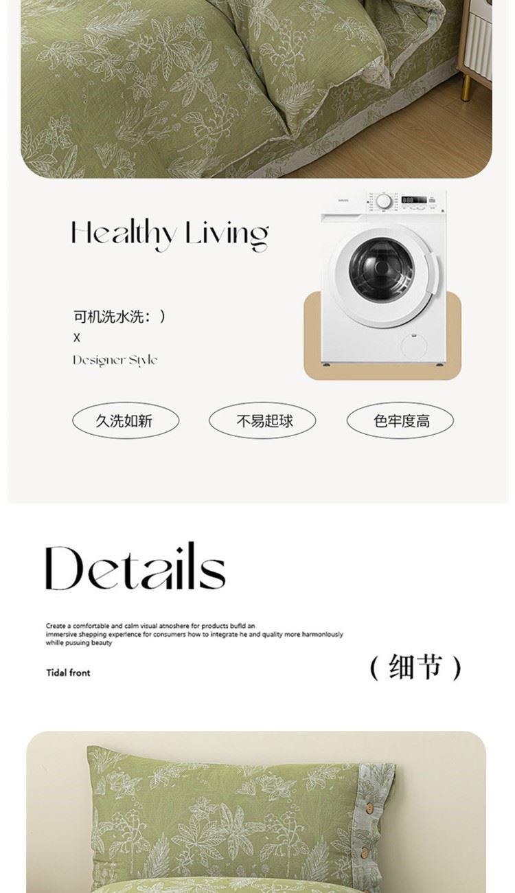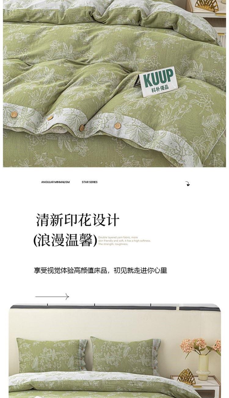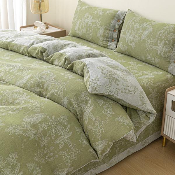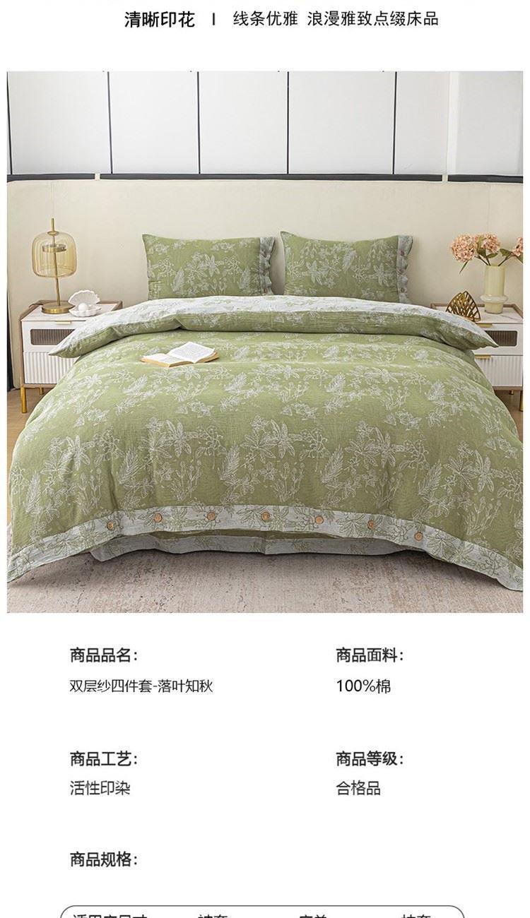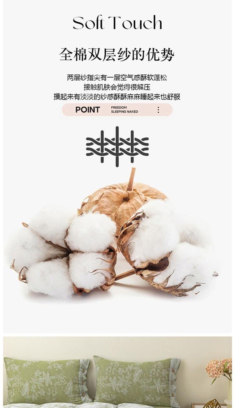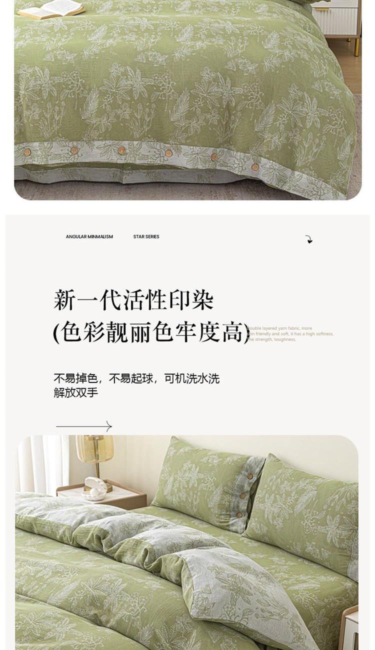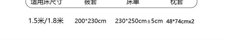 规格: 床单:230*250cm±5cm 被罩:200*230cm 枕套:48*74cmx2 面料:棉 1.纯棉双层面料,贴身的更要精挑细选 2.活性印染工艺,健康环保,无甲醛,无致癌物 3.色调清新有层次,吸湿亲肤舒适,轻薄透气,缩水率低
