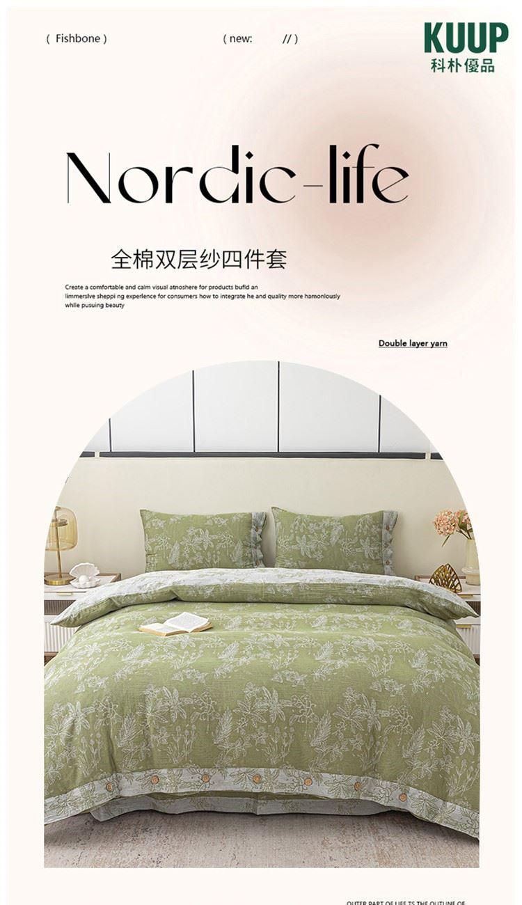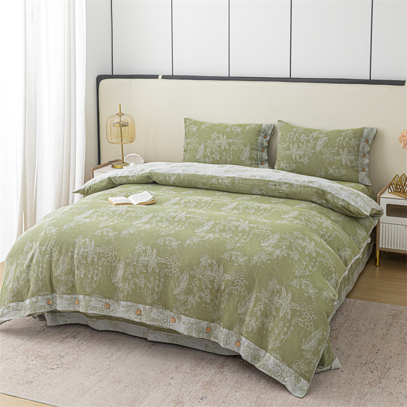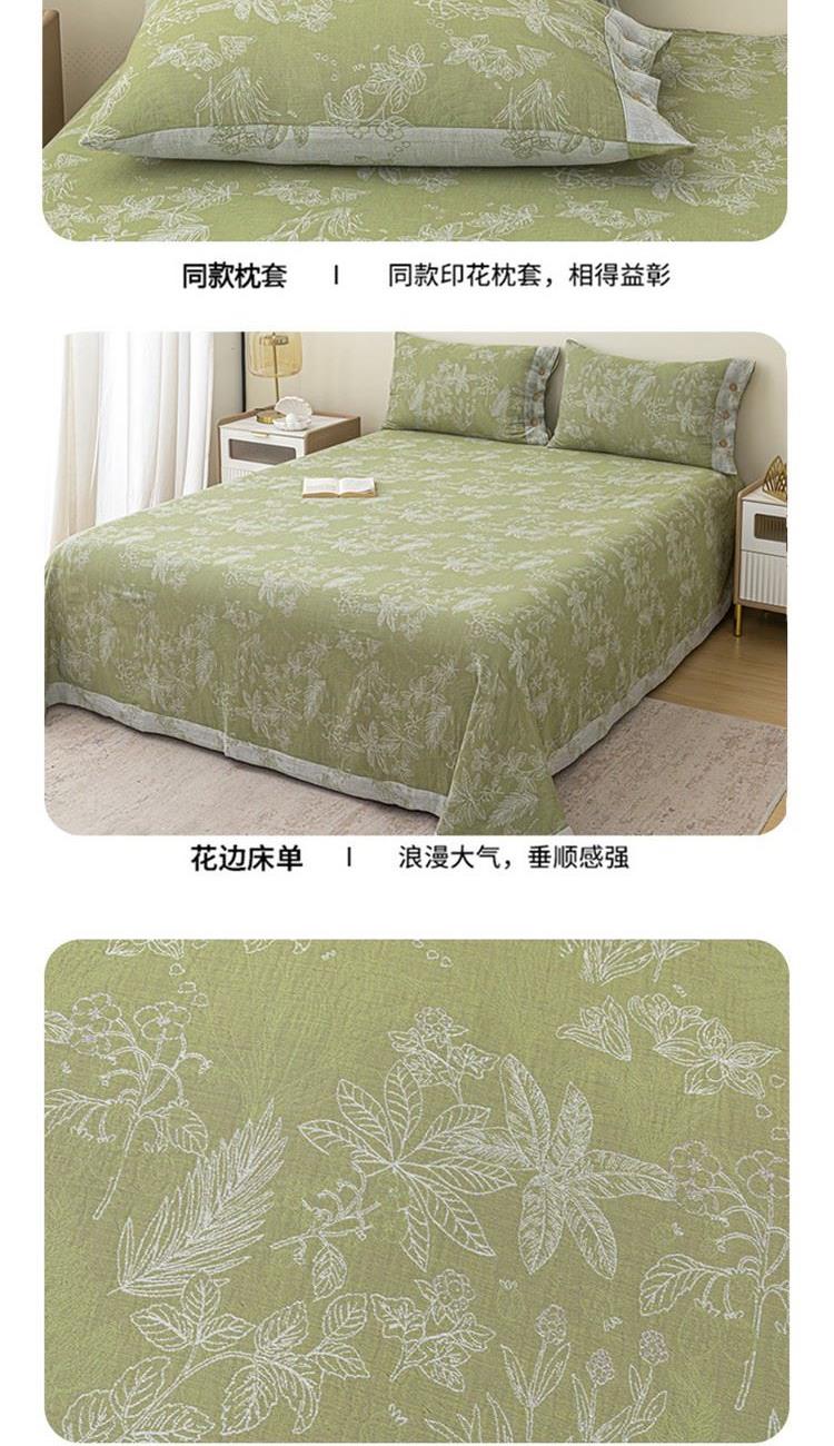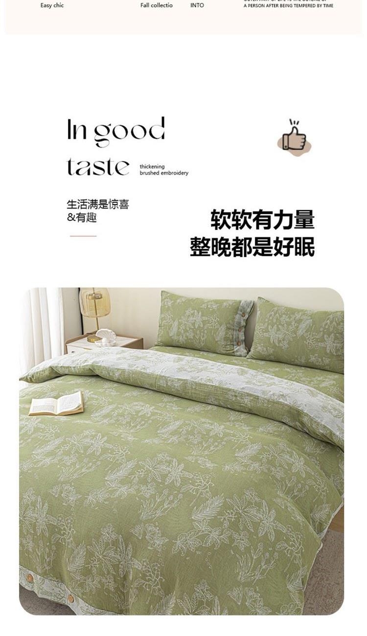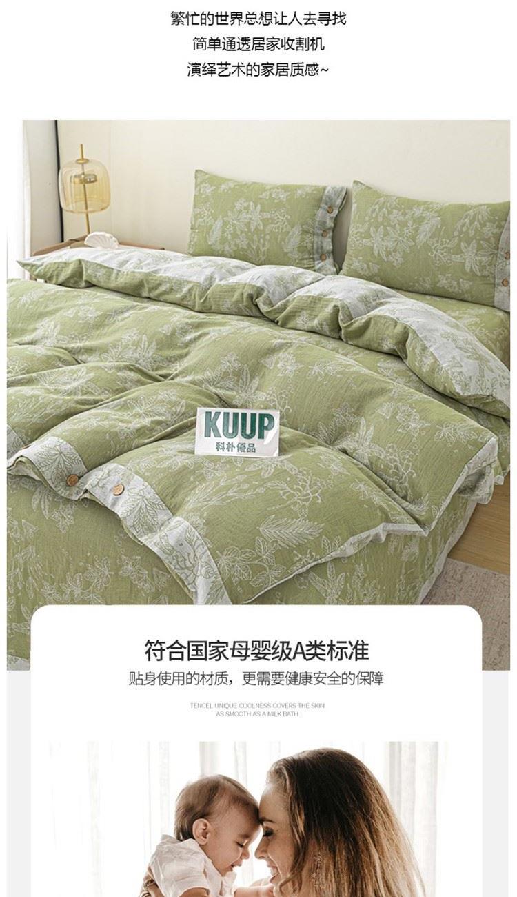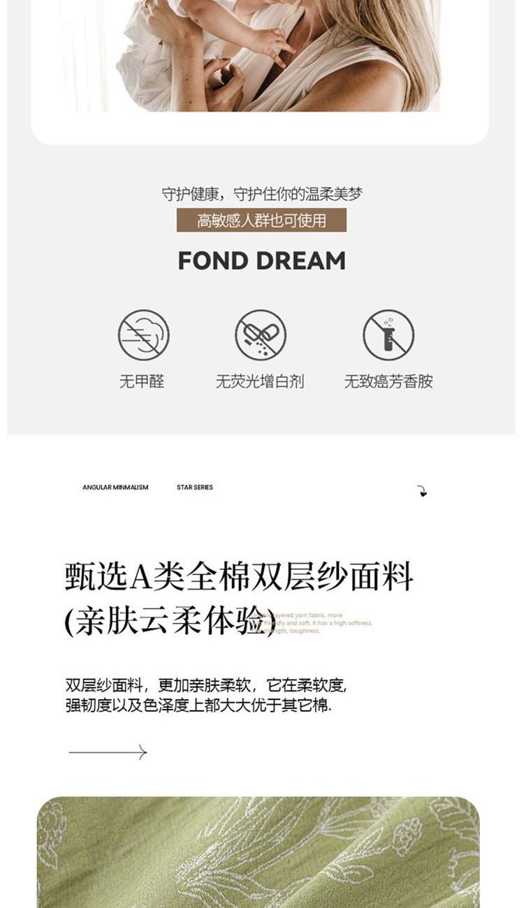 规格: 床单:230*250cm±5cm 被罩:200*230cm 枕套:48*74cmx2 面料:棉 1.纯棉双层面料,贴身的更要精挑细选 2.活性印染工艺,健康环保,无甲醛,无致癌物 3.色调清新有层次,吸湿亲肤舒适,轻薄透气,缩水率低
