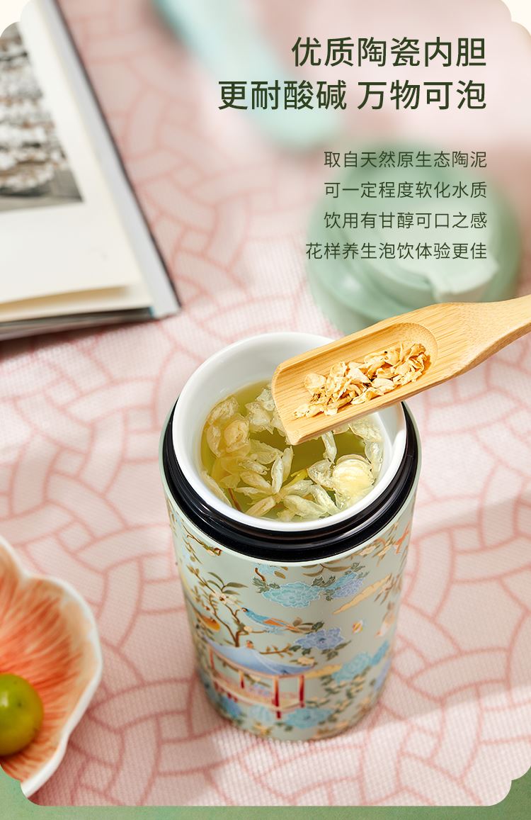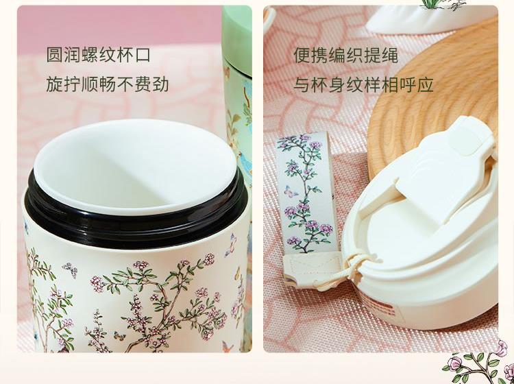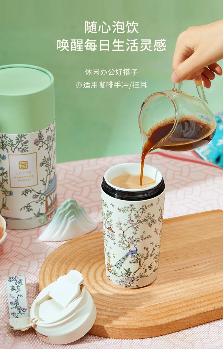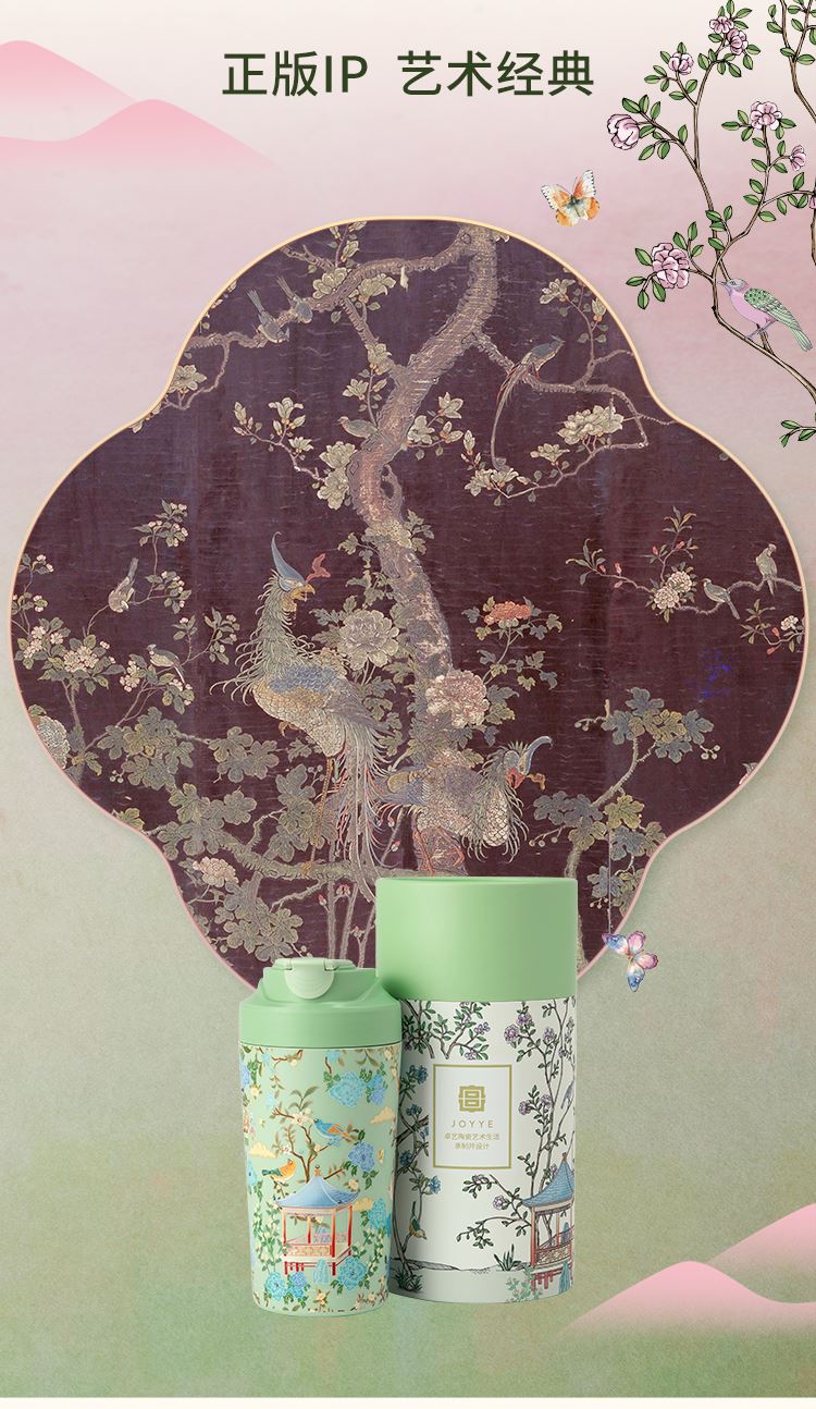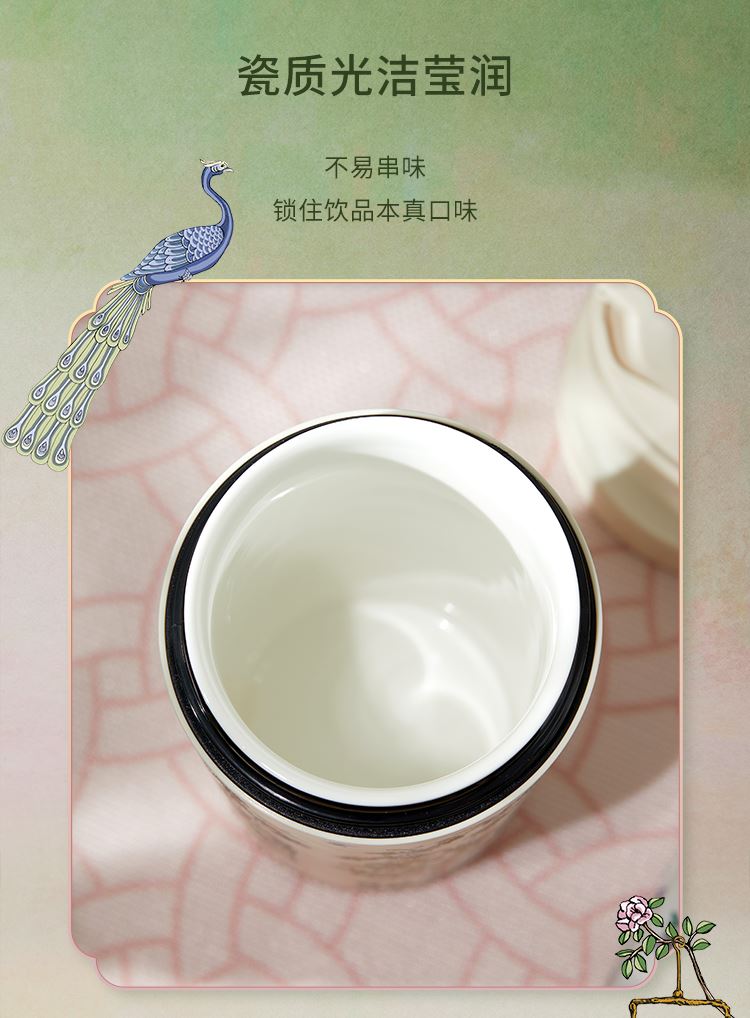 色:春山绿、梨花白 产品尺寸:8.5x9.2x18.5cm(450ml) 产品材质:陶瓷内胆:高温瓷 外壳:ABS 杯盖:PP 杯口对口位置(黑色圈):PP 产品工艺:3D打印、工艺水晶 包装方式:礼盒装(含手提袋) 产品卖点: 1. 设计源于宁寿宫花园的园林风光与故宫博物院馆藏《黑漆款彩百鸟朝凤图围屏》,礼赞故宫百年积淀的文化福泽,杯如微缩园林,举杯仿佛置身于祥瑞御花园之中。 2. 3D 打印花面,缀以工艺水晶,奢雅璀璨,礼赠价值高。 3. 真陶瓷内胆,非涂层,取自天然原生态陶泥,一定程度能有效软化水质,饮用有甘醇可口之感。 4. 食用级 PP 材质杯盖,健康安全放心用。 5. 360°密封防漏,随行装包,翻滚不洒。 6. 450ml 百搭容量,附带柔软手提绳,出行轻松便携。 7. 卡扣设计,直饮不费劲;拆洗方便,一冲即净。 8. 精美国风纹样卷筒礼盒,附带贺卡,自用收藏仪式感足,礼赠大气有质感。