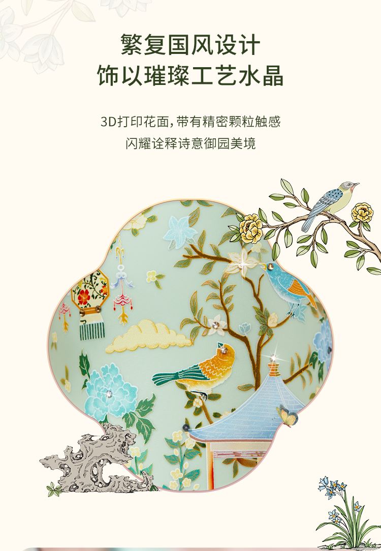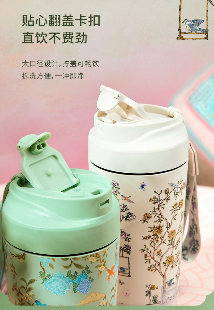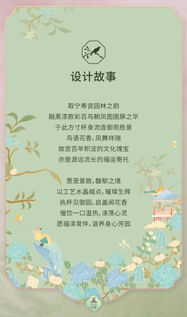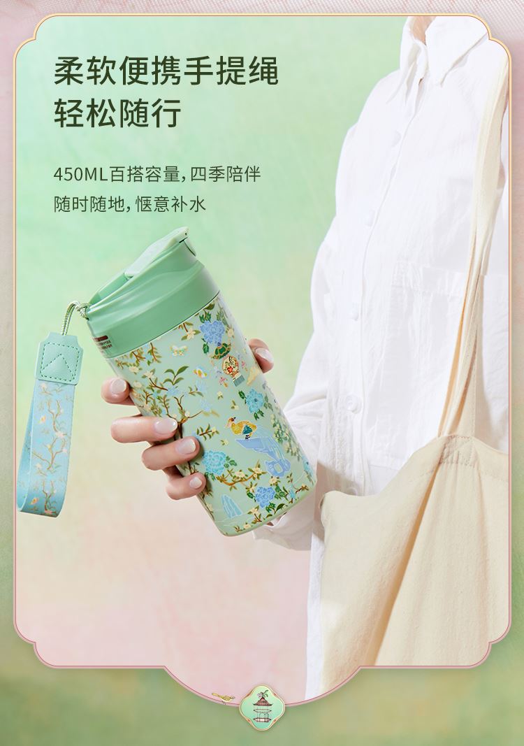色:春山绿、梨花白 产品尺寸:8.5x9.2x18.5cm(450ml) 产品材质:陶瓷内胆:高温瓷 外壳:ABS 杯盖:PP 杯口对口位置(黑色圈):PP 产品工艺:3D打印、工艺水晶 包装方式:礼盒装(含手提袋) 产品卖点: 1. 设计源于宁寿宫花园的园林风光与故宫博物院馆藏《黑漆款彩百鸟朝凤图围屏》,礼赞故宫百年积淀的文化福泽,杯如微缩园林,举杯仿佛置身于祥瑞御花园之中。 2. 3D 打印花面,缀以工艺水晶,奢雅璀璨,礼赠价值高。 3. 真陶瓷内胆,非涂层,取自天然原生态陶泥,一定程度能有效软化水质,饮用有甘醇可口之感。 4. 食用级 PP 材质杯盖,健康安全放心用。 5. 360°密封防漏,随行装包,翻滚不洒。 6. 450ml 百搭容量,附带柔软手提绳,出行轻松便携。 7. 卡扣设计,直饮不费劲;拆洗方便,一冲即净。 8. 精美国风纹样卷筒礼盒,附带贺卡,自用收藏仪式感足,礼赠大气有质感。