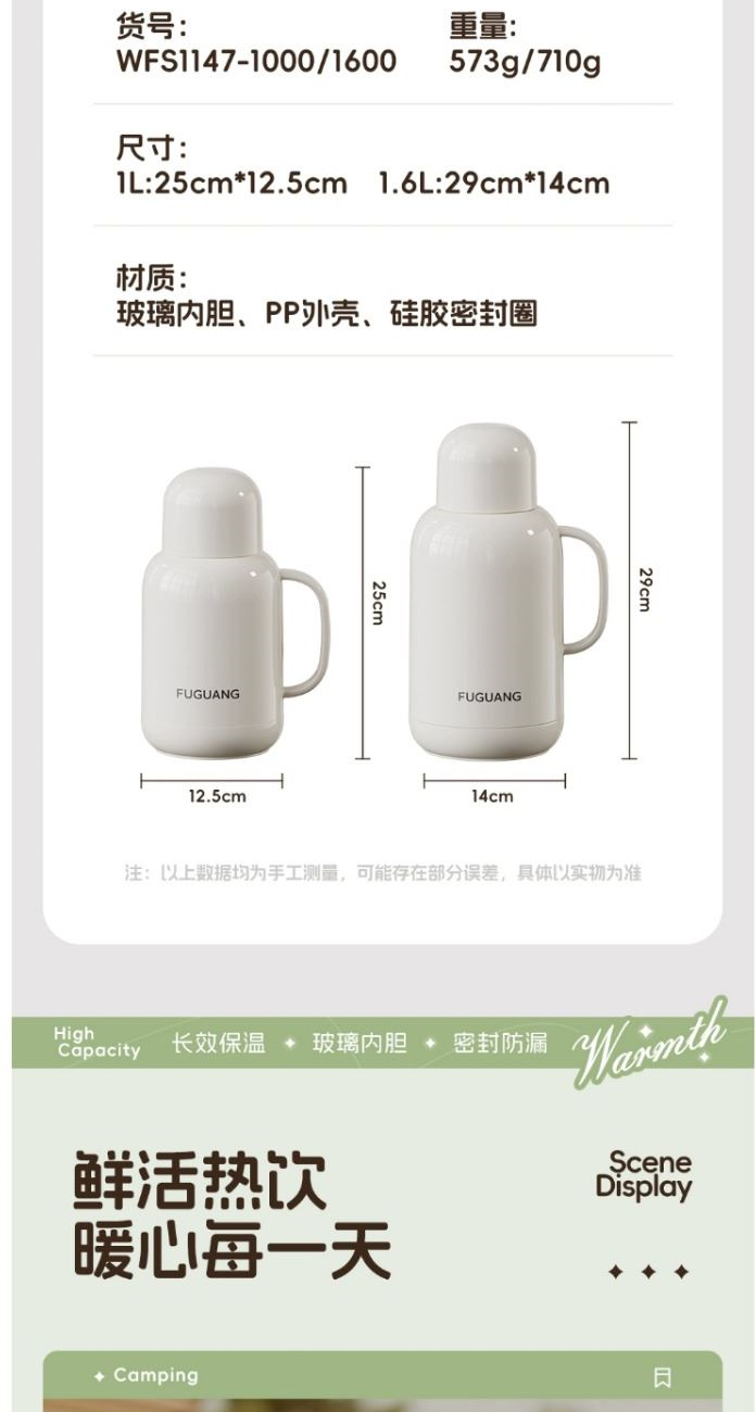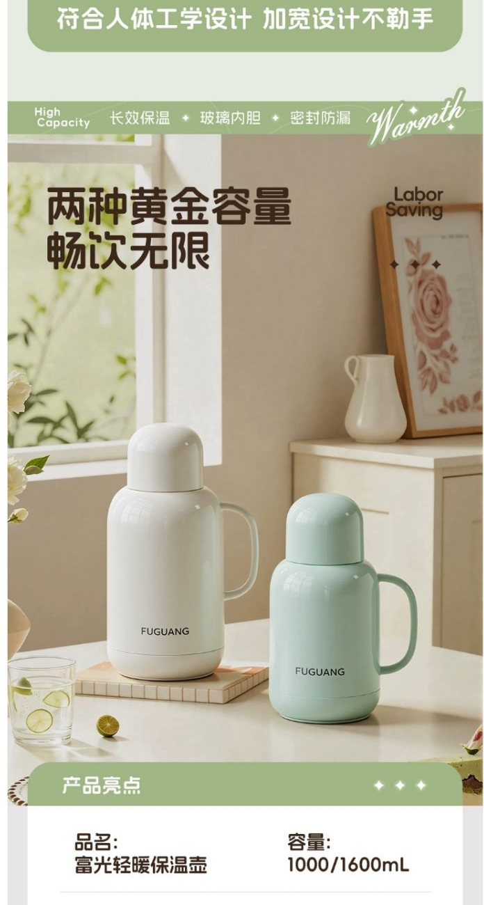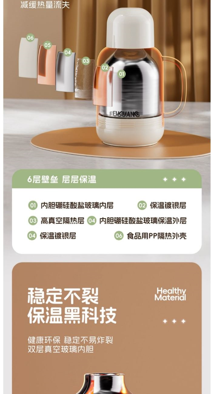 颜色:绿色 白色 红色 尺寸:12.5*25 材质:食品级PP壶身外壳,高硼硅红胆玻璃内胆,食品接触用硅胶圈。 真空夹层,增强保温效果。 一体式把手,人体工学设计,宽厚省力,防滑底垫放置更稳不易倾斜。 包装:单瓦盒