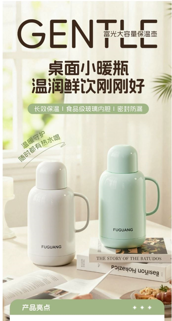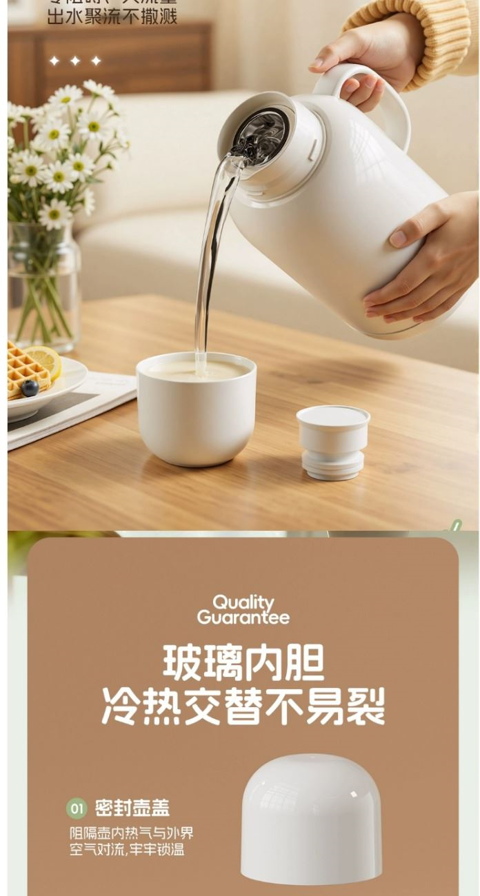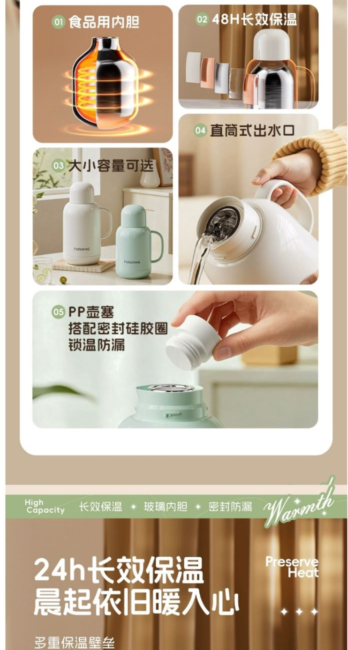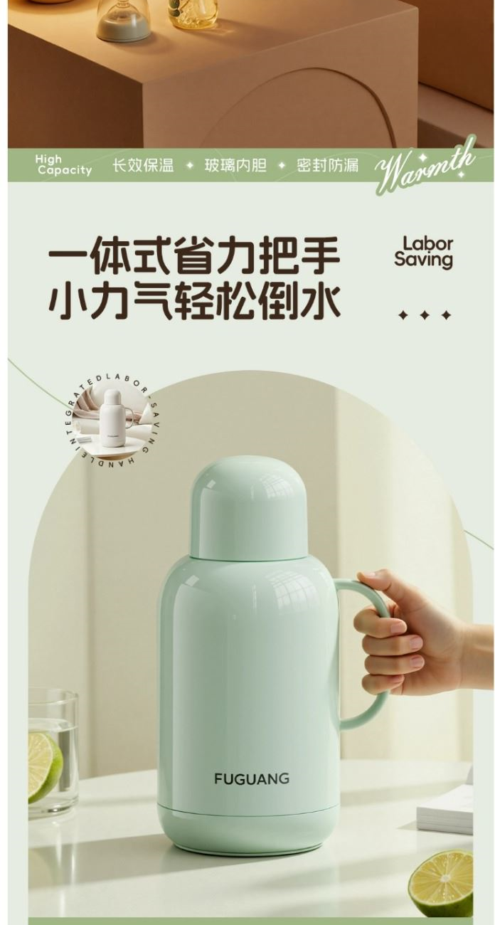 颜色:绿色 白色 红色 尺寸:12.5*25 材质:食品级PP壶身外壳,高硼硅红胆玻璃内胆,食品接触用硅胶圈。 真空夹层,增强保温效果。 一体式把手,人体工学设计,宽厚省力,防滑底垫放置更稳不易倾斜。 包装:单瓦盒