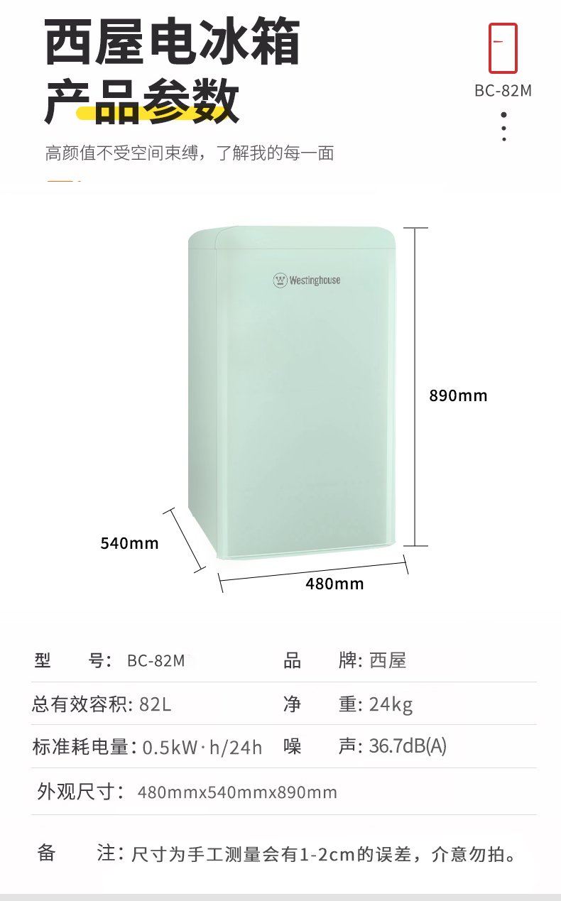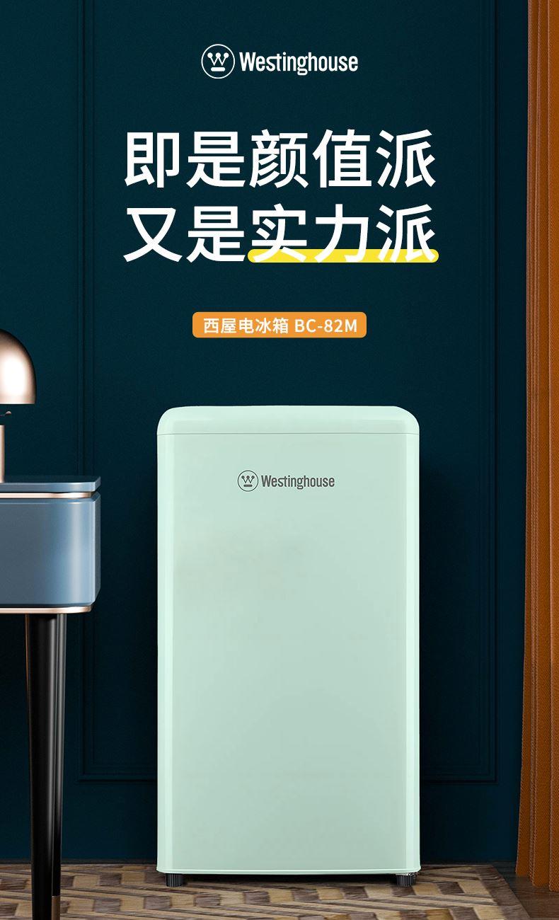 复古外观设计、单门双温 PCM彩钢门、优美弧线 低噪节能(优质压缩机、38分贝低音) 0.26㎡占地面积,小身材